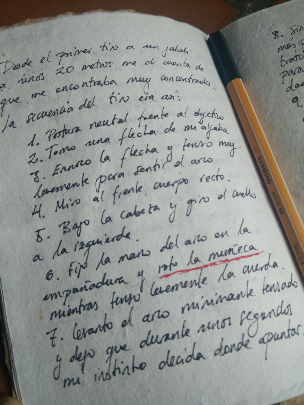 Así que volví a coger el diario que escribo aparte de este blog y donde voy dejando registro de lo que voy haciendo con sugerencias y correcciones y subrayé en rojo una frase en particular de algo que escribí hace ya varias semanas sobre mi secuencia de tiro.