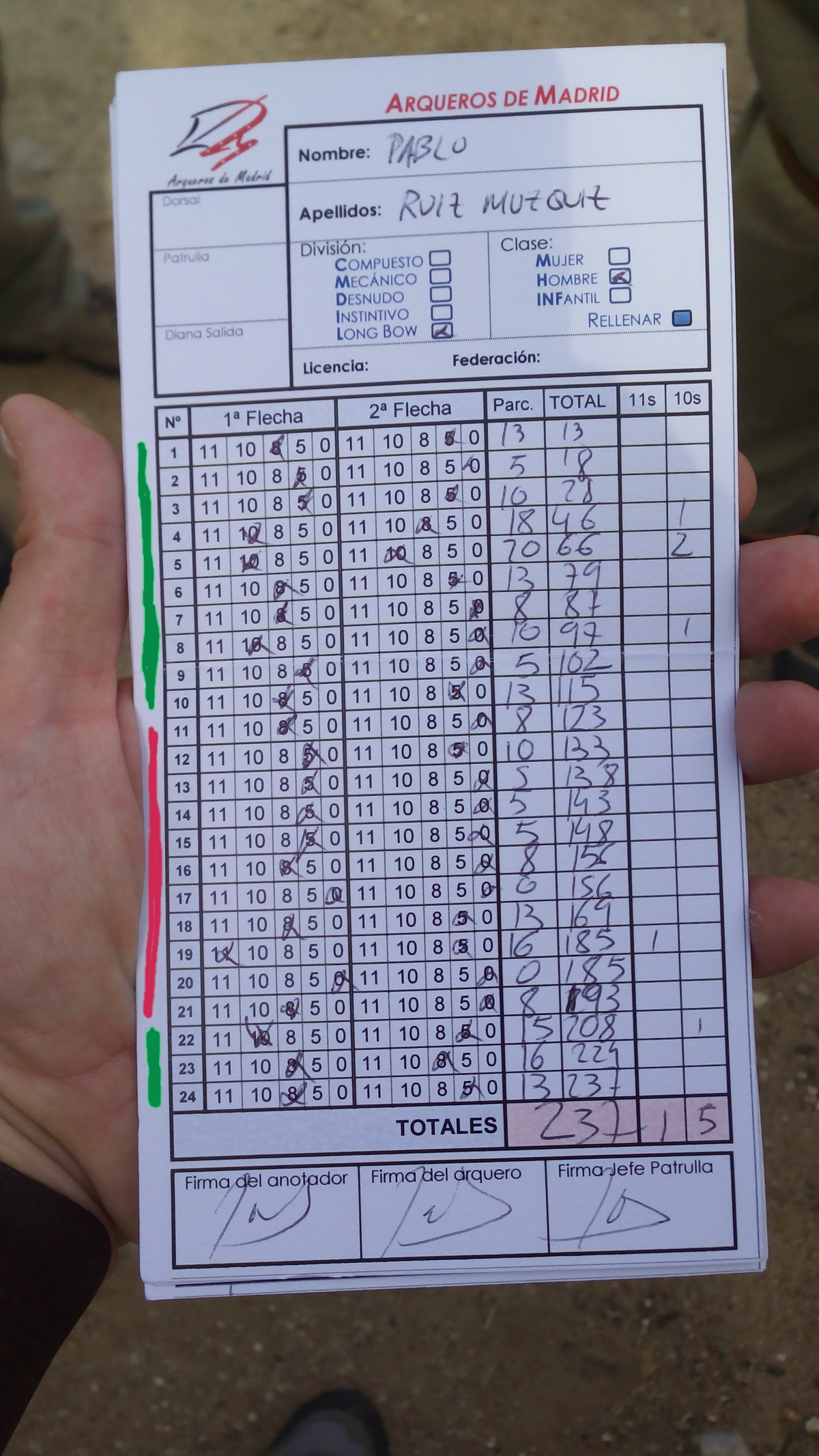Yo iba con buenas sensaciones pero con algo de respeto por tirar en una competición, aunque sea una tirada social del club. A veces los nervios juegan malas pasadas y un poco me pasó eso pero estoy contento porque voy descubriéndome los fallos y aprendiendo a detectarlos correctamente y a corregirlos sobre la marcha en una tirada, lo cual es signo de que hay una buena base a la que uno siempre puede recurrir cuando la cosa empieza a ir cuesta abajo.