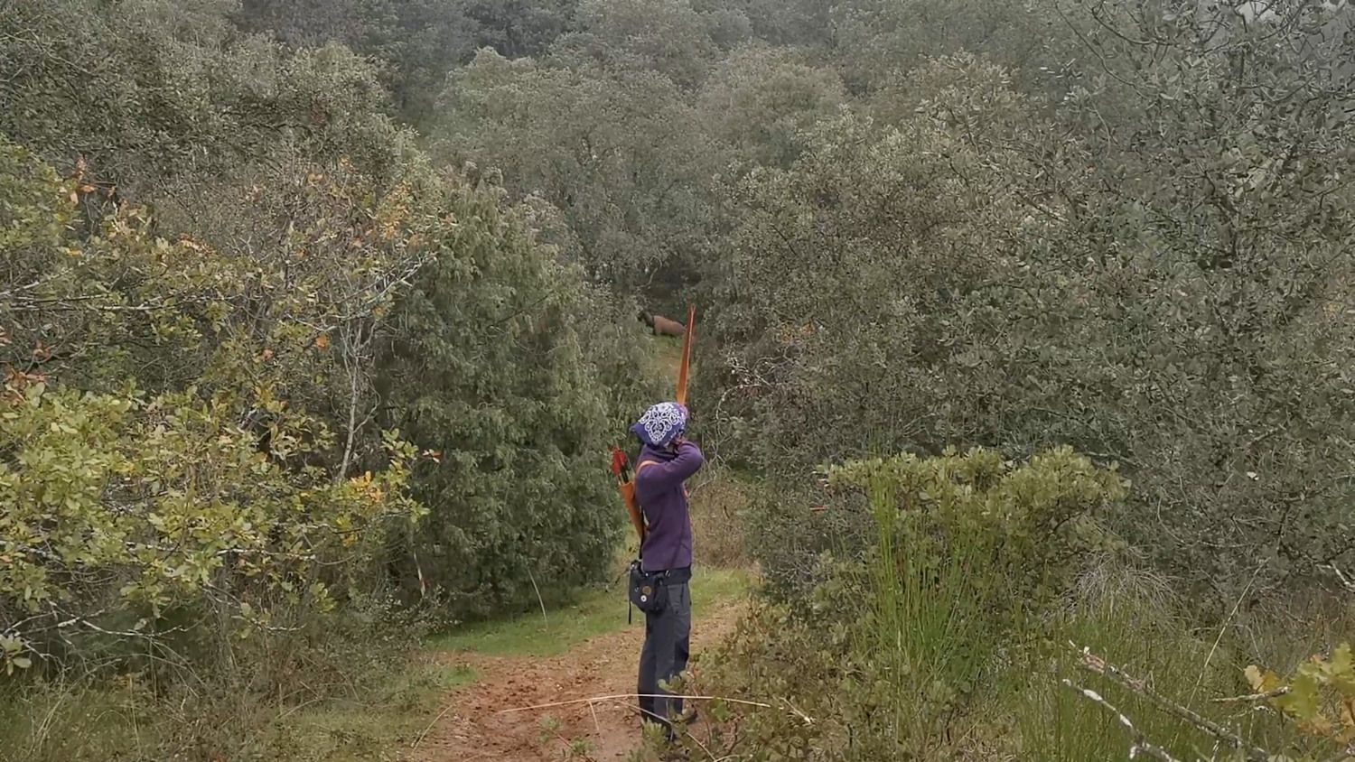 - Recorrido de bosque desde la piqueta más cercana. El arquero se coloca en la piqueta, encoca la flecha, agarra bien el arco y la cuerda, reparte bien el peso y fija las caderas, levanta el arco y lo presenta hacia la diana, abre el arco y fija el anclaje para a continuación cerrar los ojos. El objetivo es no moverse en absoluto para tener la certeza de que la flecha sigue en la diana. Realizar la parte de la rutina mental repitiendo el objetivo mental para que la suelta sorprenda al arquero mientras siente el gesto del tiro. No hay prisa por abrir los ojos para ver el resultado. Acabar el tiro quedándose un par de segundos en la posición final antes de abrir los ojos. Tras comprobar el resultado realizar la segunda flecha con los ojos abiertos tratando de ser igual de meticuloso.