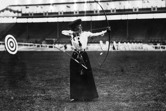 El tiro con arco olímpico se estrenó en la segunda edición de París 1900, contando solo con categoría masculina, en la que participaron 129 franceses, 18 belgas y 6 holandeses. A pesar de su popularidad en Reino Unido, no hubo arqueros de esta nacionalidad en esta edición. La razón es que los Juegos aún no tenían el prestigio que tienen hoy, y eran más importantes los torneos nacionales, que se celebraban en una fecha muy próxima. La tercera edición de 1904 viajó hasta Estados Unidos, en Saint Louis, Missouri. El largo viaje desde Europa provocó que solo participasen arqueros estadounidenses, pero como contrapunto, fue donde se estrenó la categoría femenina. 23 hombres y 6 mujeres, de las que Matilda Howell fue la primera campeona olímpica de este deporte, oro en las dos categorías individuales y en la de equipos. Fue una brillante arquera, cuyo interés comenzó hacia 1878 gracias a los artículos del ya mencionado Maurice Thompson, que consiguió varios títulos regionales de Ohio y se proclamó campeona nacional de Estados Unidos en 17 ocasiones.