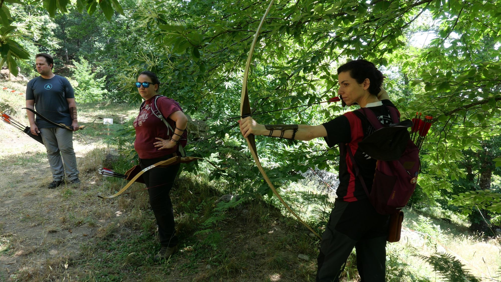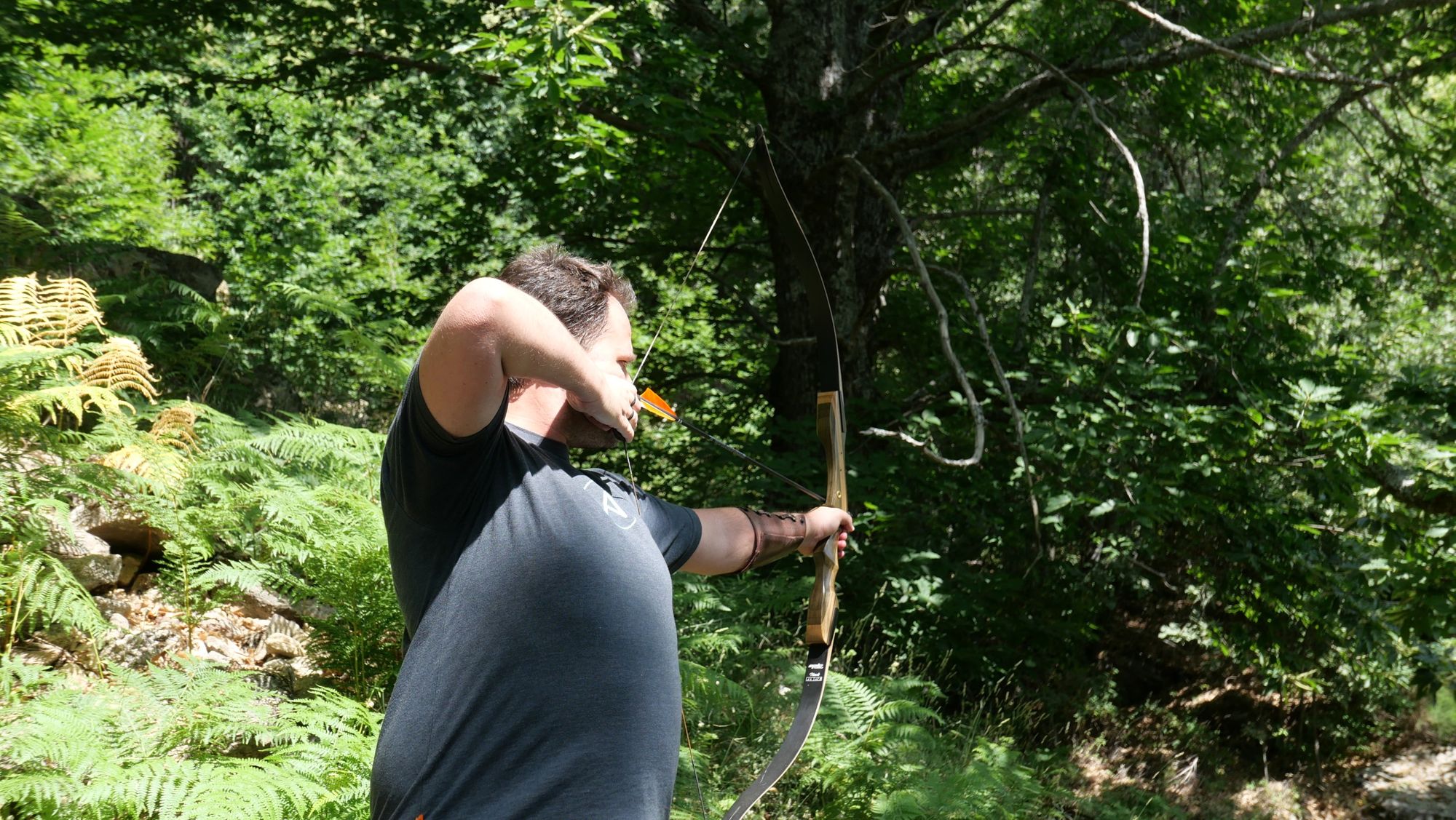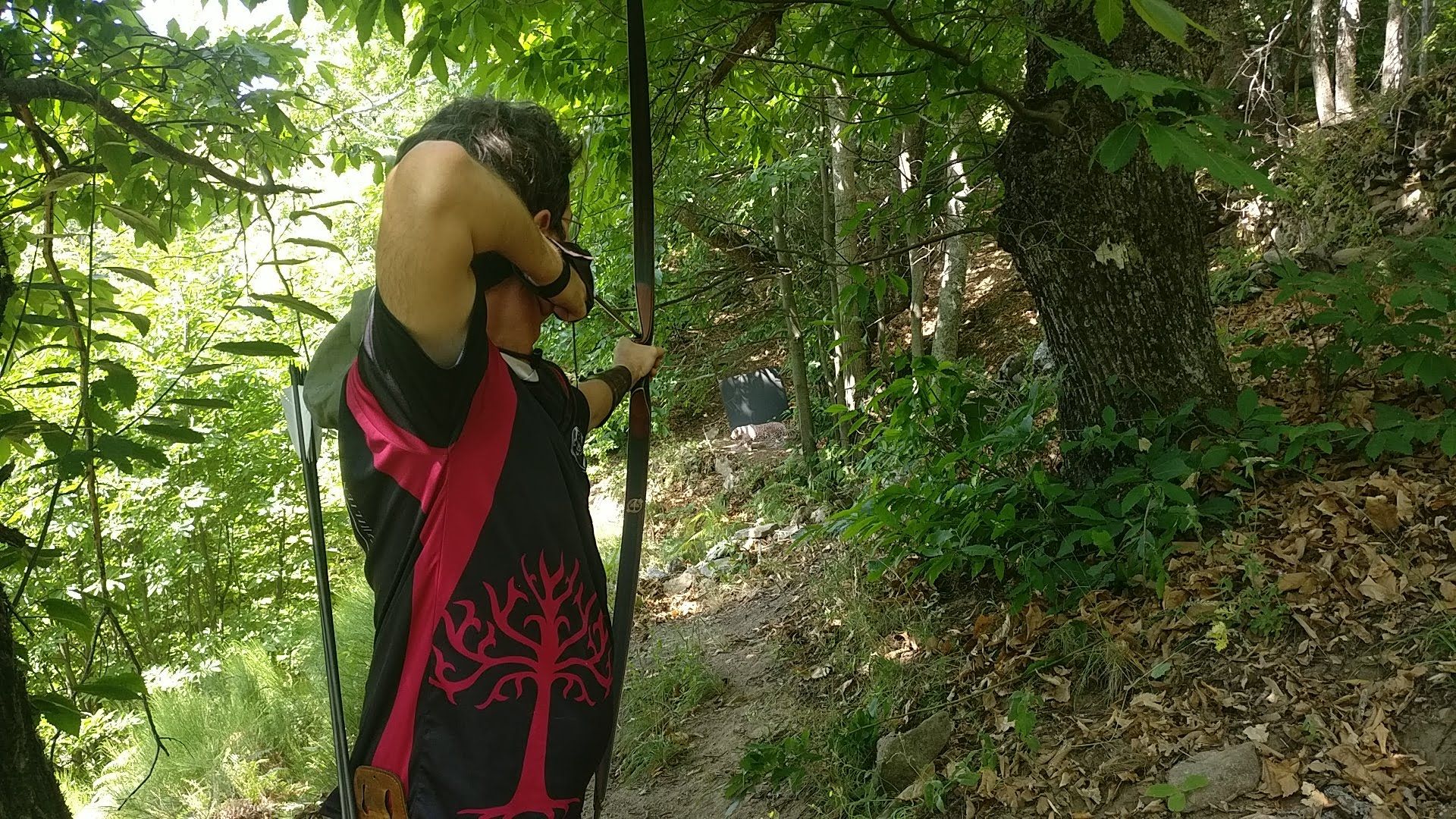 Solo llegar al refugio/albergue de montaña que servía de campamento base ya nos dejó muy claro que estábamos ante un lugar muy especial. Árboles centenarios, fundamentalmente castaños, creaban una atmósfera umbría y relativamente fresca que nos hizo olvidarnos inmediatamente de la ola de calor que se vivía fuera. Estábamos en un bosque, éramos arqueros de bosque. Gonzalo nos contó que ese terreno pertenecía a él y su familia desde hacía mucho tiempo y que por su afición al tiro con arco había llegado al proyecto de crear un campo de tiro privado para su disfrute. Una cosa había llevado a la otra, sus amistades también se interesaron por el proyecto y finalmente el campo ha quedado abierto al público en general, siempre que no tires con arco de poleas, ya que el campo se ha concebido por distancias y dianas para arcos de menos libras.