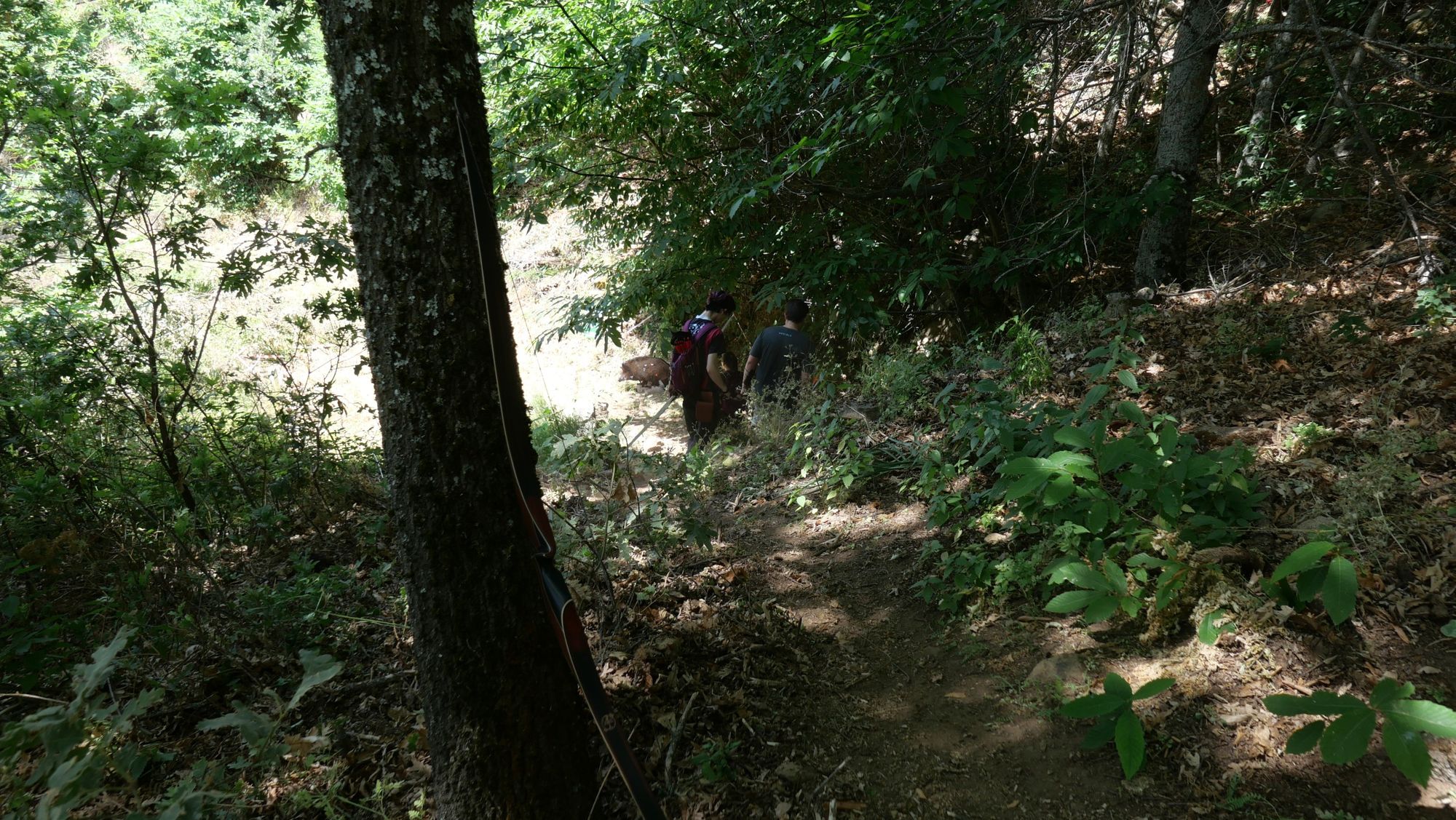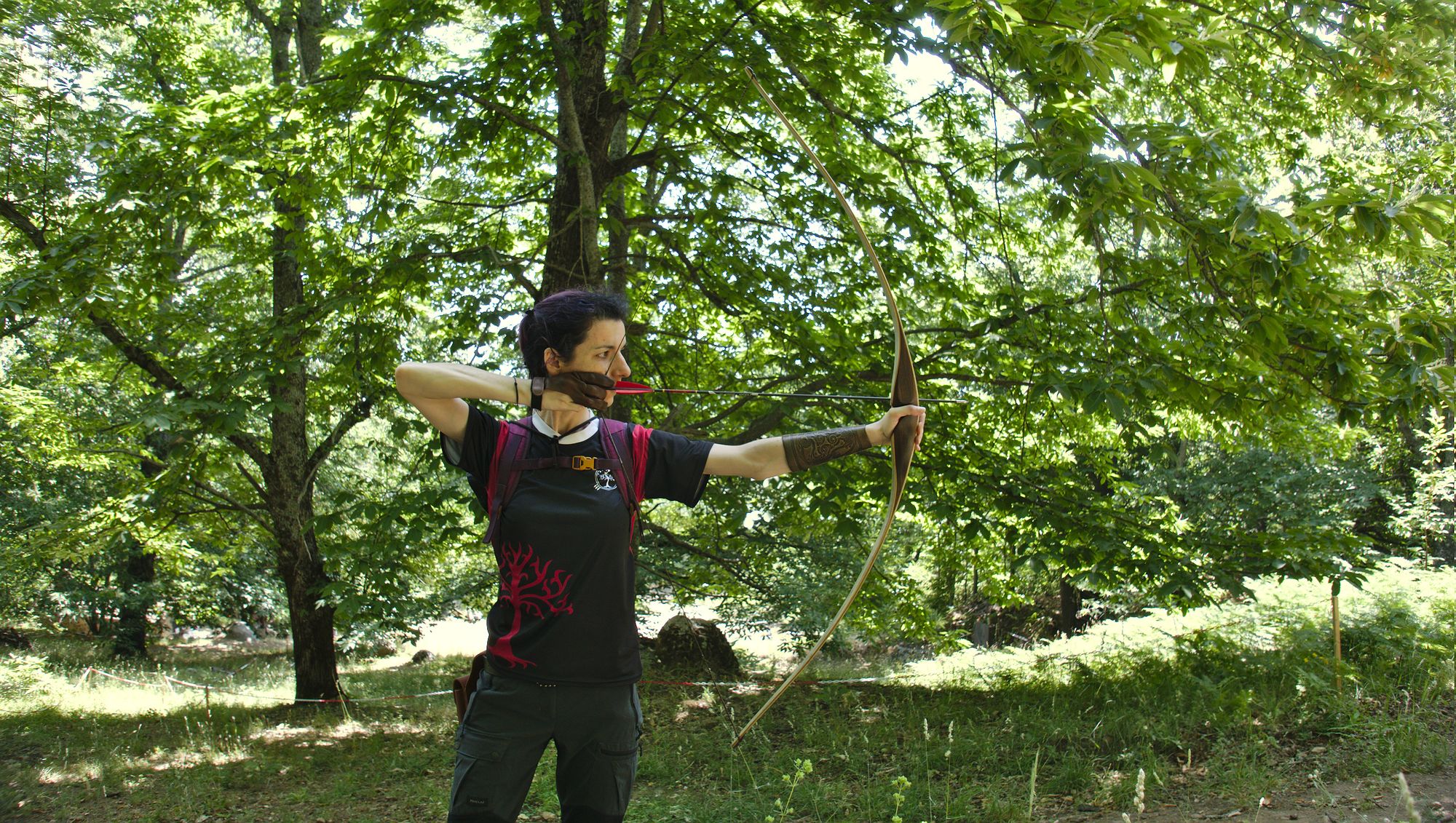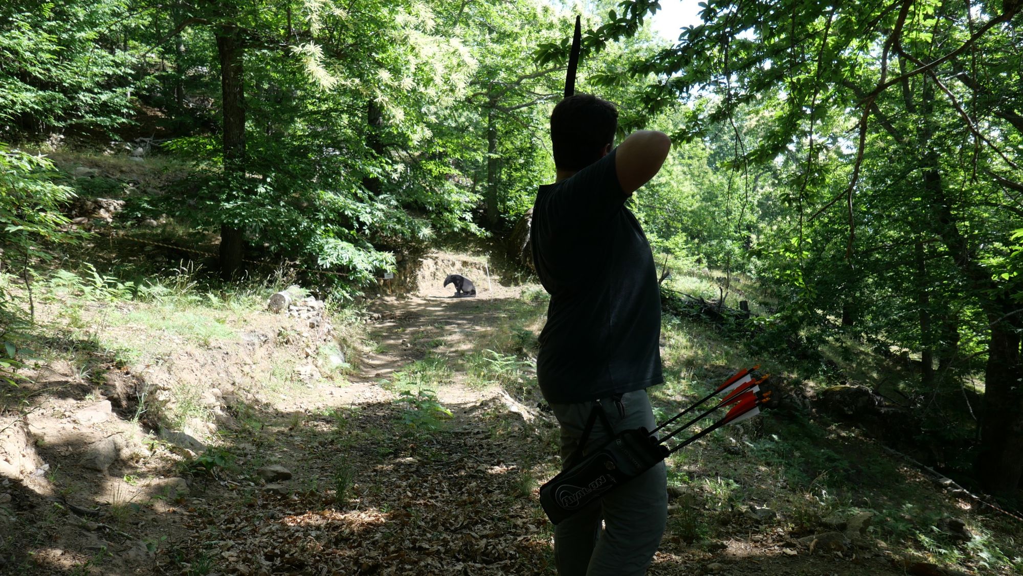 Solo llegar al refugio/albergue de montaña que servía de campamento base ya nos dejó muy claro que estábamos ante un lugar muy especial. Árboles centenarios, fundamentalmente castaños, creaban una atmósfera umbría y relativamente fresca que nos hizo olvidarnos inmediatamente de la ola de calor que se vivía fuera. Estábamos en un bosque, éramos arqueros de bosque. Gonzalo nos contó que ese terreno pertenecía a él y su familia desde hacía mucho tiempo y que por su afición al tiro con arco había llegado al proyecto de crear un campo de tiro privado para su disfrute. Una cosa había llevado a la otra, sus amistades también se interesaron por el proyecto y finalmente el campo ha quedado abierto al público en general, siempre que no tires con arco de poleas, ya que el campo se ha concebido por distancias y dianas para arcos de menos libras.
