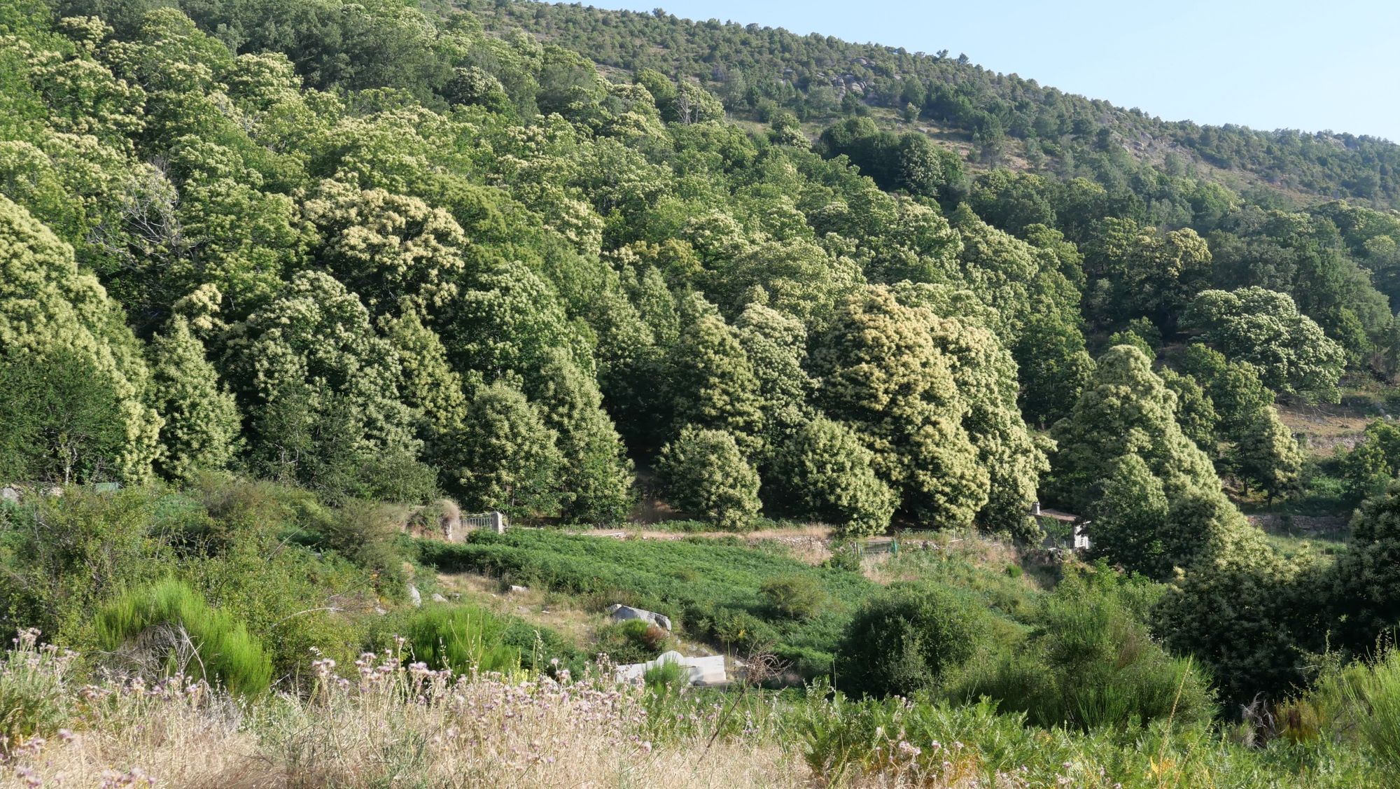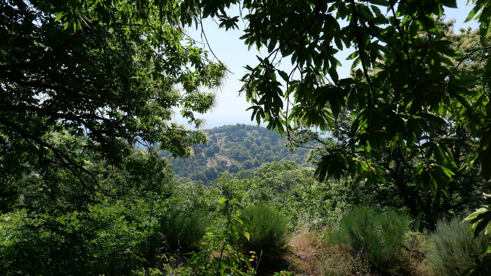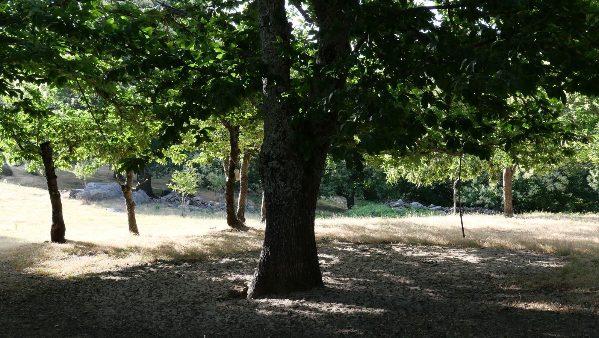 Pero cuando llegamos y aparcamos y salimos a saludarlos en condiciones, ya éramos plenamente conscientes de que el entorno natural era muy especial por la presencia sobre todo de castaños pero también de enebrales, robles y encinas. La luz de la tarde a esa hora no hacía más que resaltar la gama de verdes del castañar mientras que de lejos se oía el murmullo del agua proveniente de una fuente cercana. Gonzalo y Esther nos dedicaron aún un poco de su tiempo para mostrarnos el campo.