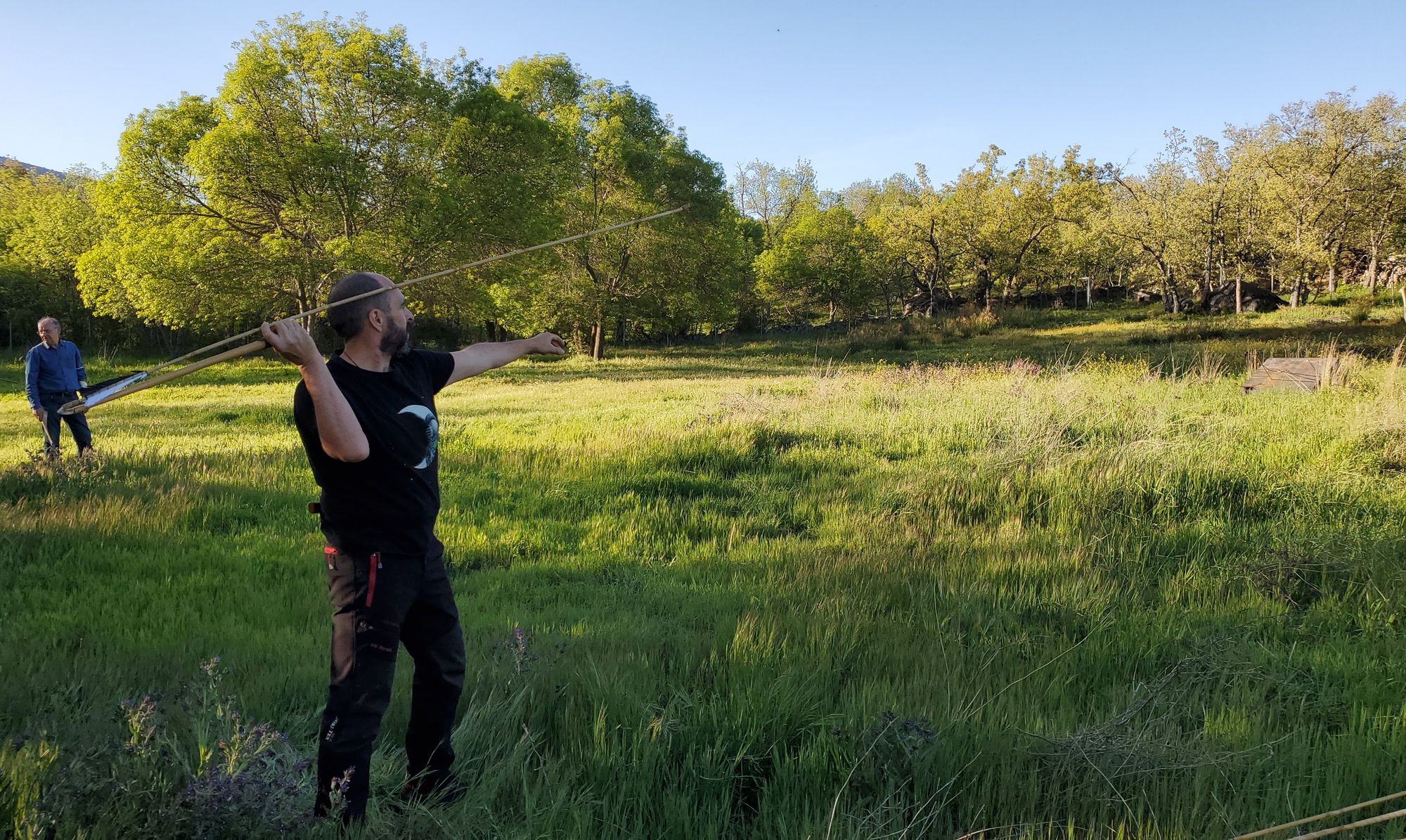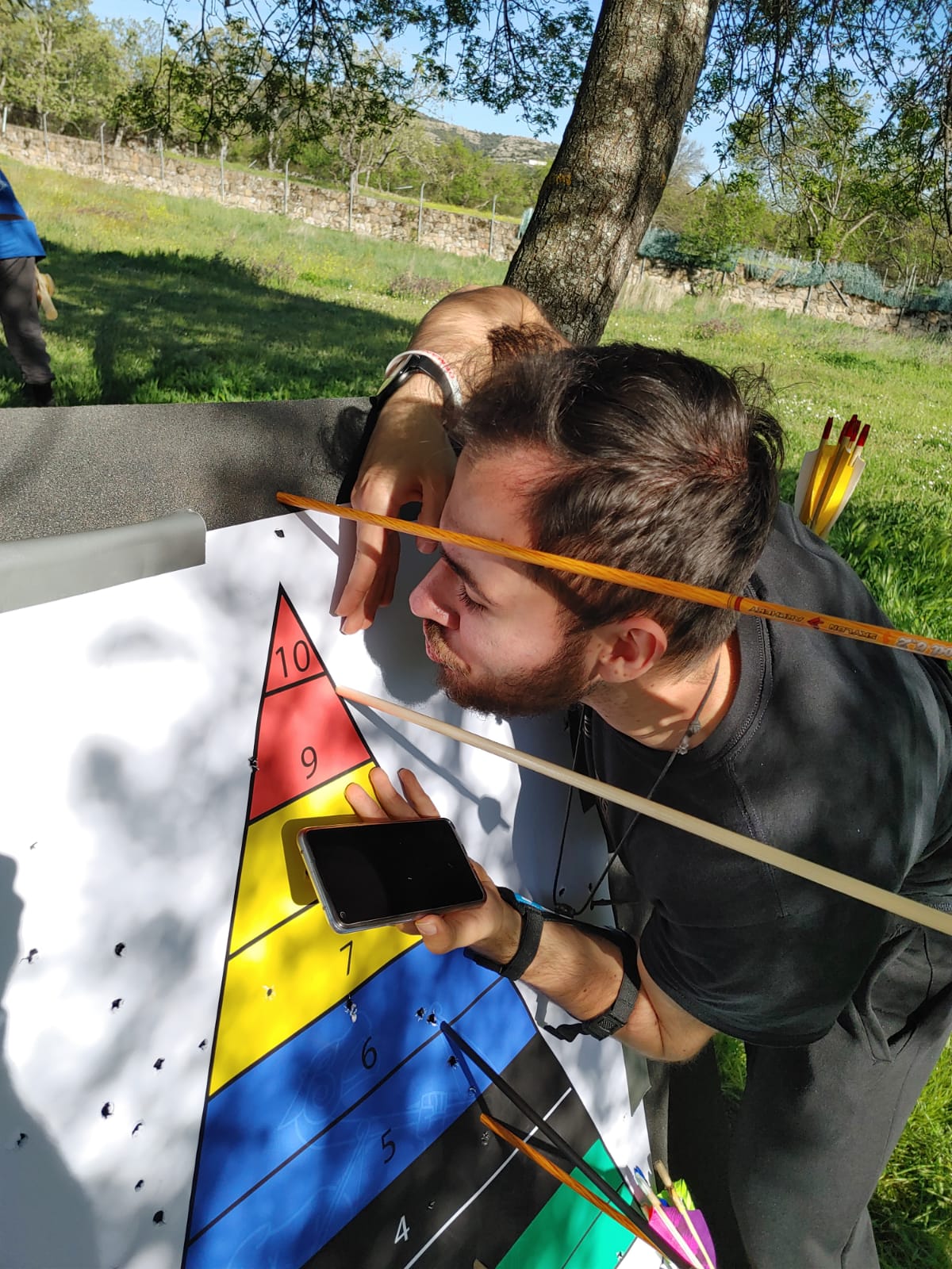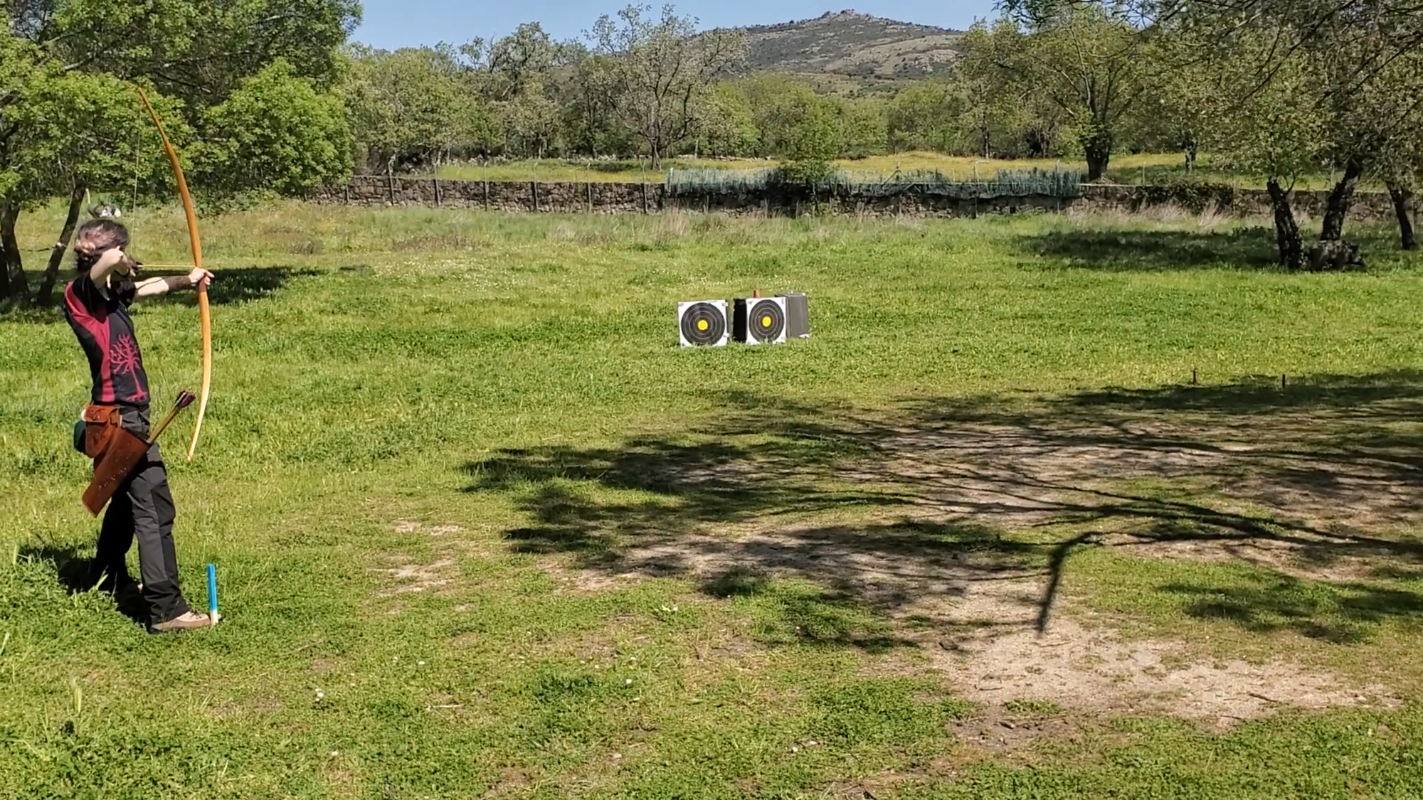 Homenajeando a un tiro clásico medieval inglés, había una línea de tiro y a unos 60-70 metros una estaca con una cuerda con tres nudos marcando tres distancias con tres puntuaciones diferentes. Tras una ronda de flechas, el grupo de arqueros se acercaba y anotábamos los puntos en función de cómo la cuerda "barría" radialmente en torno a la estaca a la que estaba anclada cada flecha. Obviamente, la mayoría se quedaban fuera de los 3 metros máximos pero unas cuantas cayeron dentro de la distancia reglada y una, de Ismael Hernández, disfrutó del máximo honor a dejar su flecha a escasos 30cm de la estaca.