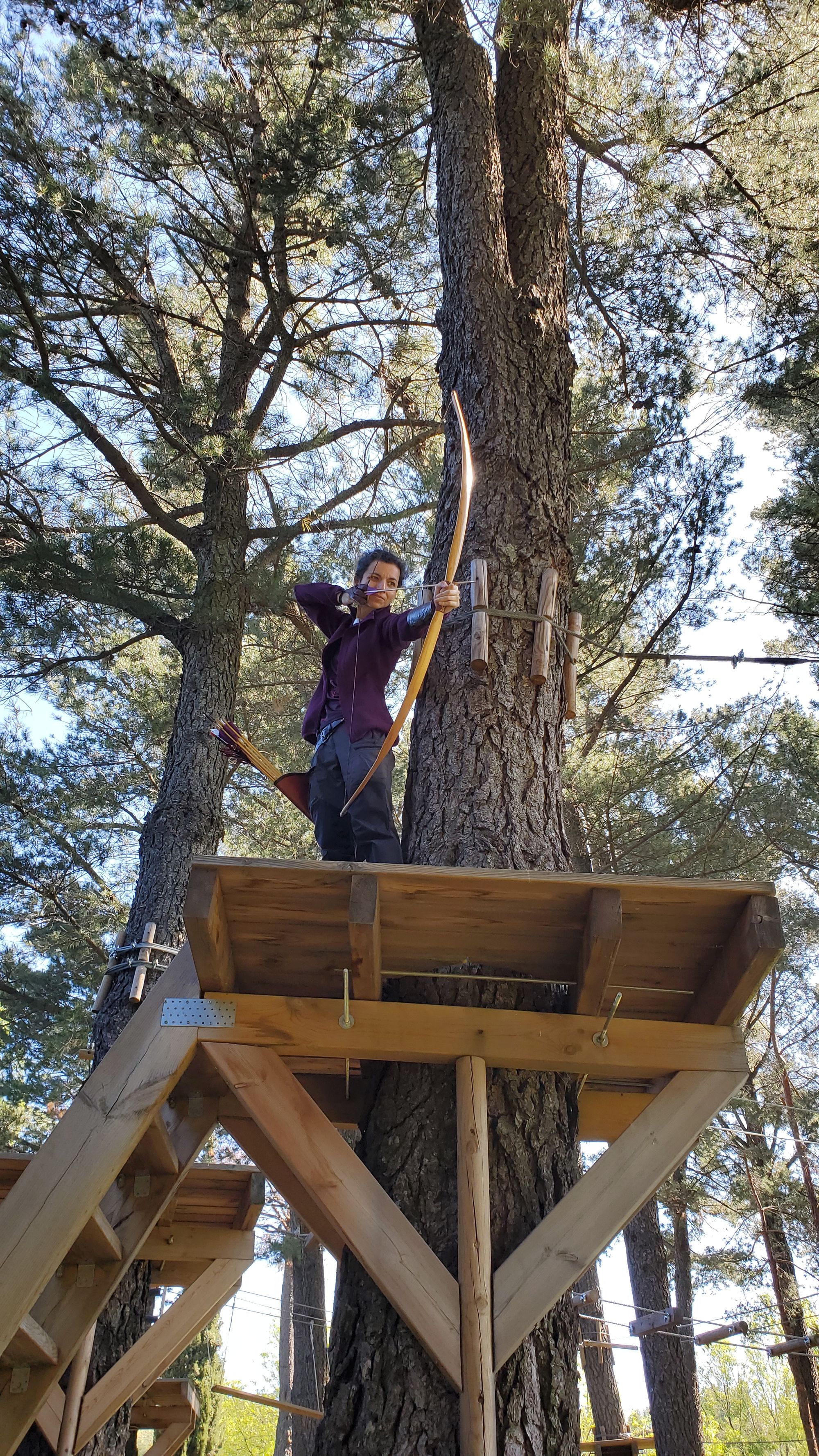 Esta prueba, homenaje a la tradición arquera francesa, es de las más difíciles que conozco. Obliga a la persona a retorcerse de tal forma que manteniendo cierta técnica pueda tirar una flecha casi completamente vertical a un objeto del tamaño de un puño cerrado sin apenas referencias de distancia (miras arriba al cielo y te parecen 6 metros como te parecen 15 metros).