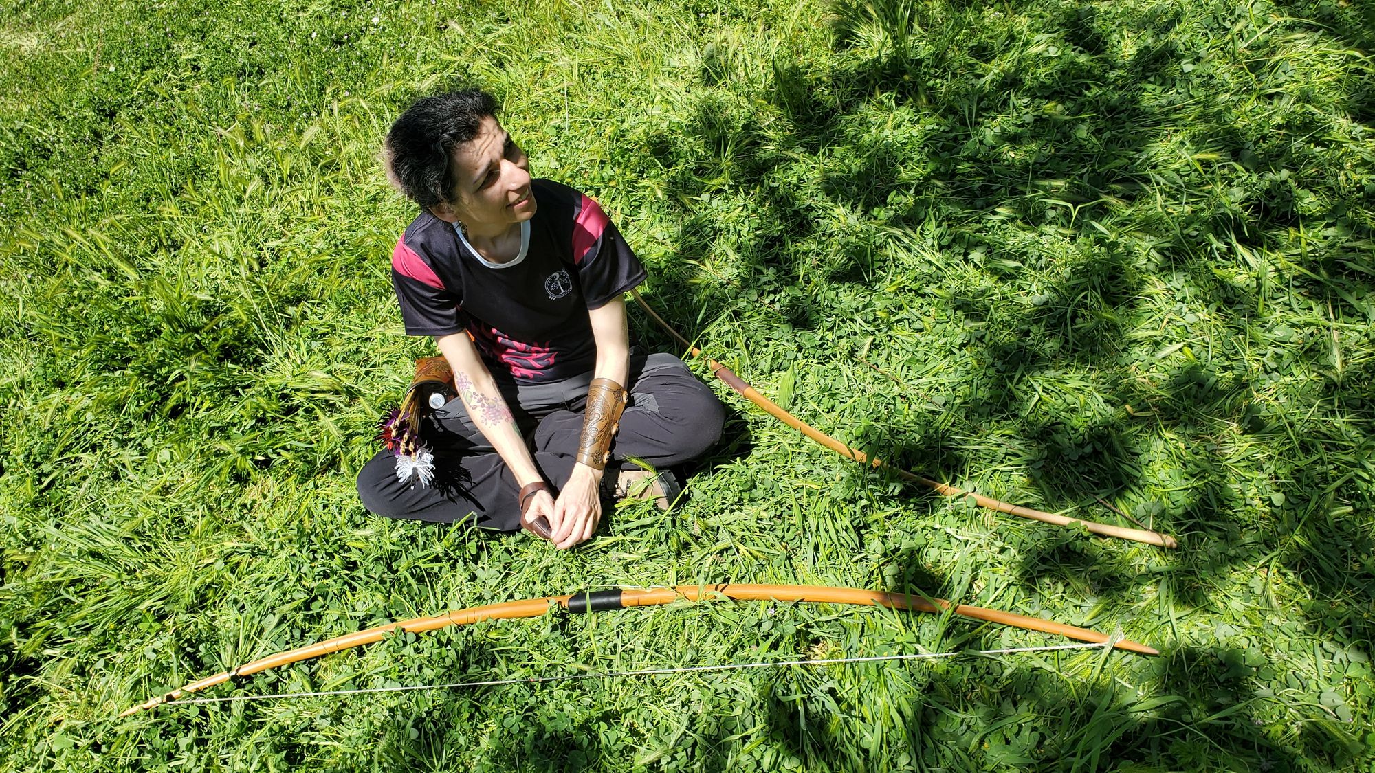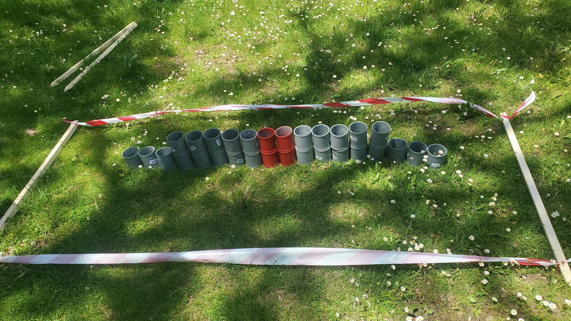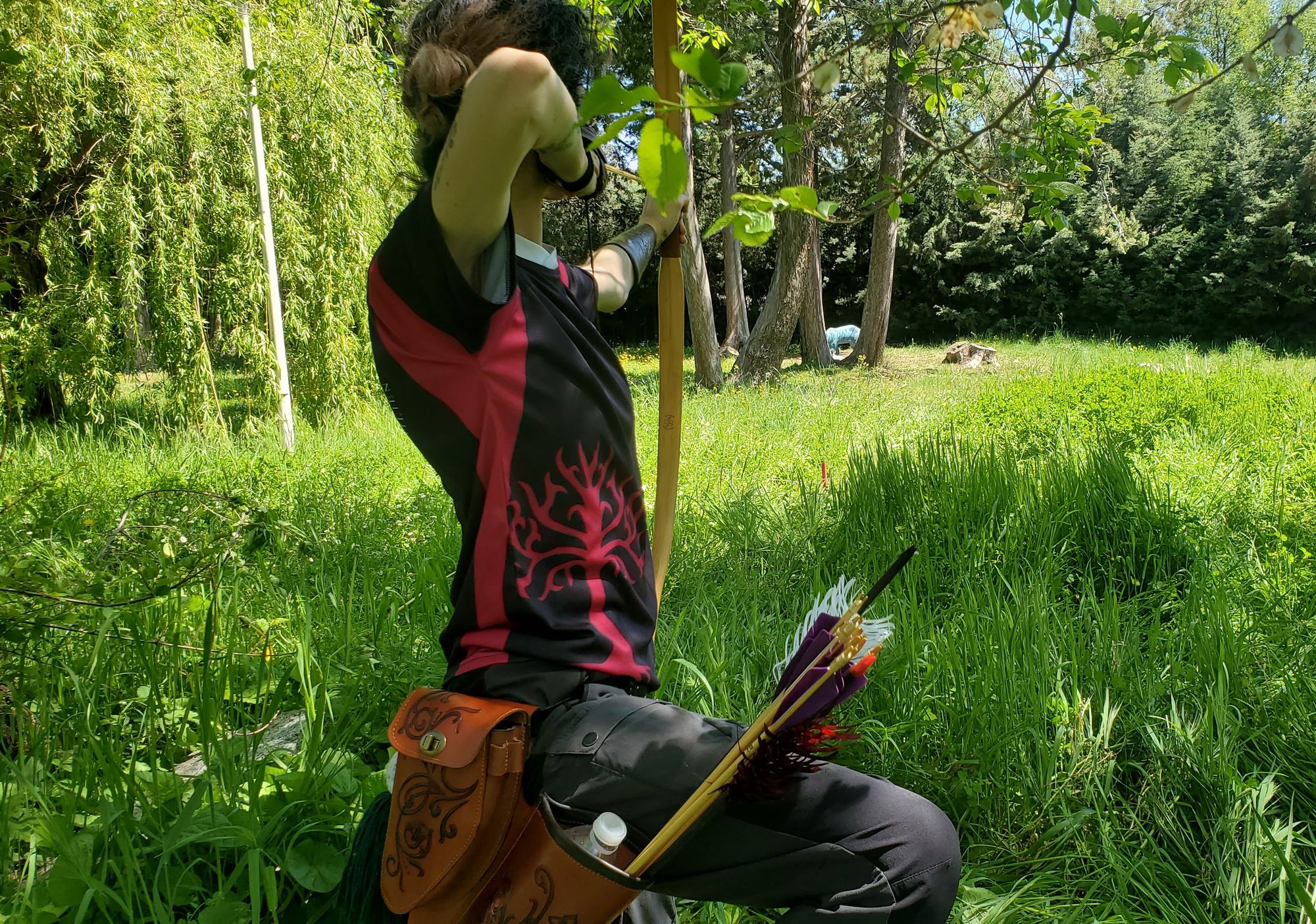 En ausencia de caballo se pedía a los participantes que salieran corriendo a una señal y se pararan con las piernas separadas y los pies tocando sendas estacas en el suelo simulando la anchura de la silla de montar antes de disparar una flecha hacia cada diana. Añadimos unos cocos para un muy monty pythoniano atrezzo sonoro.