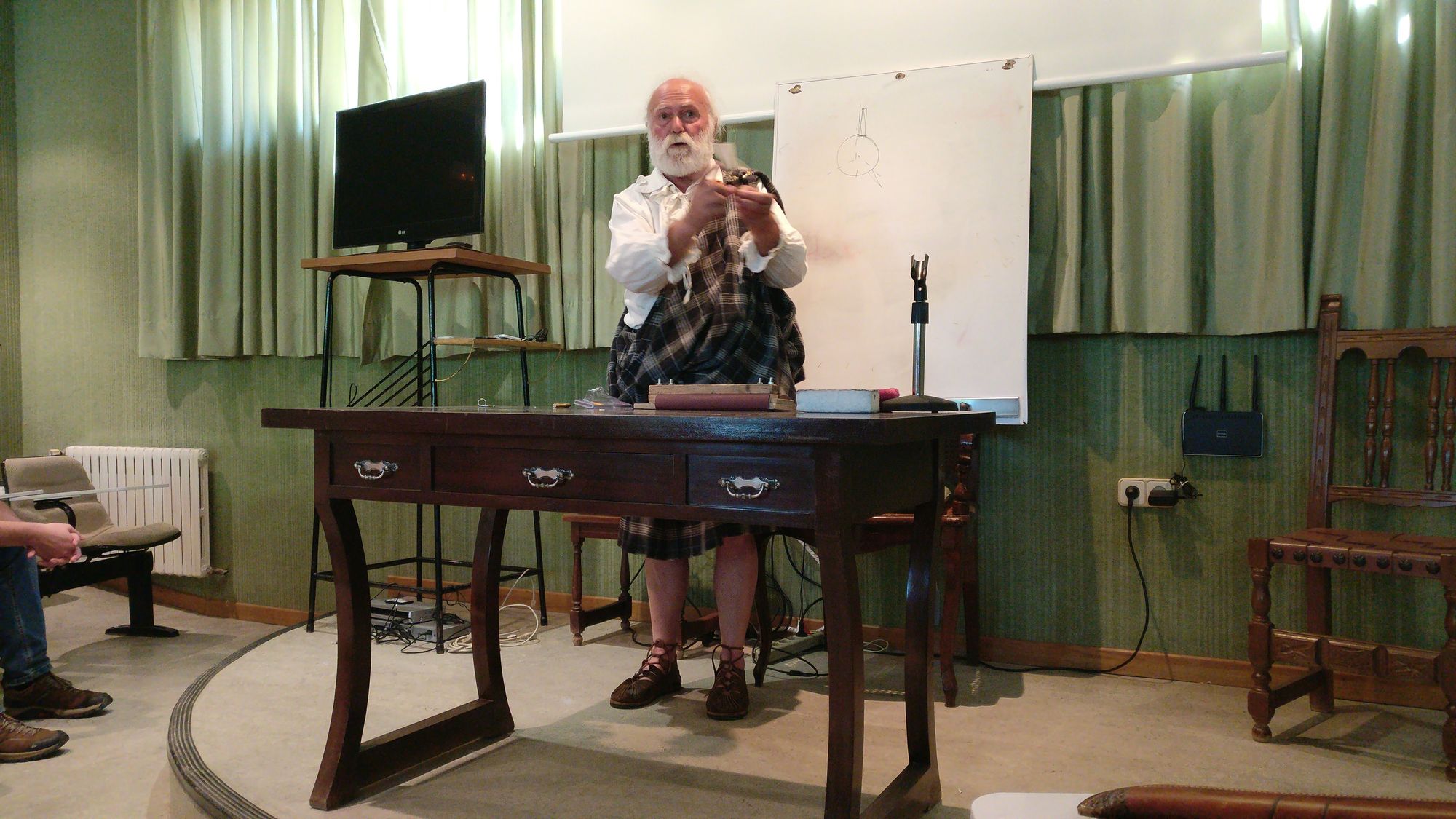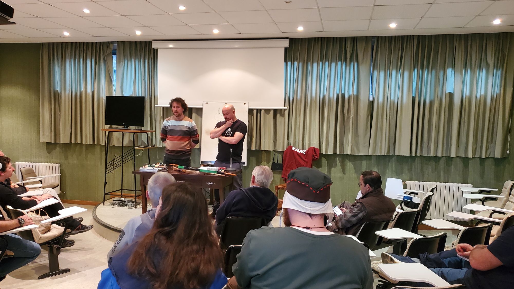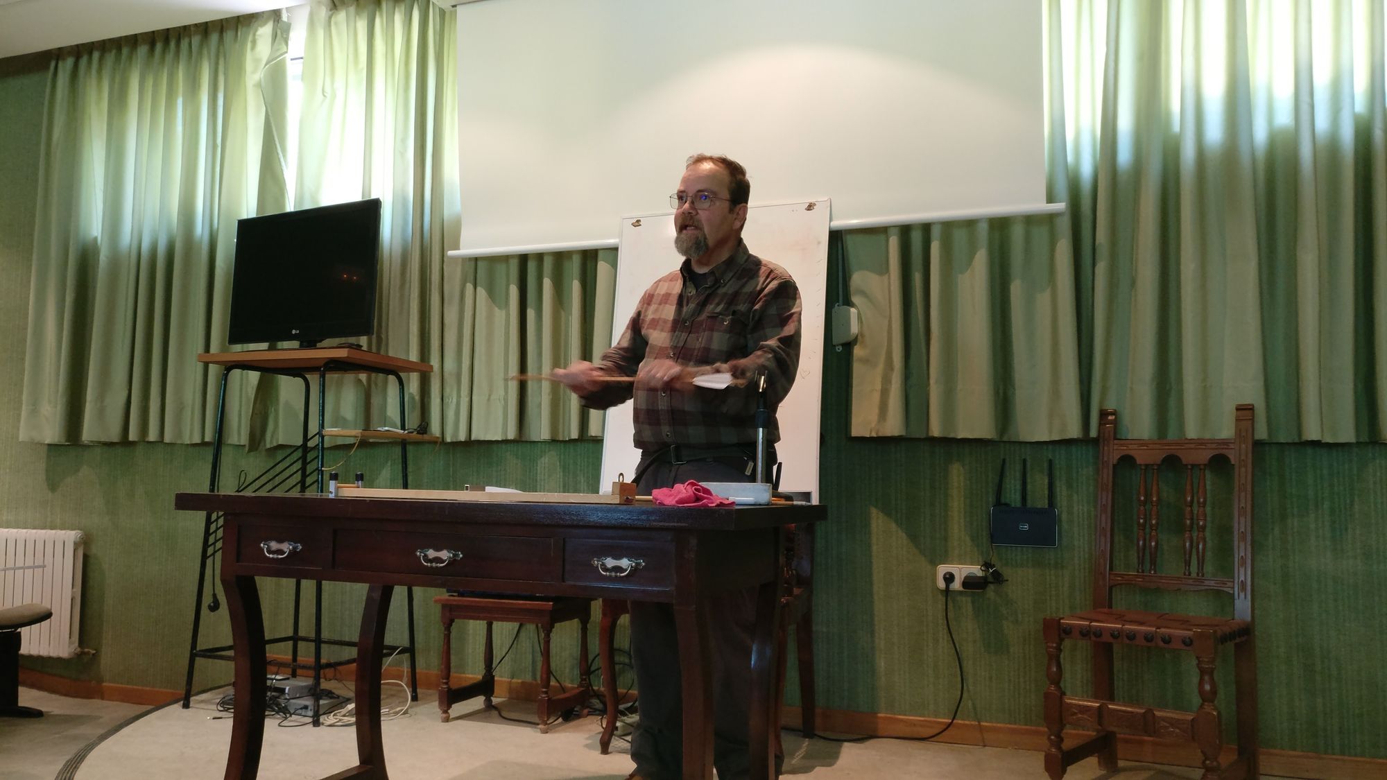 Tras los cafés Javier Gamboa dio una charla muy interesante sobre los principios del spine de una flecha (que en castellano la gente suele pronunciar "espín" no sé por qué motivo) y cómo poder medirlo de forma precisa con un artilugio, la espinadora. Javier comentó el mecanismo que él emplea, usando dos puntos de contacto a una distancia determinada del vástago y un mecanismo de presión en el medio que flexiona más o menos la propia flecha en función de su rigidez estática. Esta charla, a diferencia de la de María la noche anterior, se celebró en el pequeño auditorio del recinto. Félix Gallego, cual espontáneo, nos regaló 5 minutos con su aparato y técnica para conificar/barrilar flechas.