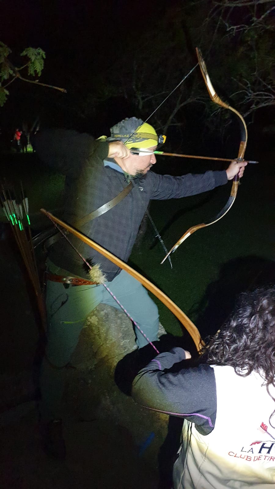 Angela y yo compartimos patrulla con José Manuel y con Lucía, residentes en León, que disfrutaron muchísimo su primera experiencia arquera nocturna. La temperatura nos acompañó y la disposición del recorrido permitió que pudiéramos alternar entre propuestas si detectábamos tapón en alguna. Dado que había montado el recorrido esa misma mañana, tenía curiosidad por conocer la impresión de la gente ante los diferentes retos "originales" y por los gritos durante la noche y los comentarios posteriores, parece que la gente lo disfrutó muchísimo. Mi favorito era la piqueta roja del coyote en donde había que colar la flecha entre dos fresnos desmochados extremadamente juntos.