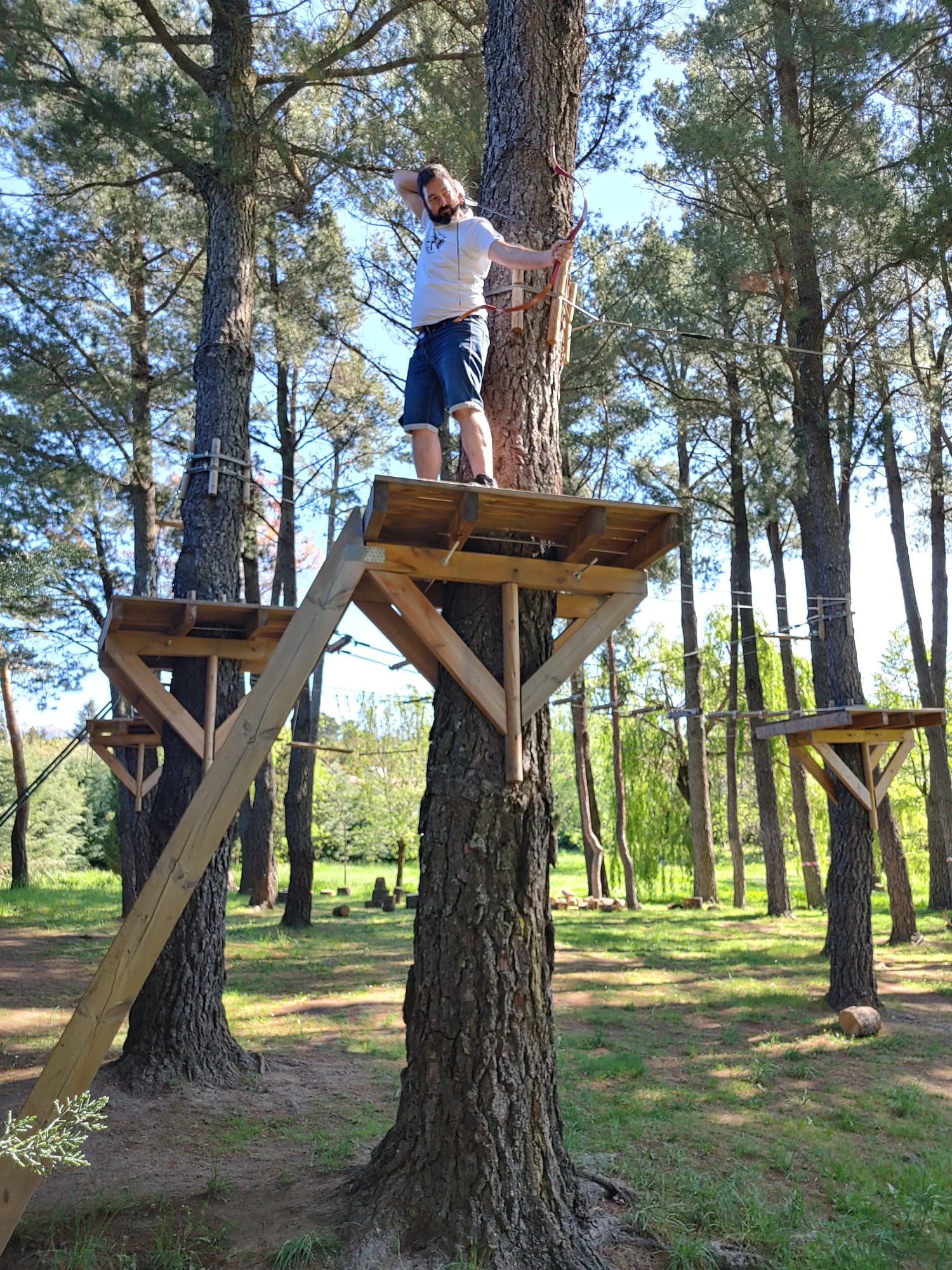 Aquí los tiros buscaban igualmente la originalidad. Angela y Luiyo compartieron patrulla conmigo y fuimos pasando por el tejón, las jabalinas, la pantera azul, el elk, el búho real, el lince, el gamo... Hicimos pausa en el tiro "bonus" picado subidos a una plataforma a unos 4 metros de altura en un árbol (inicio de una tirolina) y dimos buena cuenta de unas dianas con cara de zombi que nos obligaban a tirar prácticamente verticales. Era un reto opcional y no apto para personas con vértigo pero incluso la gente más avezada sentía la adrenalina adueñarse de ella cuando se disponían a tirar.
