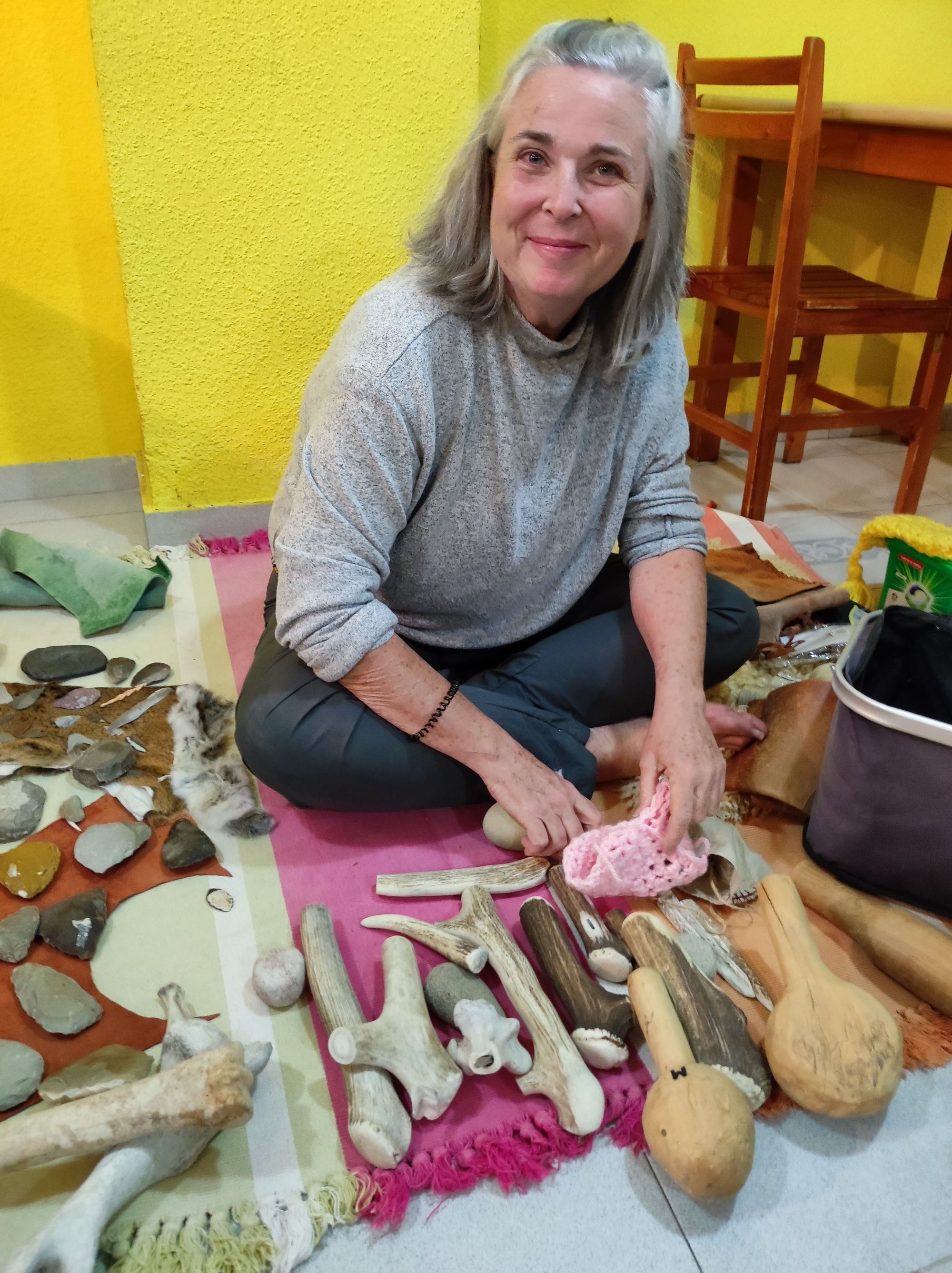 Con las mejores luces vespertinas nos encaminamos a cenar en el comedor del albergue El Colladito y la algarabía se adueñó de las mesas. La gente ya empezaba a conocerse entre sí, a comentar la tarde y a interesarse por las preferencias arqueras del resto. Cuando terminamos, María preparó una alfombra y dispuso toda suerte de útiles y materiales prehistóricos para su charla sobre la talla lítica. La verdad es que viéndola te transportabas a otro tiempo. Mostró ejemplos de puntas de flechas y habló de diferentes necesidades y técnicas relacionadas con su obtención. Hacia el final, la gente más interesada estaba prácticamente volcada sobre ella y su colección.