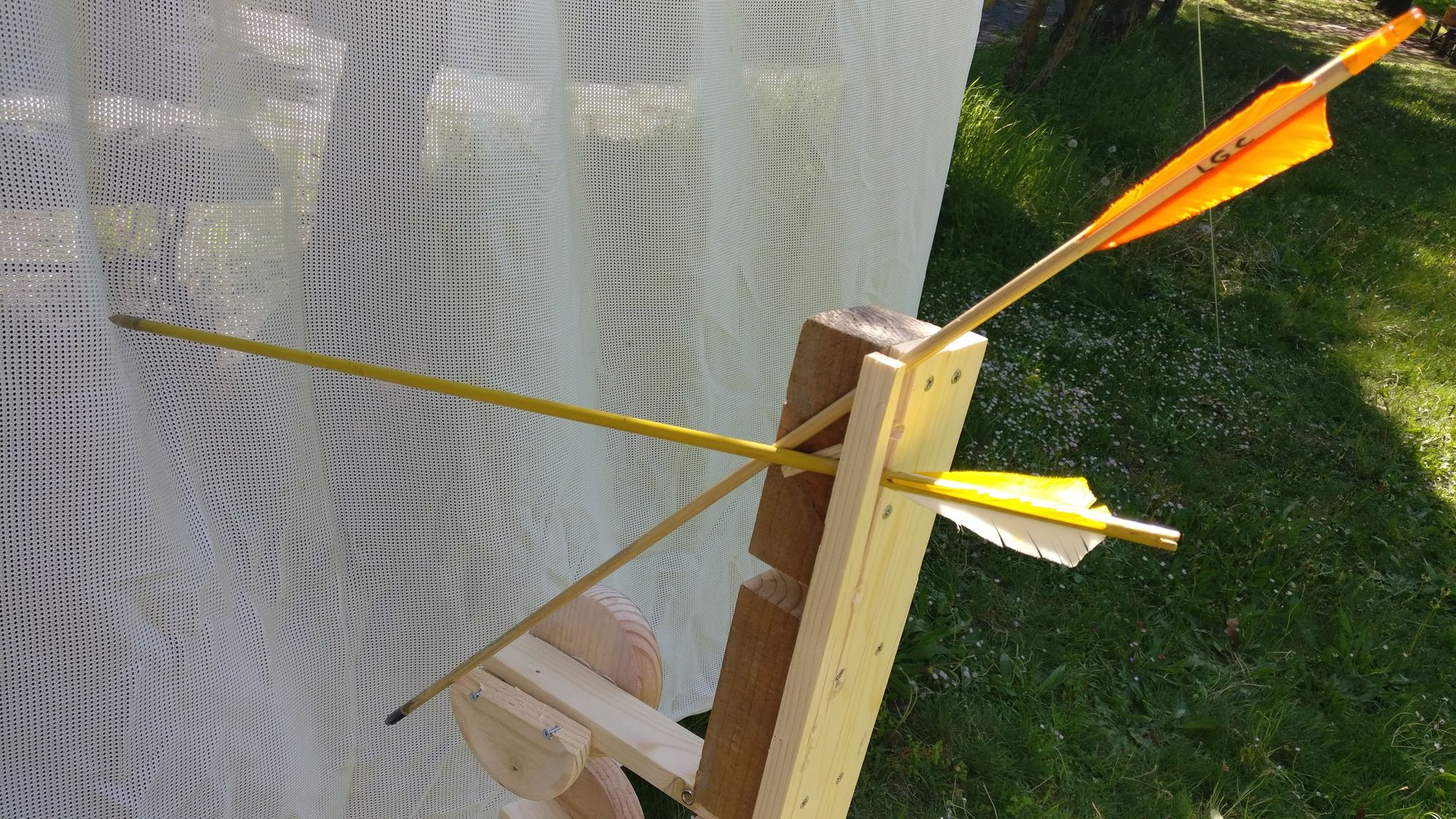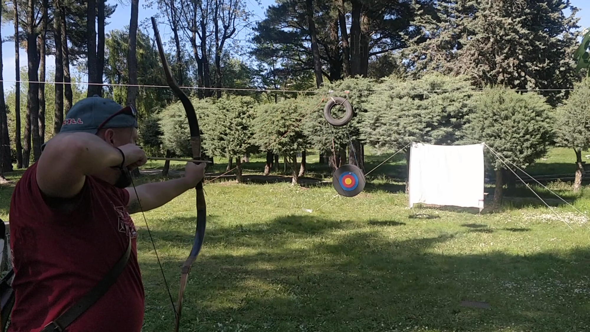 En una zona muy despejada colocamos mi red de seguridad de 2x2 metros ante la que pasaba una diana a cierta velocidad aprovechando el mecanismo de tirolina para niños del albergue. Un neumático hacía las veces de peso para provocar la caída y alguien con una cuerda liberaba el invento. Esto trataba de simular un tiro a un blanco móvil cuando el arquero está estático (una situación de caza o en contexto bélico).