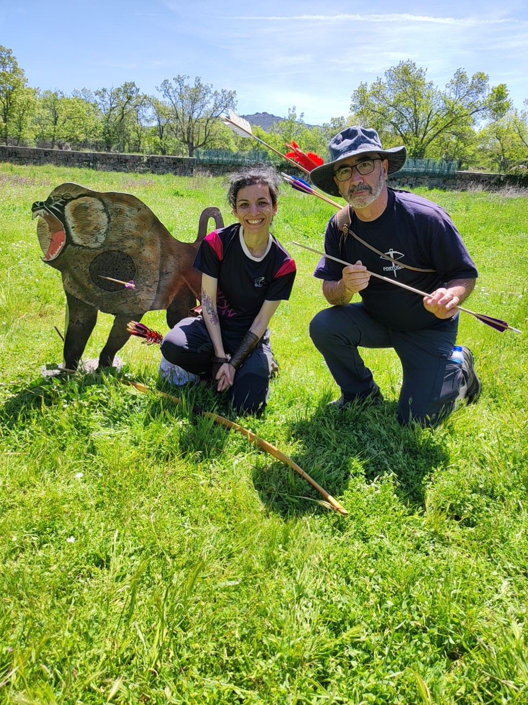 Pues bien, tras las tres rotaciones de 40 minutos llegamos a las 12.30h y sonó la última alarma para indicar que habíamos concluido las tres rotaciones y que debíamos dirigirnos a la terraza del albergue. Viendo que íbamos bien de tiempo Haritz propuso realizar una última prueba (opcional) con el infame "mono chapa" de Arqueros de Madrid (luego comentaré más de este club) en el que un babuino de metal tiene solamente diana blanda en el corazón. Gana quien sobrevive sucesivas rondas a distancias crecientes con la flecha intacta. El morbo está servido porque la tensión que se respira antes de cada flecha es impresionante, como lo es las carcajadas cuando la flecha impacta y estalla en mil pedazos por errar el corazón. Esto sucedió cuando yo estaba recogiendo cuadernos de puntuación para los premios de la clausura así que cuando llegué quedaba apenas la final entre Sergio, el portugués, y Angela. Él, con un longbow moderno. Ella, con su precioso Mollegabet prehistórico. Tiró primero Sergio y la flecha estalló contra el metal. Fue el turno de Angela y yo sabía exactamente el desenlace. Efectivamente, la flecha fue preciosa apenas un poco a la izquierda del mismísimo centro de la diana. Obviamente, se llevó una buena ración de aplausos.