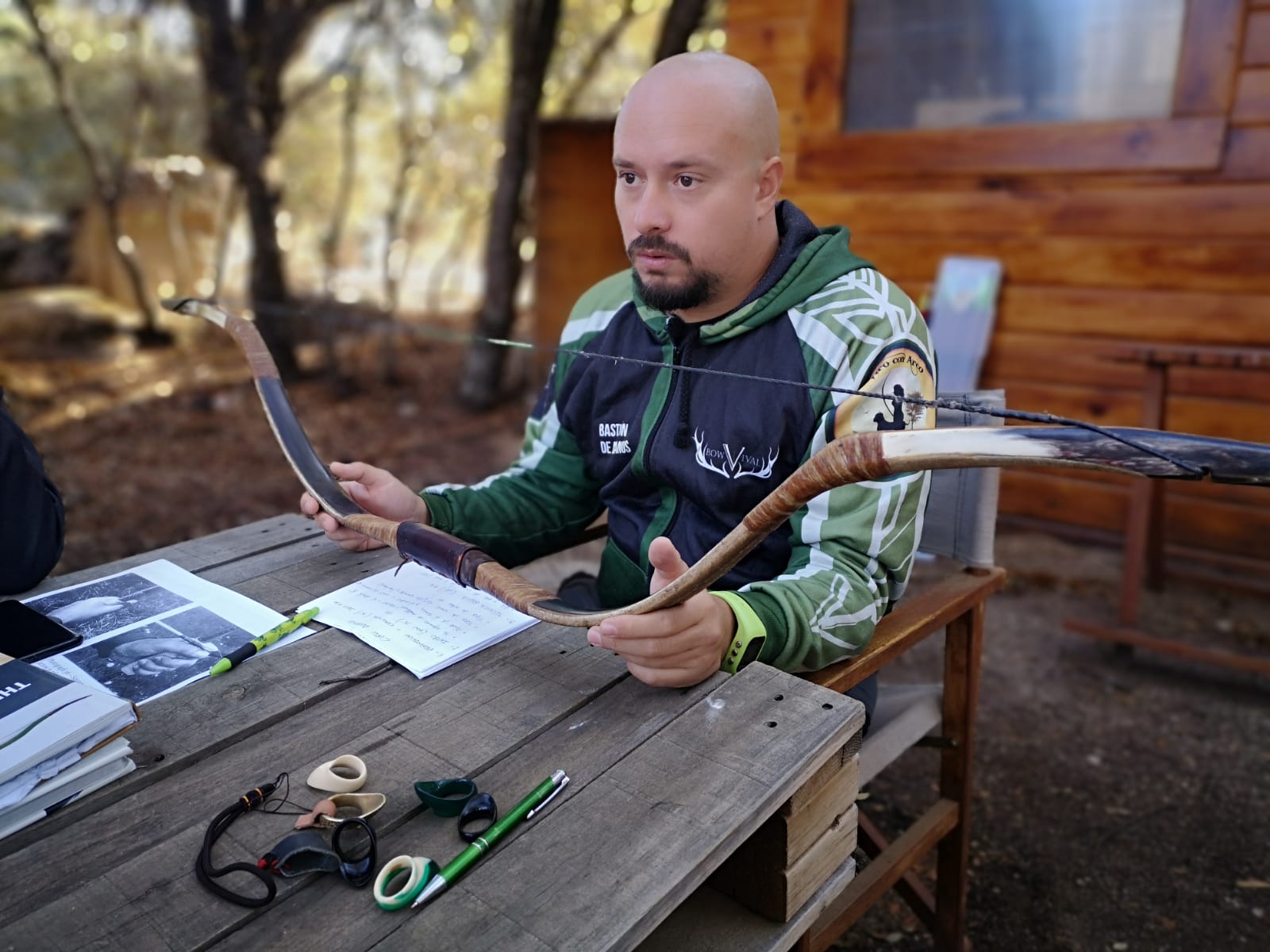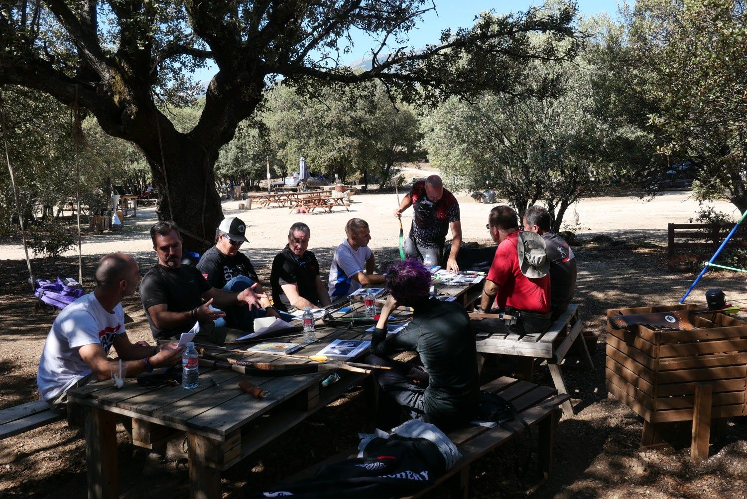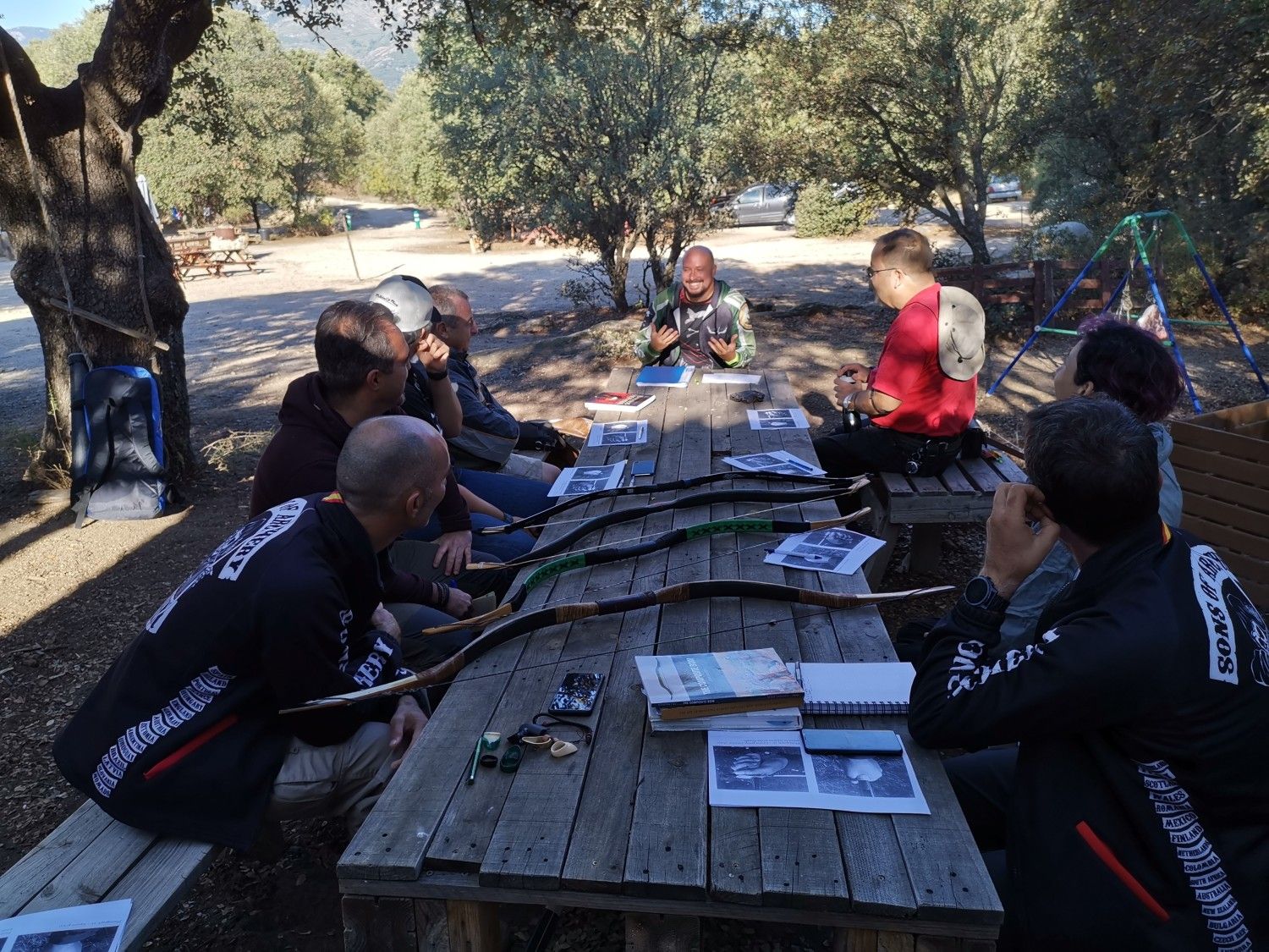 Fer se presentó y con diferentes arcos nómadas encima de la mesa comenzó a explicarnos el concepto del curso, cómo de importante era hacer un repaso por la teoría para evitar explicar demasiadas cosas en los parapetos con todo el mundo con arcos y flechas en las manos. Dedicó buena parte a hablar de los diferentes tipos de arcos nómadas (compuestos) en su morfología y materiales y cómo la técnica debía adaptarse al tipo de arco o al menos tenerlo muy en cuenta ya que arco y técnica concreta congeniaban especialmente bien.