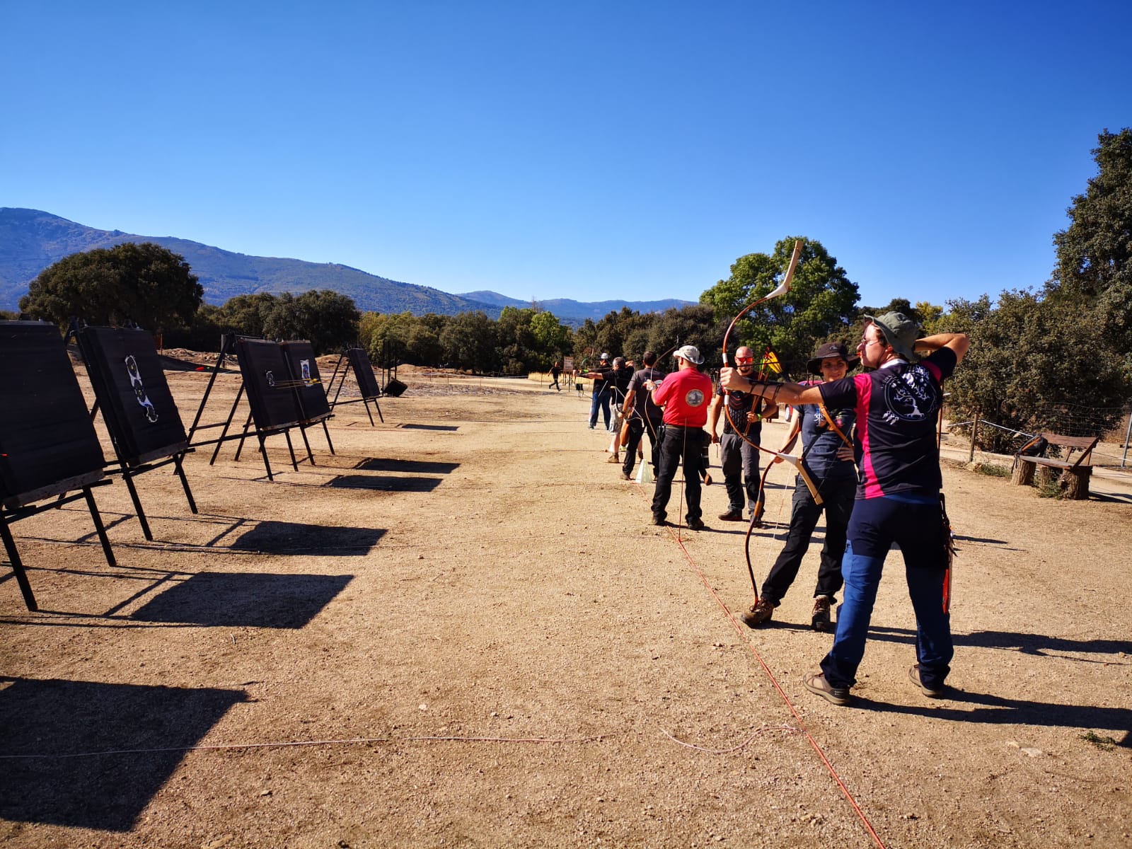 Sentimos cierta progresión y acabamos muy contentos aunque yo me llevé un buen golpe de la cuerda tratando de aplicar un agarre de cuerda poco adecuado para el tipo de anillo y las libras de mi arco, pero fue ya a pocas flechas del final y aproveché para sacar algunas fotos más con el arco descansando en unos poyetes tras la línea de tiro.