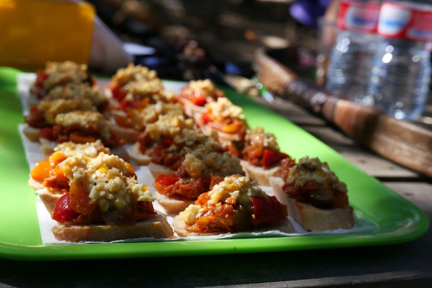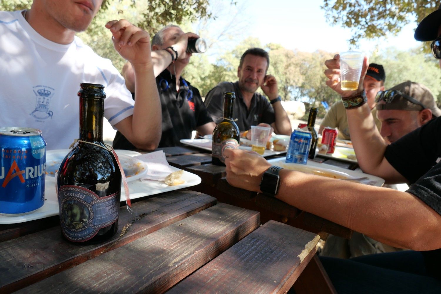 Como Bastión nos había servido un aperitivo delicioso una hora antes, el estómago ya estaba pidiendo atención y tardamos poco en recoger las flechas y andar rápido hasta la comida que nos estaba aguardando, pasta con carne en cantidades generosas. A cambio de retrasar media hora el arranque y darle precioso minutos de sueño a Angela, me había hecho con un pequeño alhijo de botellas de hidromiel de la buena gente de Hidromieles Grendel y pareció el momento adecuado para iniciar una degustación que tuvo bastante éxito.