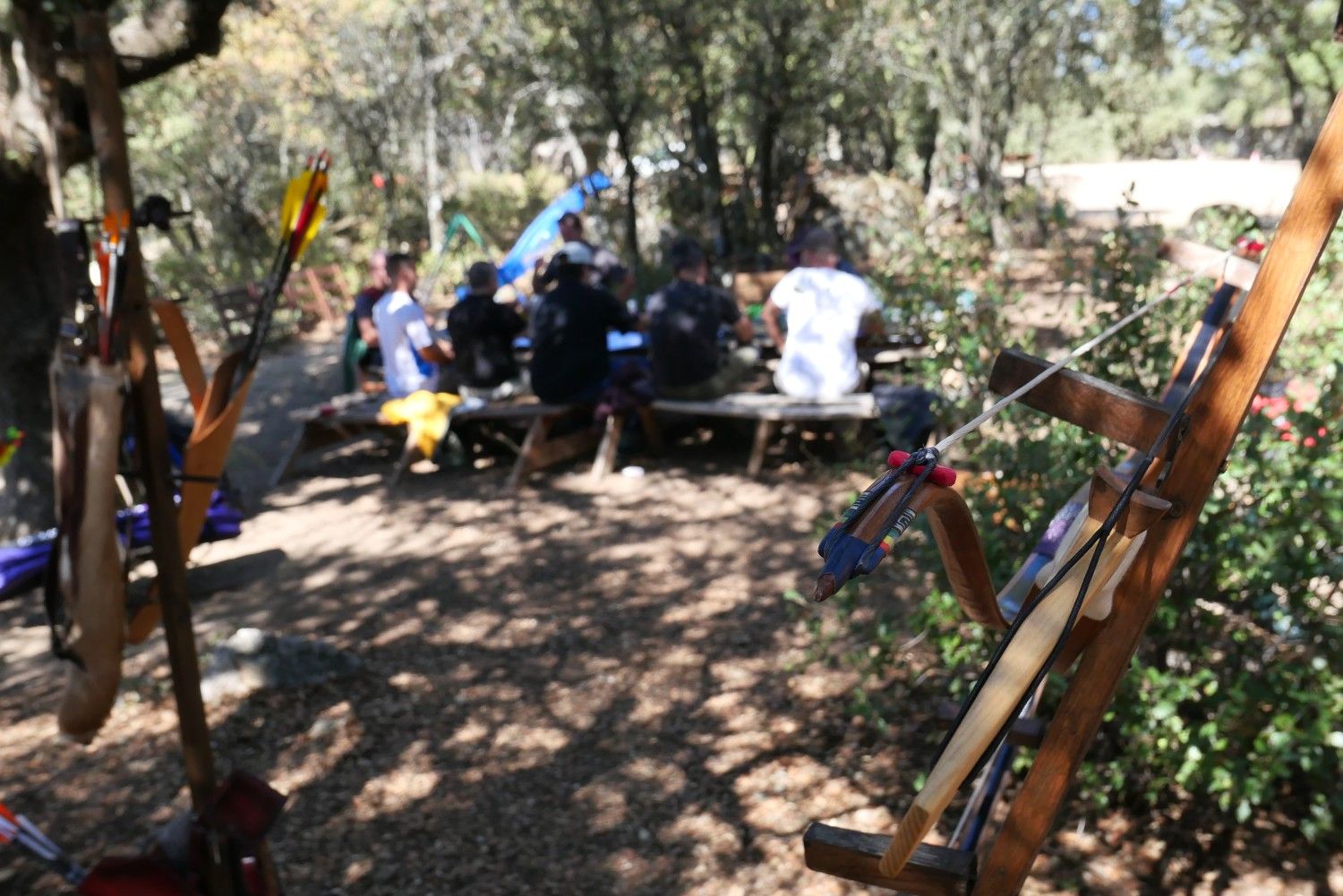 Concluida esta sobremesa con altas dosis de reflexión, Fer nos invitó a volver a los parapetos para poner en práctica todo lo aprendido durante la jornada. Aún nos quedaban dos horas largas y todos queríamos asentar los conocimientos así que montamos los arcos, colocamos las flechas en nuestras aljabas y con nuestros anillos "favoritos" nos fuimos hasta la línea de tiro de las dianas de entrenamiento.