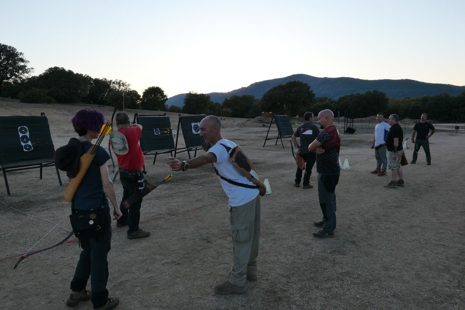 Nos volvimos a colocar por parejas para poder analizar lo que hacía la otra persona además de tener a Fer revoloteando por entre nosotros y comenzamos a tirar ya en serio. Lo hacíamos de la siguiente manera. Fer nos indicaba dos o tres aspectos claves de la técnica (posición de piernas, tronco y un agarre de arco, por ejemplo) y probábamos a ver qué tal. Tras cada tanda, asimilábamos lo que habíamos experimentado y entonces Fer nos modificaba algún aspecto (o dos). Así, fuimos recorriendo casi sin darnos cuenta no pocas combinaciones de toda la casuística disponible y aunque llevábamos arcos muy diferentes, todos aplicábamos las mismas técnicas n'importe quoi.