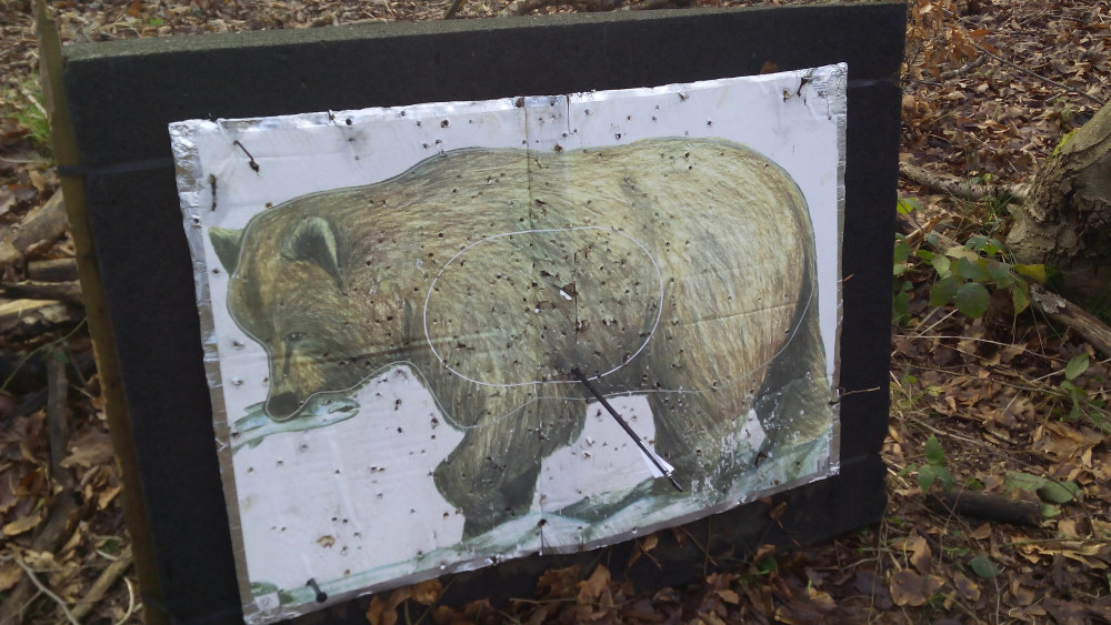 Seguí encadenando primeras flechas y llegó un momento en el que empecé a oír disparos de flechas delante de mí en el bosque. Efectivamente, a los pocos minutos me encontré con un grupo de arqueros veteranos muy tradicionales (longbows victorianos y camisetas de "Longbow Heritage") a punto de disparar a un gorila a unos 55 metros. Como era de esperar cuando tiras con un longbow con snapshooting y al montón la cosa no fue bien. Cuando fue mi turno ya notaba la típica presión del entorno. Pensé "esto me va a romper la racha, maldita sea". Pero no, me quedé a dos centímetros del muerto en la primera flecha ante el asombro de los allí presentes (y mío). Luego sucedió una cosa curiosa. Los adelanté con su permiso y me fui a buscar la siguiente diana pero me perdí y tuve que desandar hasta encontrarla justo cuando el otro grupo llegaba también, siendo yo ahora el "parón". Me disculpé y me preparé para tirar pensando "vale, esta vez sí que no te va a salir la jugada tan redonda" pero no, resulta que al guepardo le di en todo el corazón con una técnica magnifica así que sonreí agradecido ante las muestras de aprobación espontáneas de los otros tres. Tras esa doble prueba estaba claro que la cosa sólo podía acabar bien y bien acabó.
