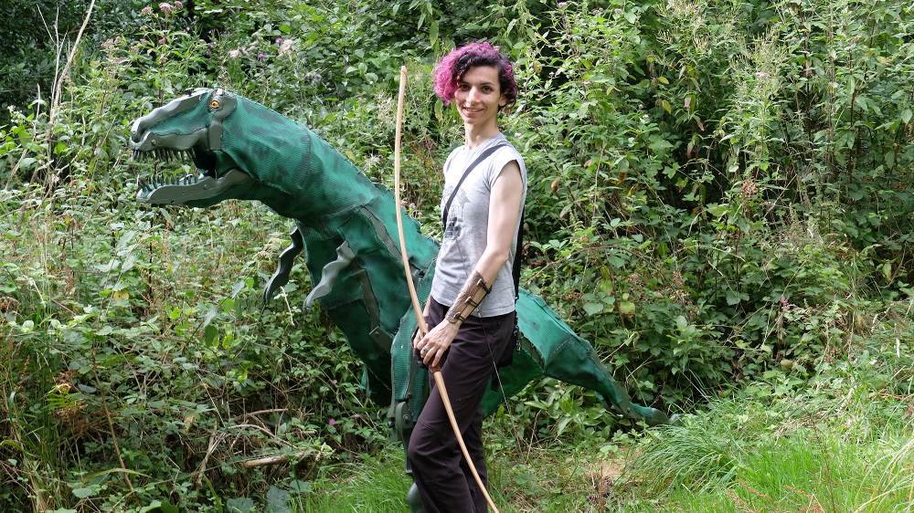 Angela posa junto con un dinosaurio hecho enteramente con partes de arcos o material de tiro con arco. Una maravillla a la que estaba prohibido tirar :)