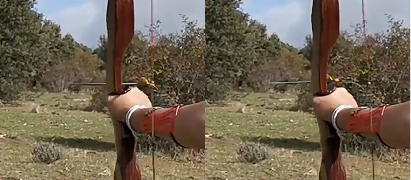 Veámoslo con un ejemplo de un gran arquero, Xavier Fernández Buil, en donde es probable que su punto de encoque esté justo al límite y por un gesto en su técnica, haya o bien bajado un milímetro la cuerda respecto de la empuñadura o haya inclinado hacia adelante la empuñadura, elevando su extremo anterior respecto de la cuerda.
