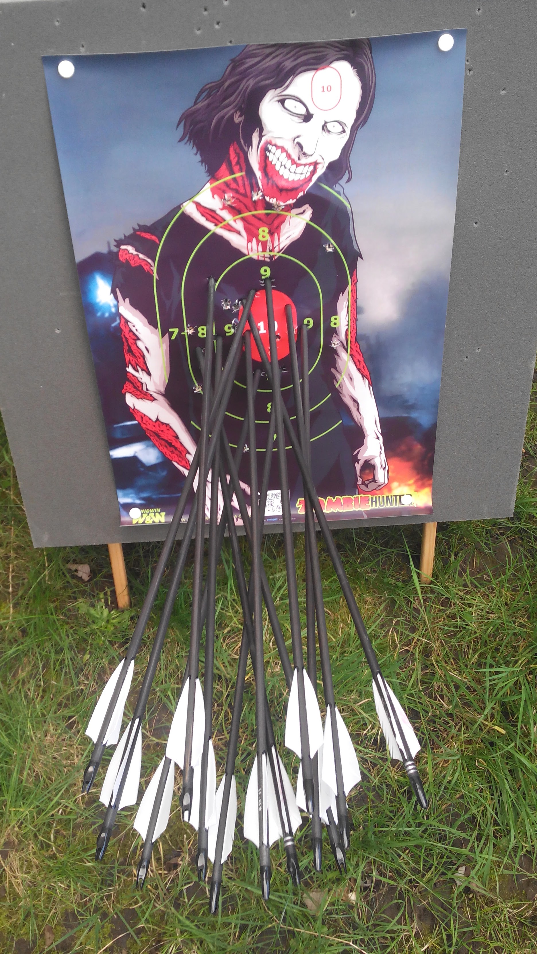 Esta semana vi la oportunidad de disparar unas 40 flechas a la diana desde distintos puntos del jardín y así lo hice. Antes, sin embargo, cuando solo había tirado una media docena de calentamiento, le pedí a un compañero de trabajo que me grabara haciendo un tiro en plan "cómo me molo". La idea era llegar, lanzar las flechas en el césped, que se clavaran y luego, con toda naturalidad hacer el tiro al centro del zombi confiando en que la flecha fuera bien.
