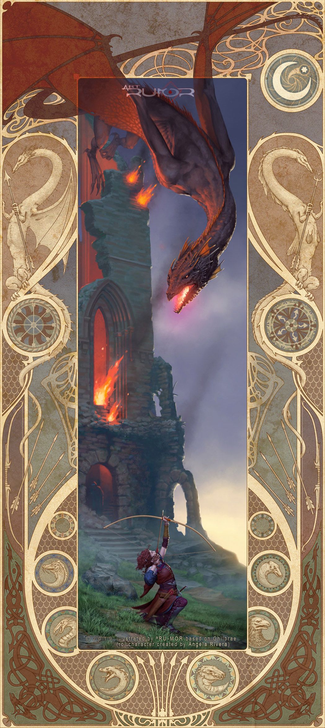 Me gustó mucho la doble (o triple tensión de la composición). Por un lado está el arco tenso, pero por otro también lo está el cuerpo, y sin embargo ambas tensiones transmiten equilibrio y dominio. Por ello pensé en inmortalizar este recuerdo y encargar en secreto a ªRU-MOR una escena en donde el personaje alter-ego mostrara la misma pose solo que en esta ocasión enfrentándose a un dragón (muy apropiado tratándose de la tirada de San Jorge). Además, conociendo los gustos de Angela y visualizando una composición muy vertical, le pedí a ªRU-MOR que crease una cenefa alrededor con inspiración en el Art Nouveau.