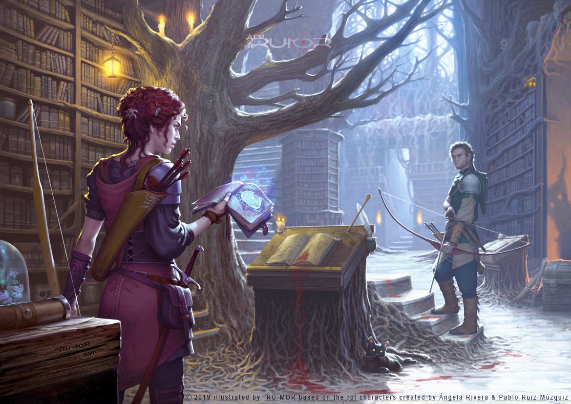 Ese encargo se tradujo en esta maravillosa lámina en donde aparecemos en una especie de biblioteca-bosque (no se sabe qué fue primero) tras haber sorprendido a un nigromante.