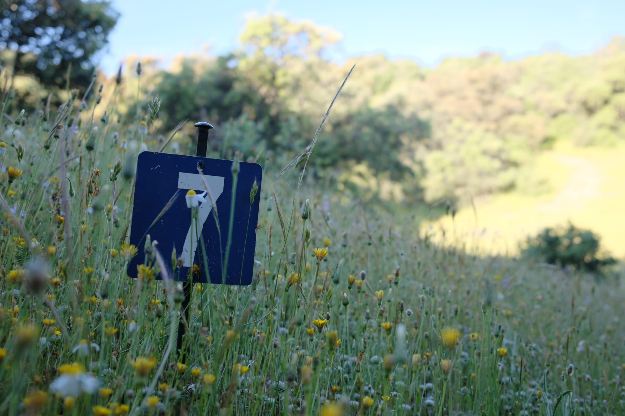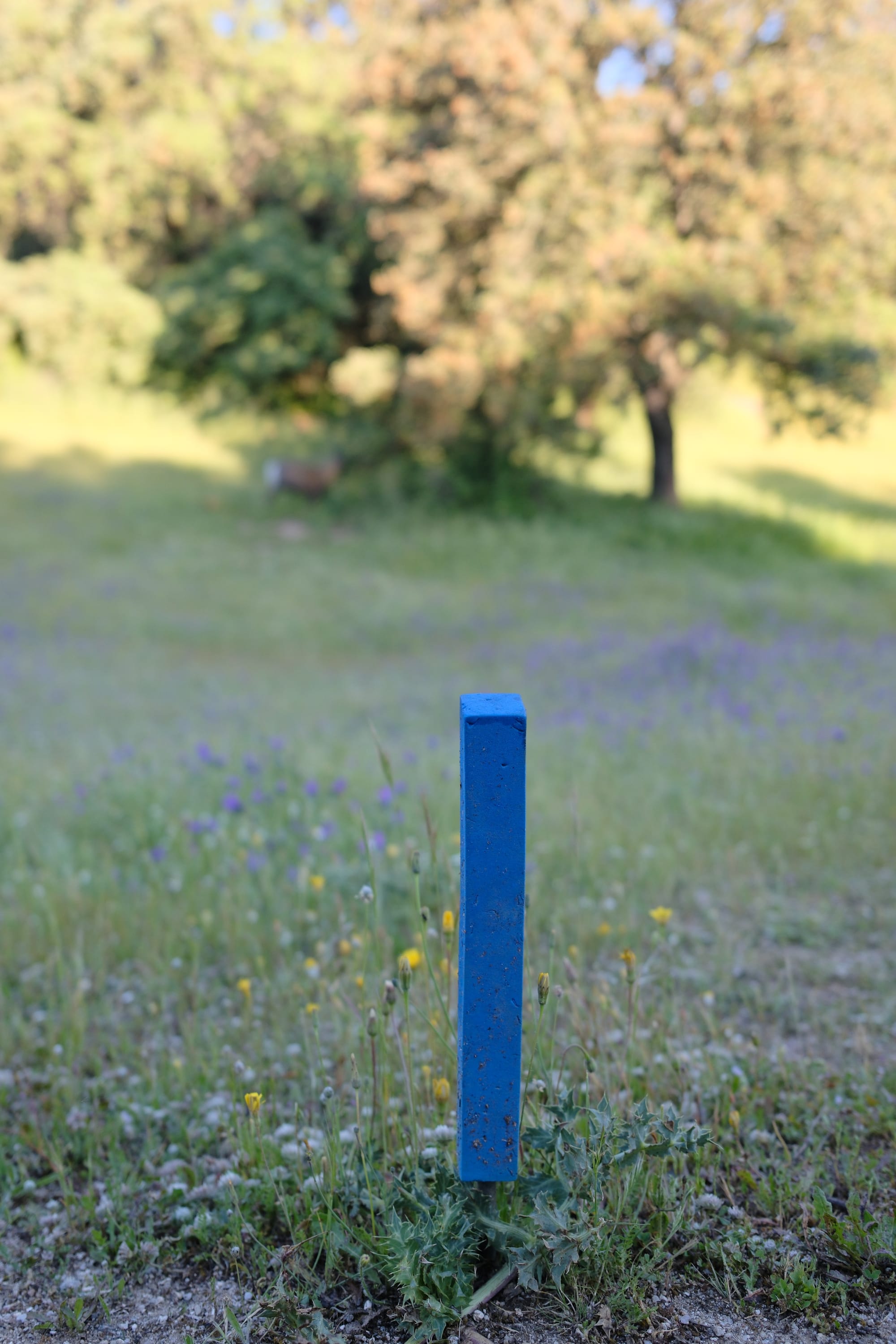 Piqueta azul que, junto con la roja, marcan los puntos de tiro en reglamento WA. Al fondo se adivina una cabra montesa