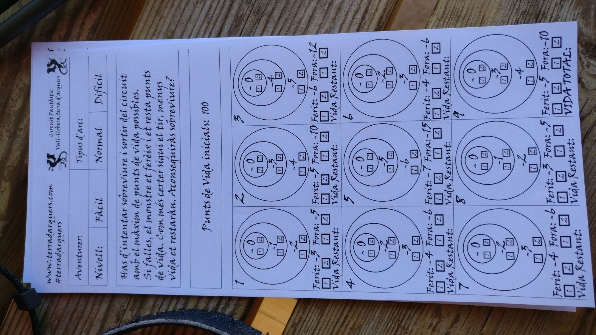 Nos encantó el sistema de puntuación en donde cada participante entra al recorrido de 10 dianas con 100 puntos de vida que van disminuyendo a medida que fallamos en diferente grado en nuestras dos flechas por diana. Así, dar en el 11 no resta, pero cualquier otro resultado resta de forma creciente. Igualmente, cada diana, por su "peligrosidad", resta más o menos en los fallos. No es lo mismo fallar un dragón (resta 15 puntos de vida) que una gárgola (5, por ejemplo).
