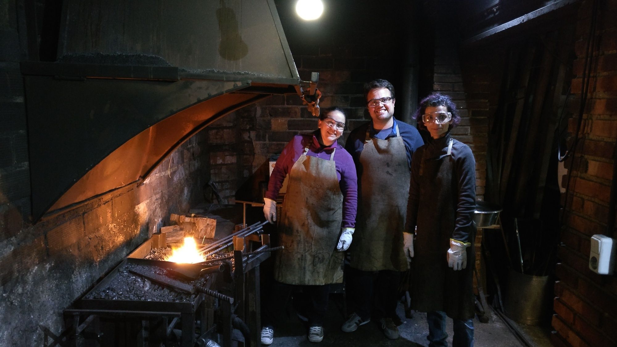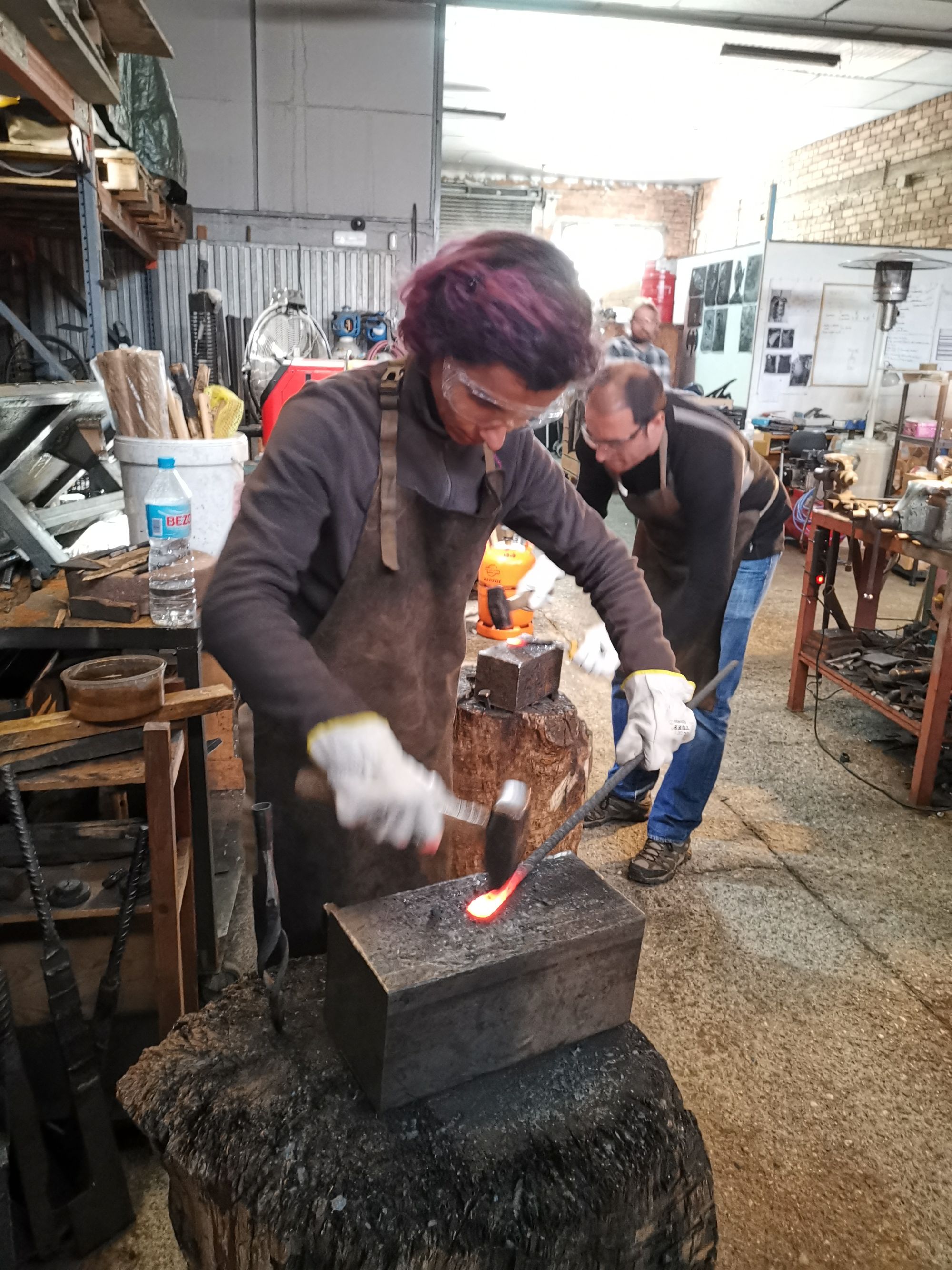 Nos pusimos unos delantales, guantes y gafas protectores y atendimos las indicaciones de seguridad y cómo alimentar a la fragua e ir metiendo las barras de hierro corrugado para después ir al yunque y con el martillo aplanar para hacer las virolas o encajes para el vástago. Posteriormente "obteníamos" la punta estilo bodkin o similar con otra técnica diferente.