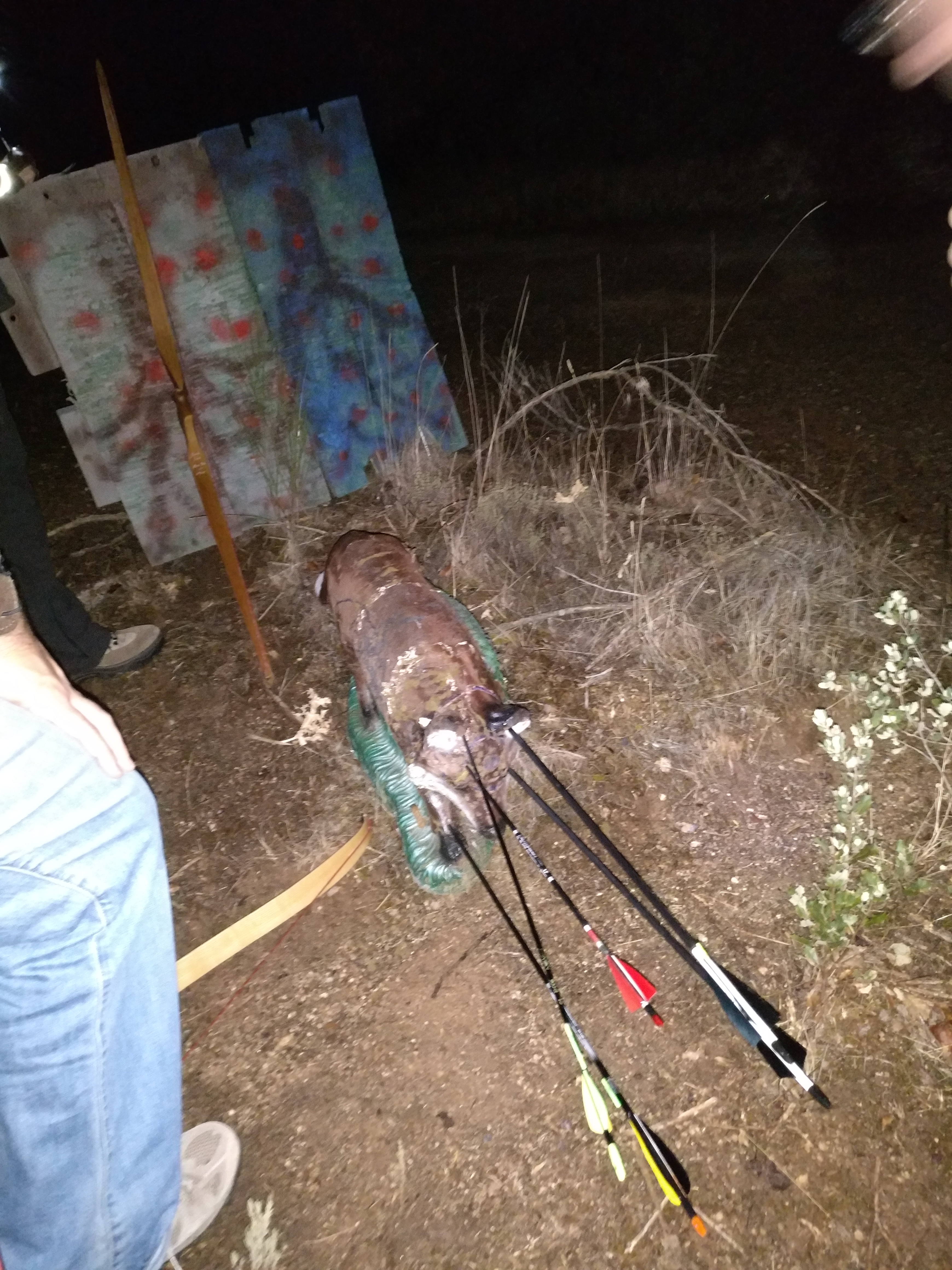 Hubo muchos tiros preciosos, especialmente los que se ejecutaban totalmente a oscuras. Hay un disfrute especial en mirar a la oscuridad con apenas un recuerdo de dónde se encuentra el animal, abrir y cargar el arco sin ver más que un ligero brillo en el arco y los brazos fruto de la luz lunar, fijar la mirada en un punto invisible durante un par de segundos, soltar y ver cómo la flecha vuela hasta clavarse en el animal con un sonido inconfundible. Incluso sin saber aún si la flecha ha sido especialmente certera, a veces uno simplemente lo sabe y con la segunda flecha vuelve a enfrentarse al tiro con la ayuda esta vez de un débil punto luminoso en el que volcar toda la concentración.