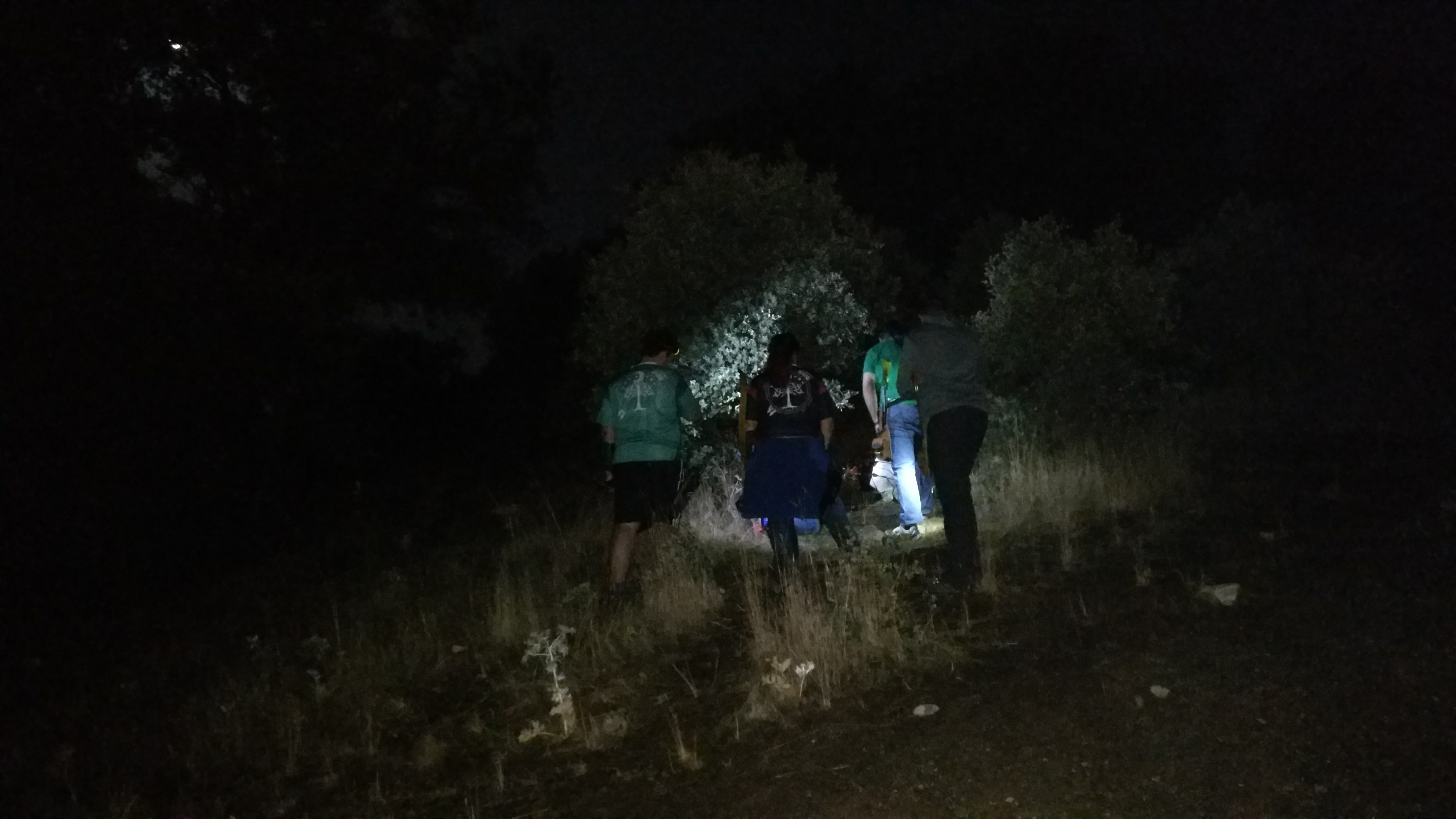 Nuestra patrulla terminó sobre las 2.30h de la madrugada en el momento en el que empezaba a hacer algo más de frío. Sellamos las tablillas y esperamos a que la segunda patrulla, que había arrancado dos dianas detrás de nosotros, concluyera. Sin embargo, pronto nos dimos cuenta de que iban a otra velocidad porque la distancia de dos dianas se había transformado en ocho. Fuimos en su búsqueda y rápidamente descubrimos el porqué cuando vimos que tiraban de uno en uno en lugar de de dos en dos, como habíamos acordado al comienzo. Esto supuso una diferencia de una hora más hasta que todos hubimos terminado sobre las 3.30h de la mañana. Esta hora adicional nos sirvió a nuestra patrulla para contrastar cómo enfocaba esta patrulla las dianas y en general vimos que seguían fórmulas muy parejas a las nuestras. Uno de los momentos de la noche fue en la diana 20, cuando la segunda patrulla siguió la recomendación de tirar a oscuras desde la piqueta roja a una diana invisible unos 50 metros, que cruzaba de lado a lado la vaguada. Hasta cuatro flechas (Yami, Luiyo, Borja y Álex) se clavaron en el pequeño oso al otro lado, arrancando aplausos de todos. En nuestro caso, sólo Angela había podido clavar una flecha en el animal, perfecta de altura y ligeramente a la izquierda del pulmón, en lo que fue una luna unánime.