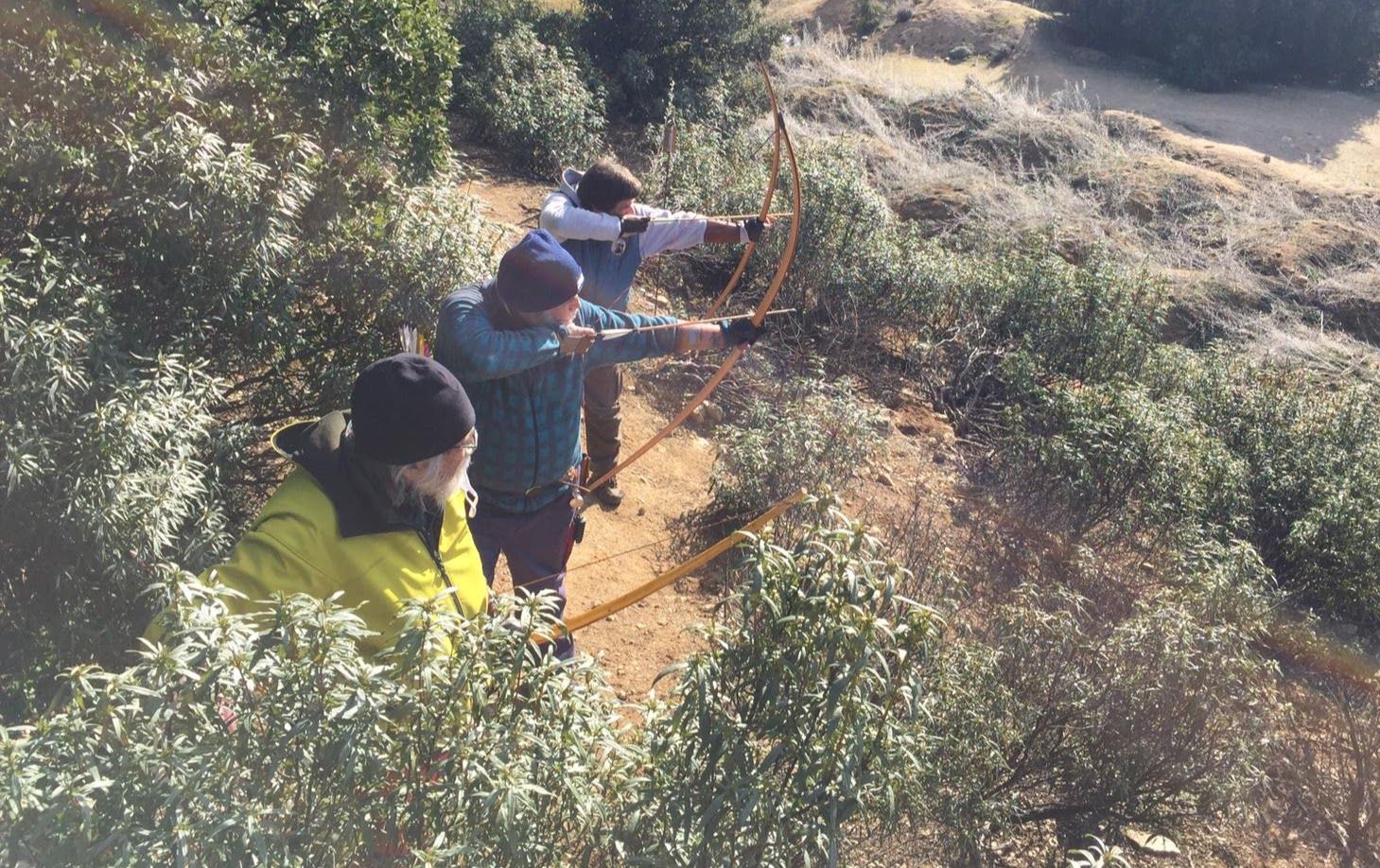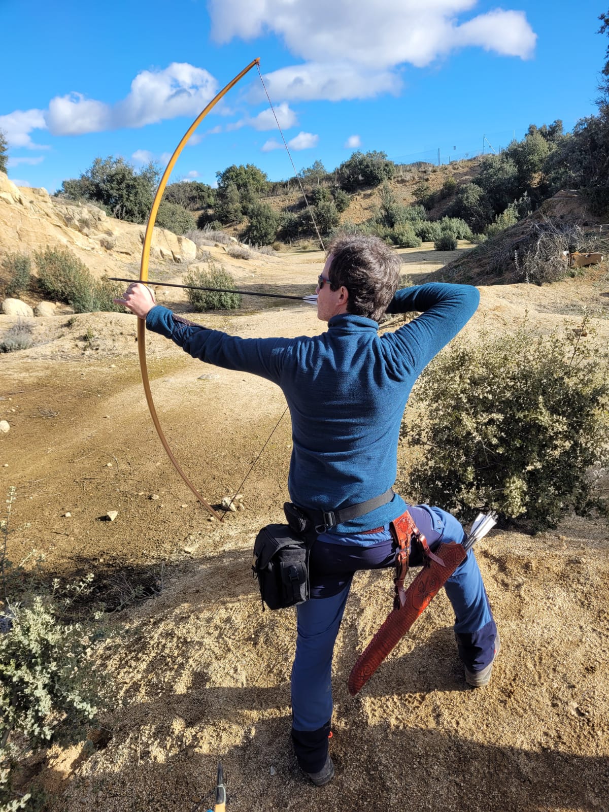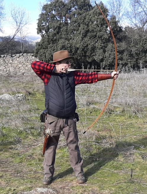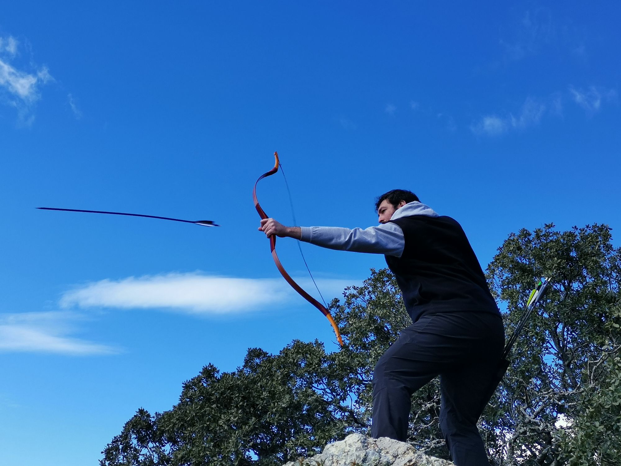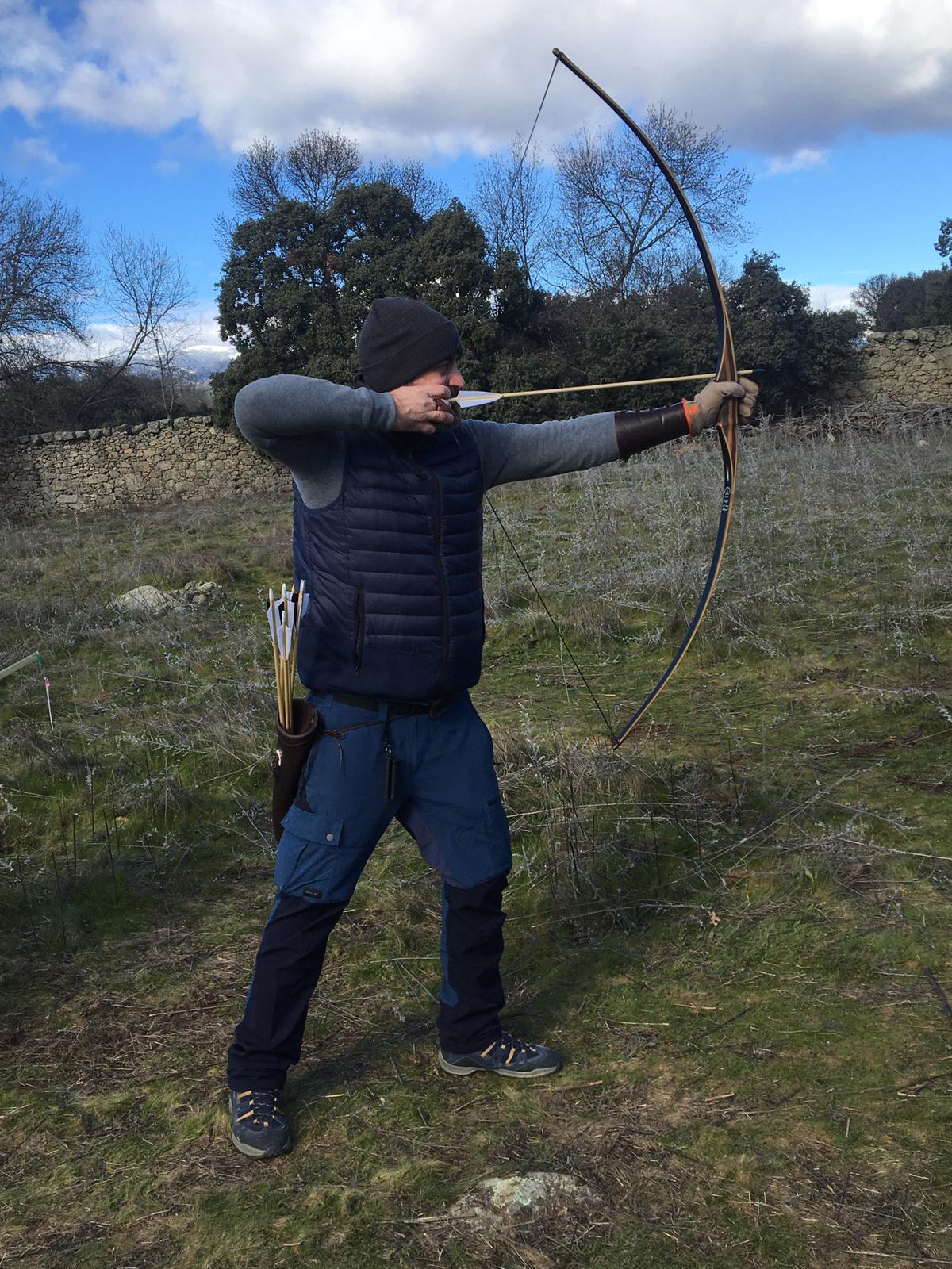 Yo estuve con Borja, que había venido unas semanas desde Inglaterra, Marko y Diego. Cuatro arcos diferentes. Borja, con un flatbow moderno prestado, Marko con su victoriano recurvo y Diego con su nómada Han de fibra. Por mi parte, estrenaba mi arco del neolítico ibérico, una réplica de Jürgen Junkmanns del arco de La Draga. Por supuesto, de tejo.