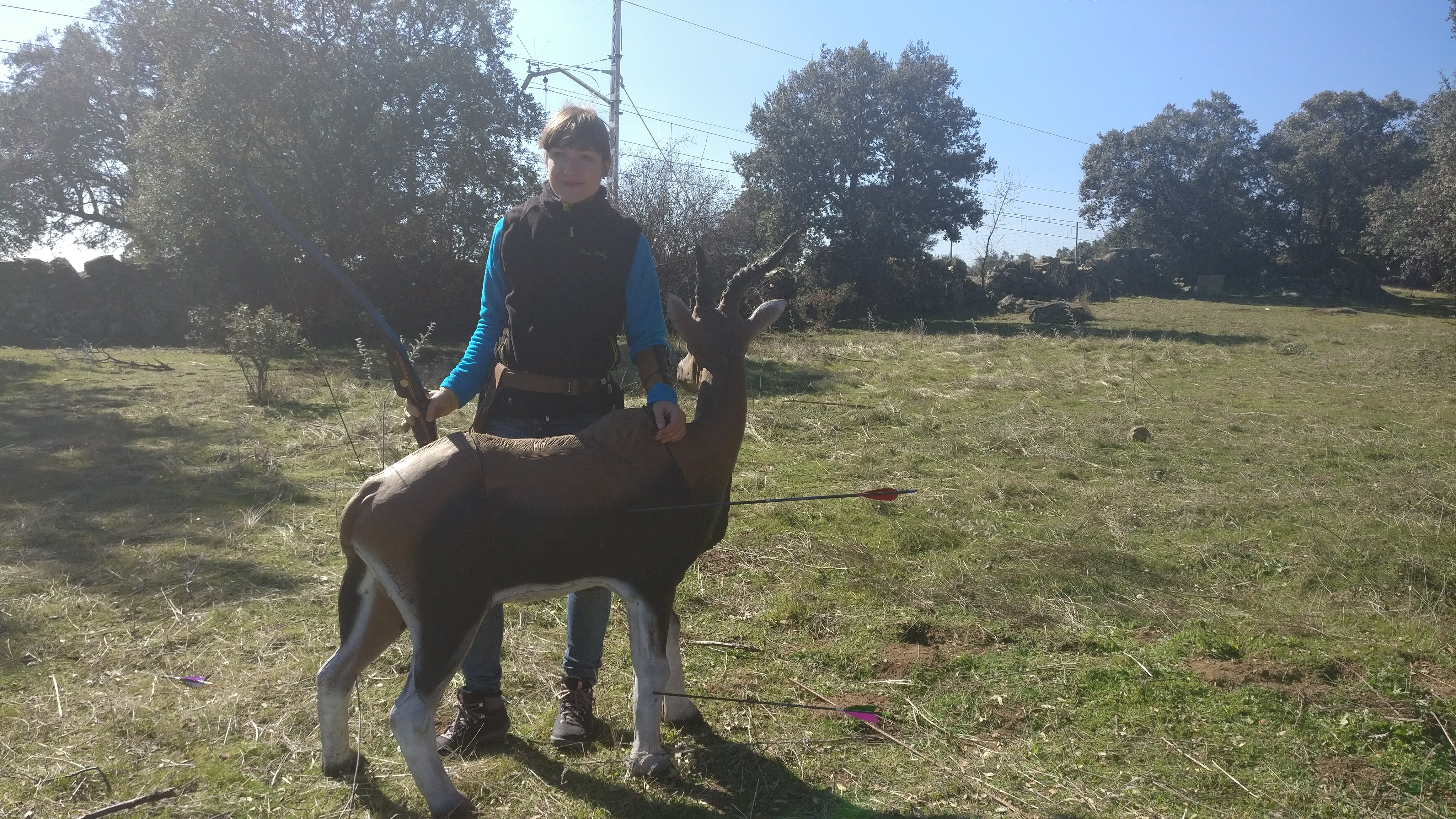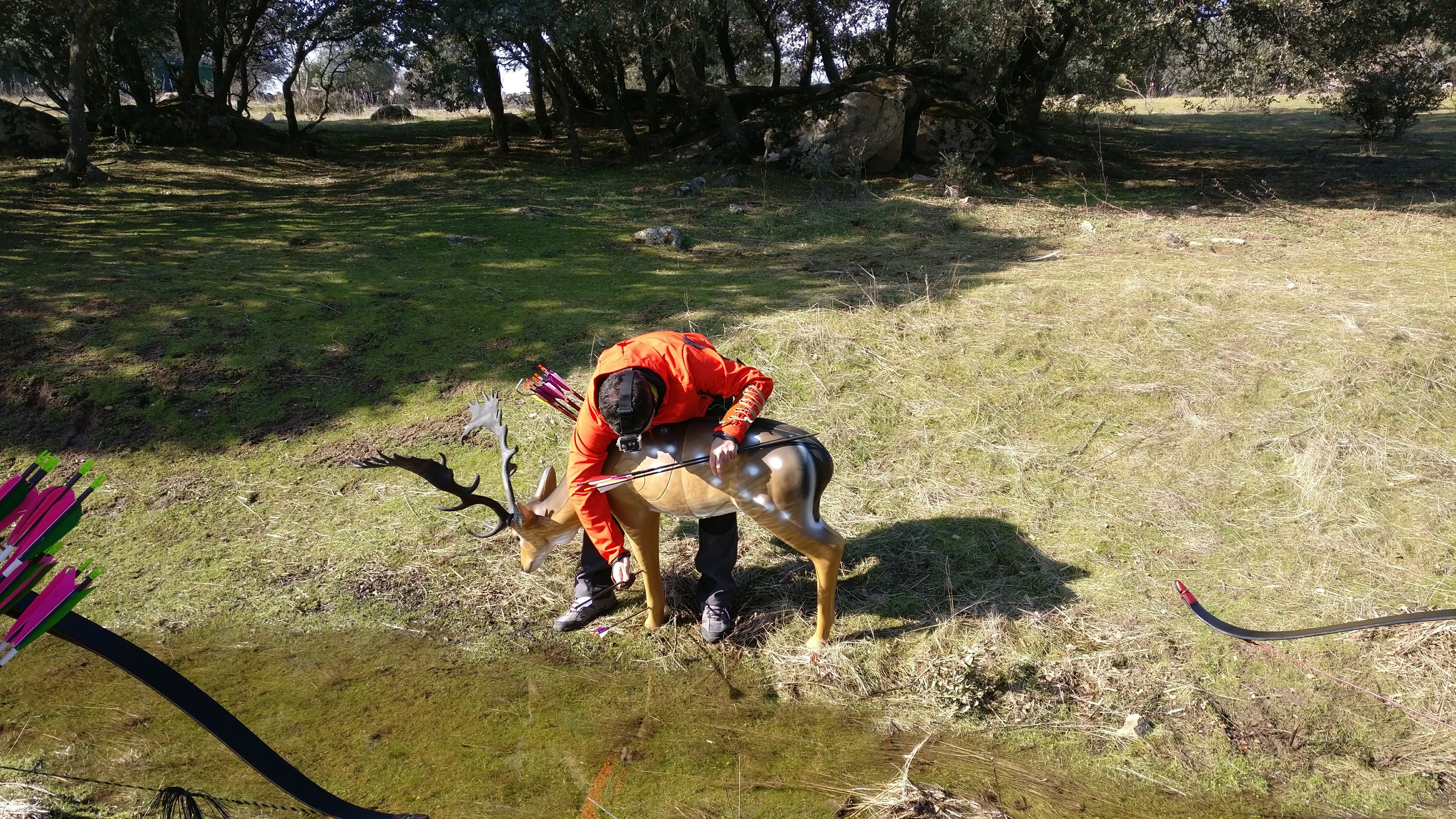 Empezamos tirando paralelos a la vía del tren, creo que a un corzo tumbado. Un tiro ligeramente en pendiente, a unos 20 metros. Se me fue tres palmos por arriba en la línea del corazón. "Bueno" --pensé-- "el proceso de calibración sigue en marcha". Sí y no. Según avanzábamos en las dianas, cometía fallos de altura, uno tras otro. Como la línea la respetaba, a veces me llevaba el premio de consolación de la pata delantera, pero no conseguía "ver el tiro". Es como si el arco me lo acabaran de prestar y estuviera tomando medidas. Pero claro, la ronda Hunter, a una sola flecha, es despiadada con las dudas. Tiras la mitad de flechas que en una ronda normal y nunca repites tiro. No hay margen para mejorar si no vas "enchufado" desde el desayuno. Y yo no estaba enchufado.