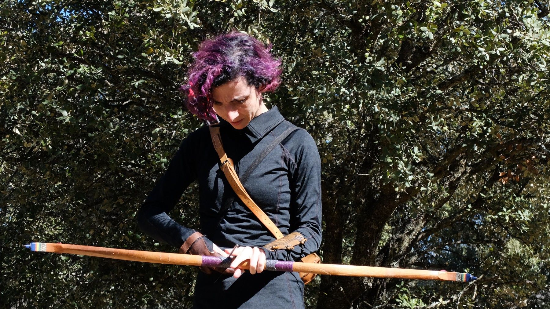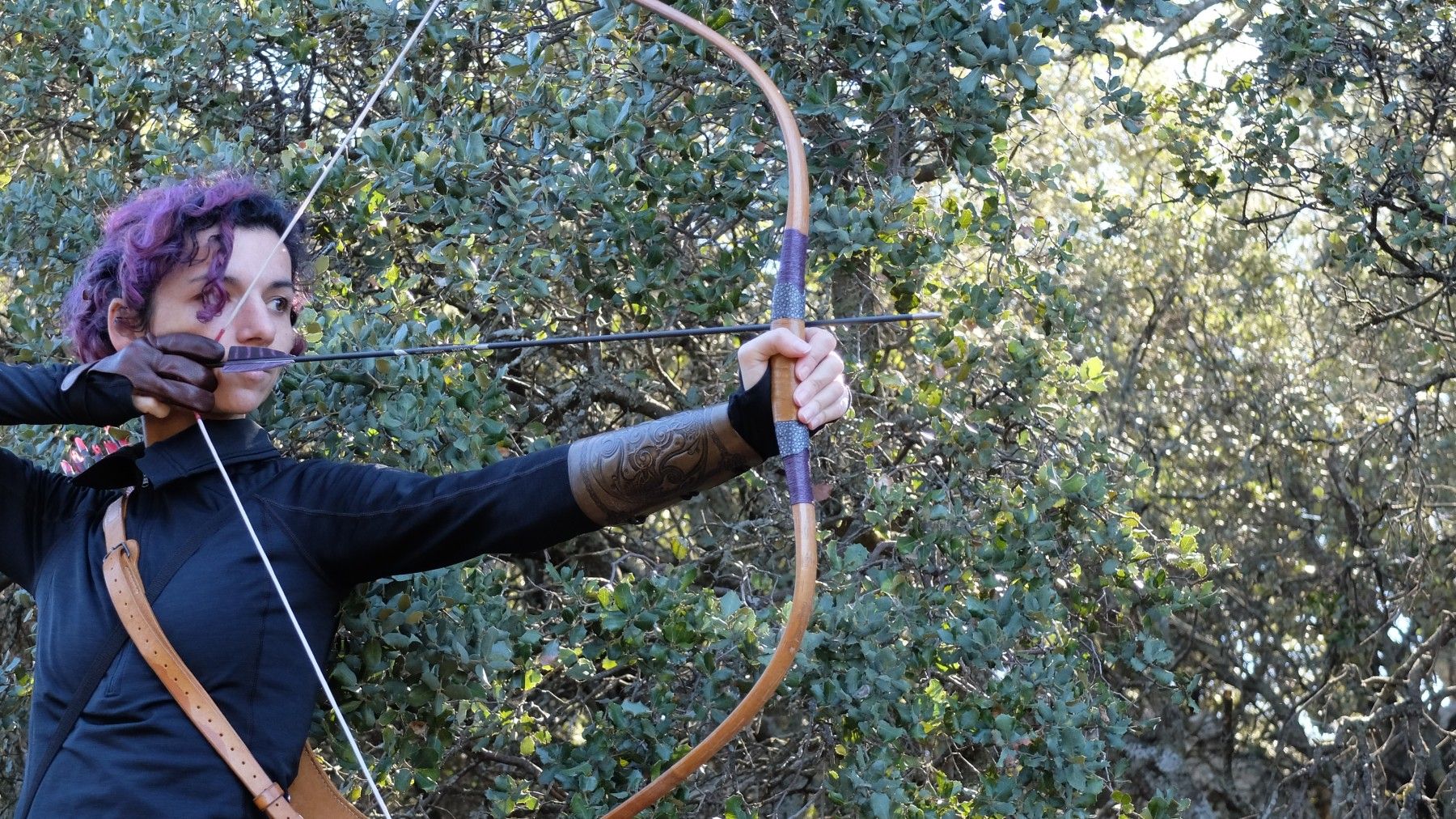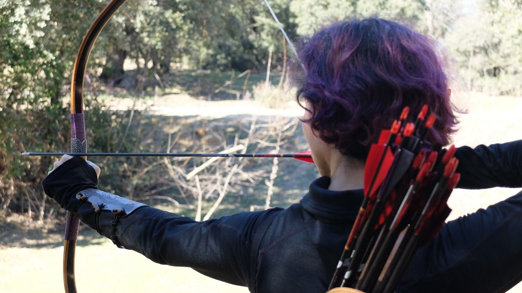 Angela pasó entonces de la seguridad y comodidad de su técnica "mediterránea" a la "alienígena" del agarre de pulgar con la ayuda y consejos de Fer Baelo que lleva al menos año y medio trabajando en solitario esta forma de tirar con arcos nómadas. Y así estuvimos casi otra hora con una luz típicamente vespertina, viendo cómo las flechas que por la mañana volaban certeras al corazón de las dianas, se desviaban ahora un metro hacia a la derecha del objetivo.