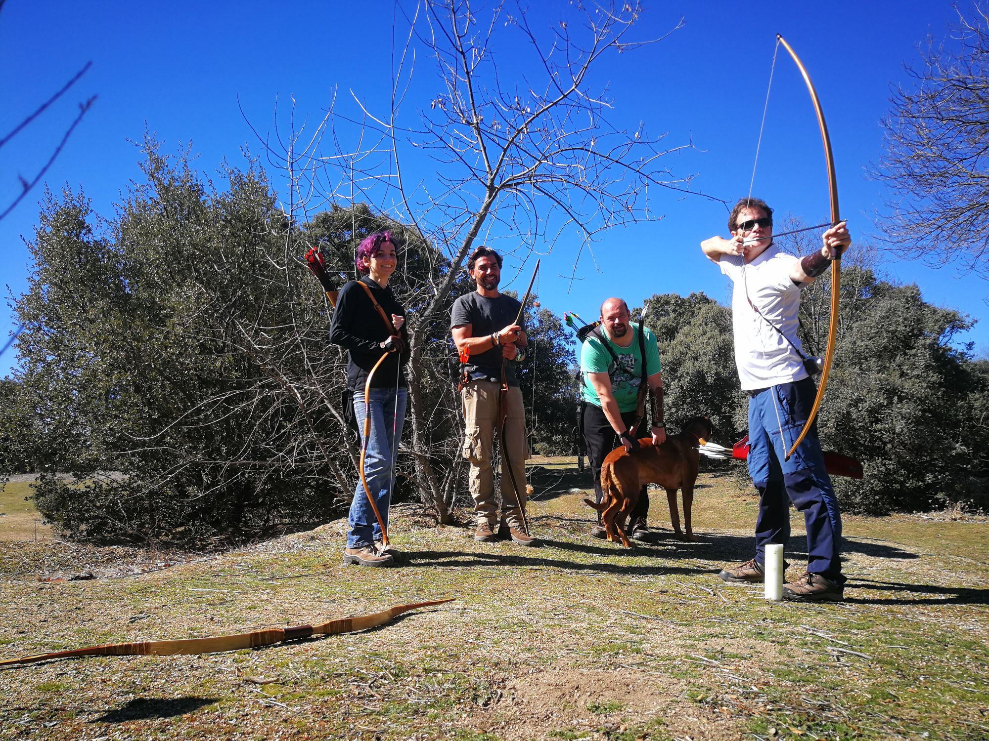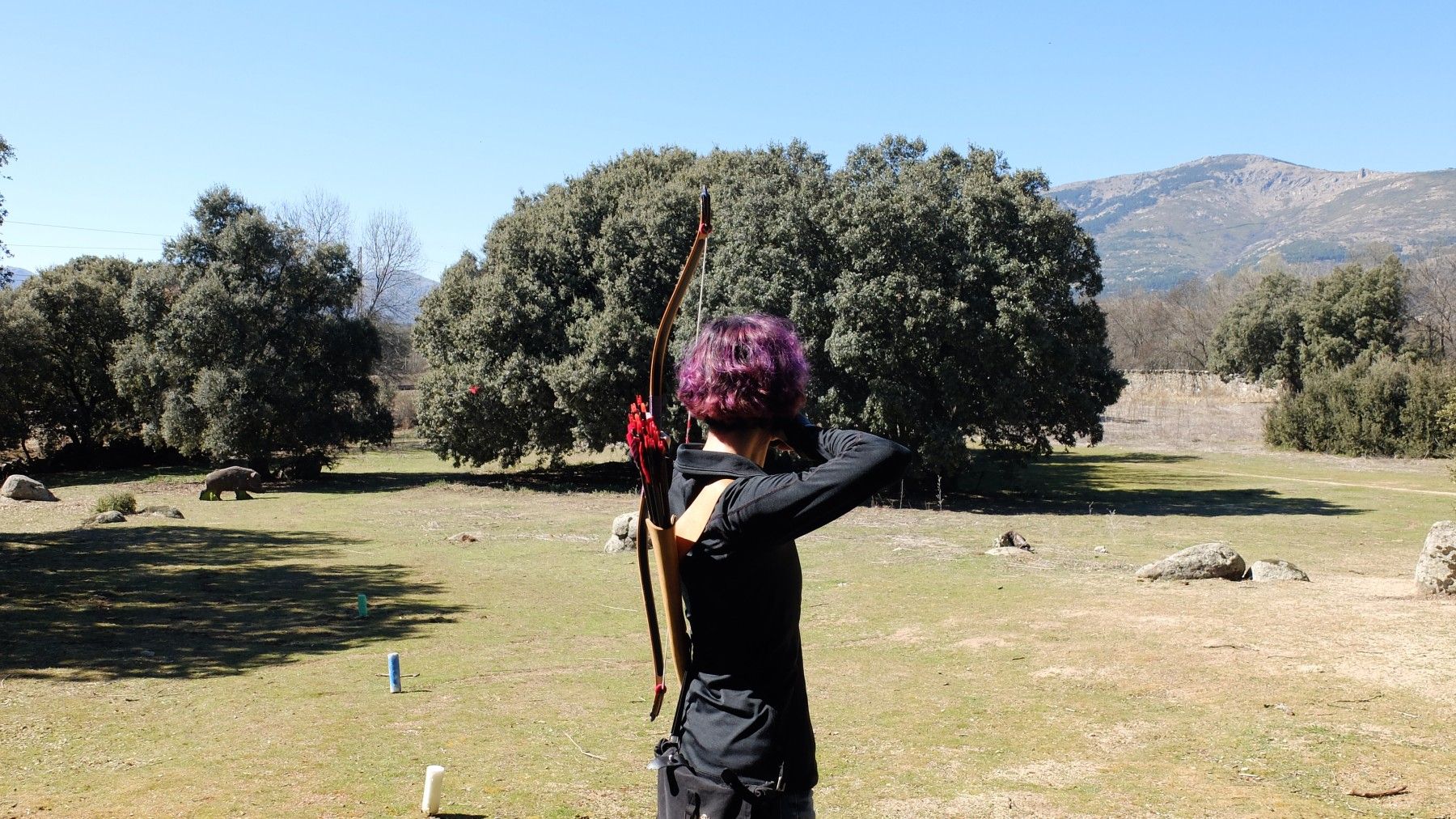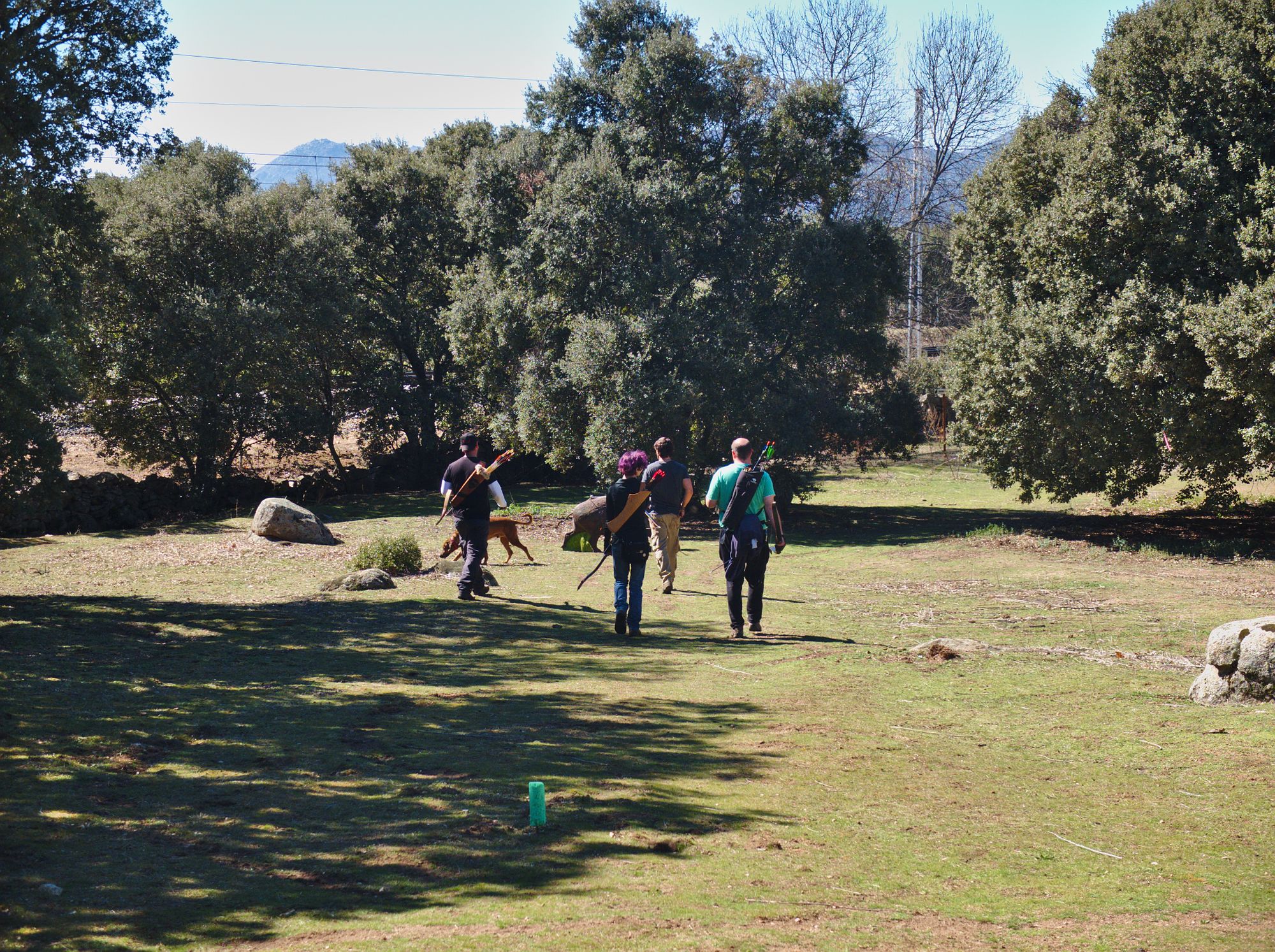 Andros, con su perro Illidan, y su arco de nosecuántas libras que cada vez que impactaba con sus flechas dejaba a la diana en shock, Jorge, con su longbow y flechas de carbono y su elegante aljaba de cinto, Jacobo con arco nómada y canteo característico, Angela con su mirada penetrante más allá de su arco coreano y el que escribe, con el arco más largo y la curva más canónica. Los cinco "y el perro" fuimos avanzando en nuestro recorrido con mayor o menor fortuna con el pico de Abantos de fondo y con cierta sensación de estar casi a nuestro aire, ya que nunca llegamos a adivinar tapón.