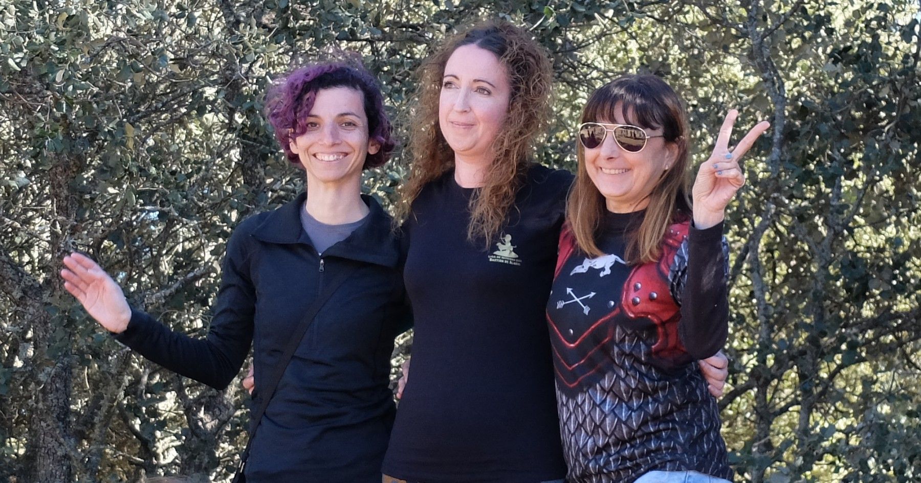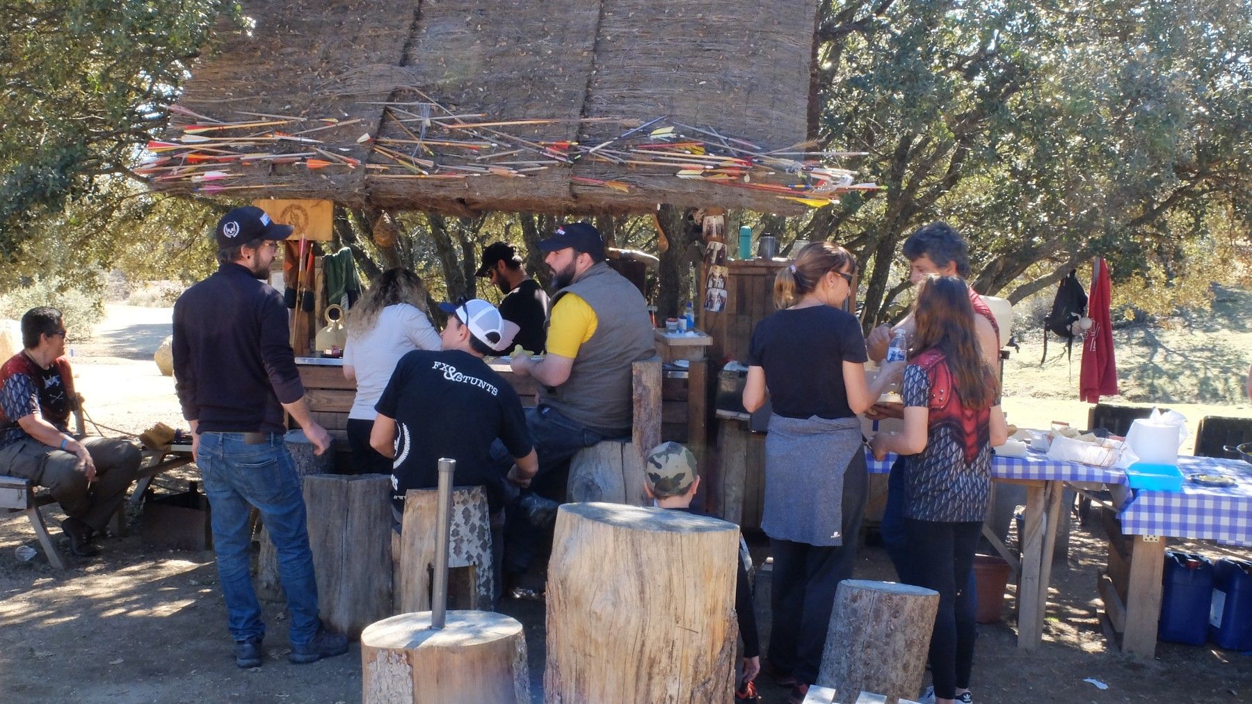 Eran las tres de la tarde cuando aparecimos bien saciados de flechas pero a cambio con el hambre propia que da el paseo por el campo. No tuvimos que esperar mucho para poder degustar un plato colmado de paella hecha in situ y sentarnos con nuestros buenos amigos del club Arcochinillo, Angela, Nurit y Dimas, que se habían acercado desde Segovia para participar también en la tirada. Tras asegurarnos de que podríamos compartir un rato después con Fer Baelo para probar técnicas de pulgar, nos relajamos buscando algo de sombra de las grandes encinas del punto de encuentro convertido en merendero.