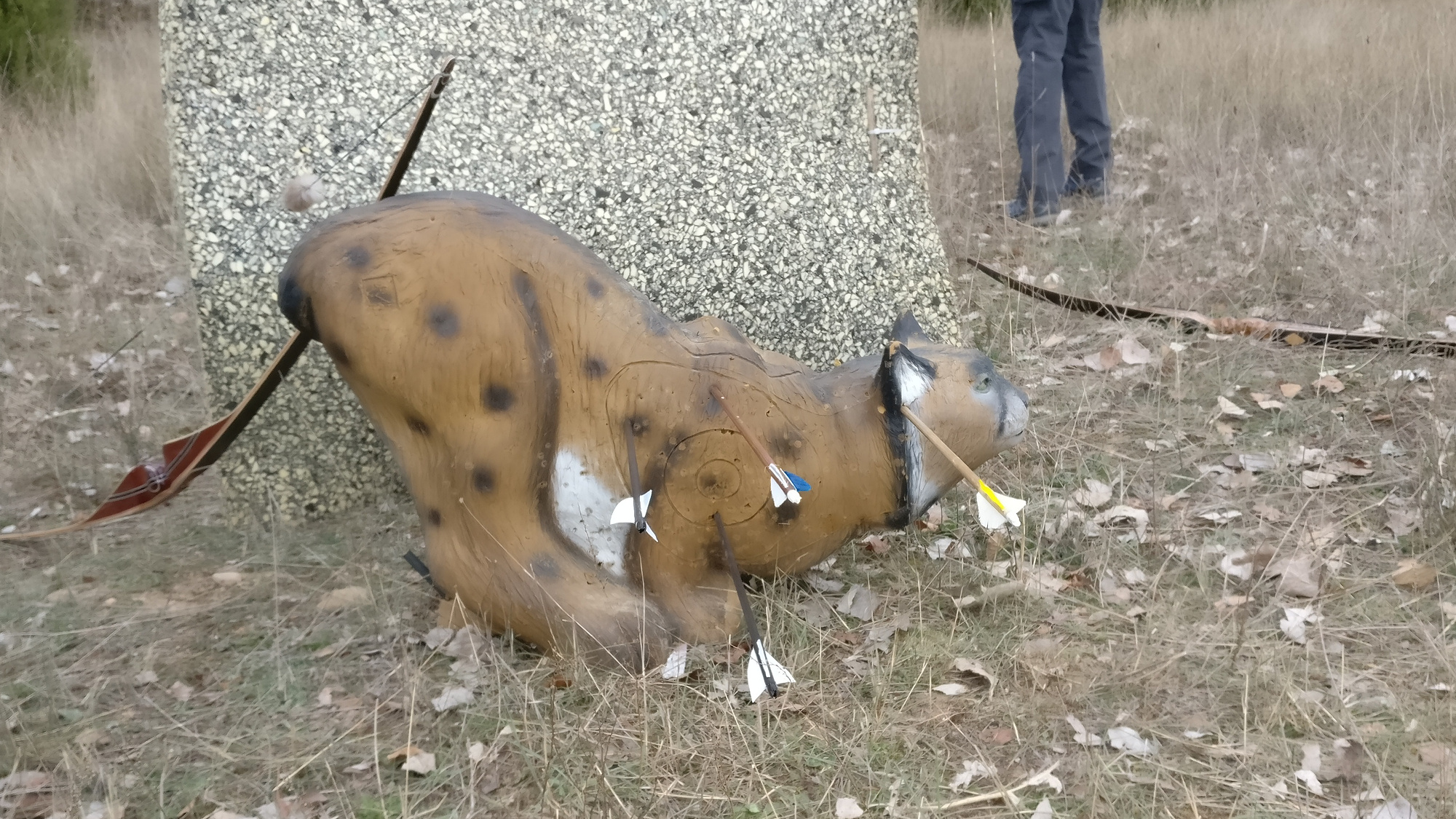 El campo estaba muy bien montado. Los animales estaban muy bien presentados, con tiros en general limpios pero no siempre, lo cual reconozco que me gusta. Más de una flecha se me quedó en las ramas de alguna encina traidora a pocos metros de la diana. No le hago ascos a tirar arrodillado pero lo tenía que haber hecho en más ocasiones ayer. Tuvimos nuestra ración de zorros, lechuzas, corzos, ciervos, osos, cuervos, linces, rebecos, jabalíes, tejones, cabras montesas y hasta un cocodrilo bien hermoso con el que terminamos la jornada.