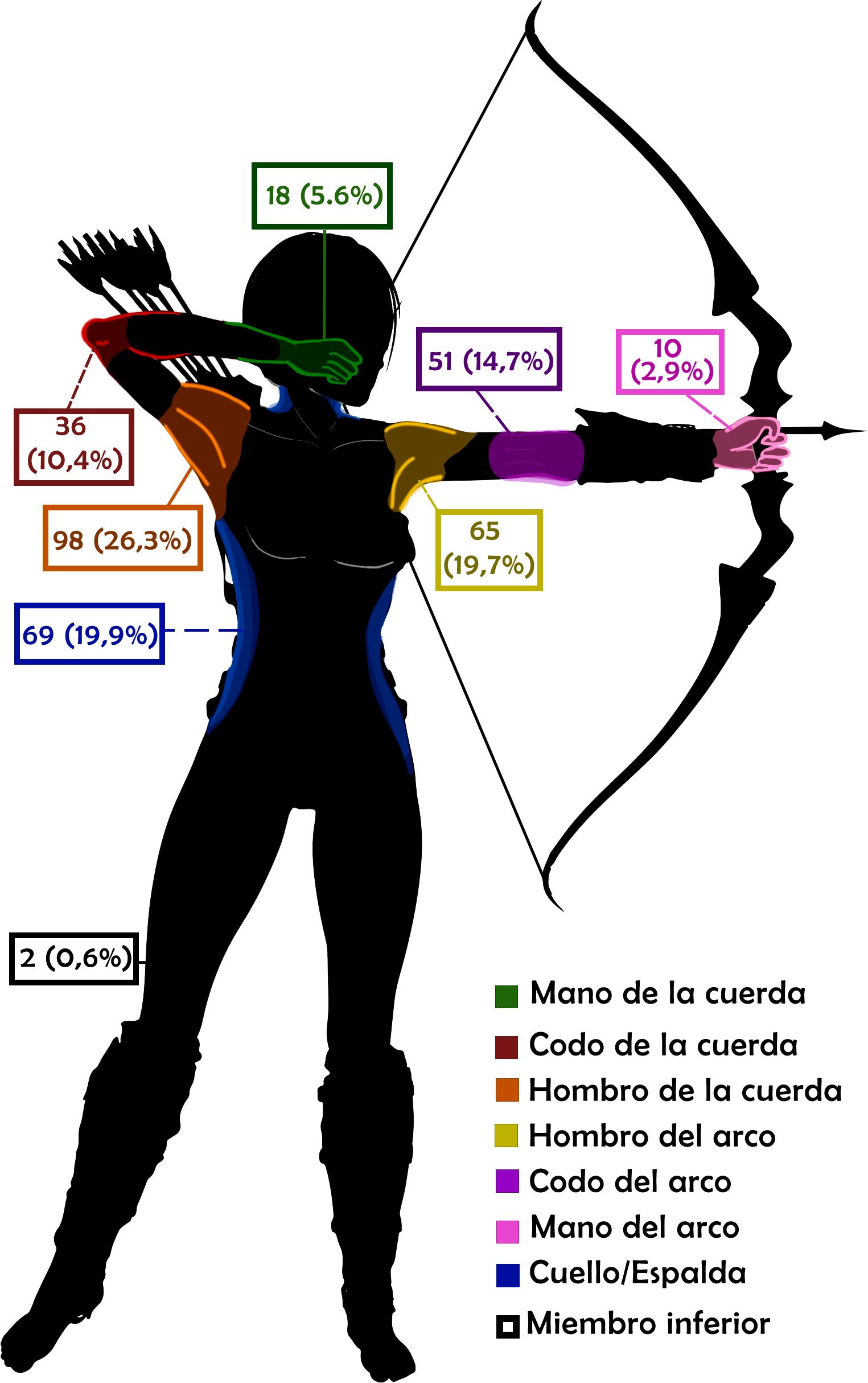 Uno de los objetivos principales de la encuesta era conocer las zonas de dolor o lesión más comunes durante la práctica del tiro con arco. Vamos a ir desmigajando poco a poco los resultados, y mezclándolos con algunos detalles que conocemos de otros estudios.