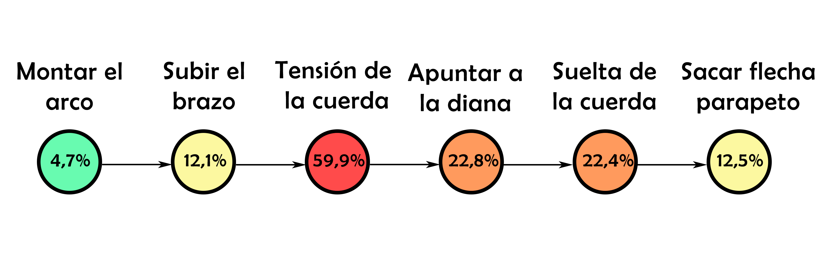 El temblor articular es un signo que todos los arqueros, tanto recién iniciados como profesionales, hemos sentido en nuestros brazos y nos ha molestado sobremanera al acabar de tirar la flecha. Tras la suelta, sabíamos que nos esperaba un paseo para buscar la flecha por el suelo. El temblor se asocia con frecuencia a la fatiga muscular y neural(19), y afecta sin duda al rendimiento final(20). Clásicamente se ha asociado al mantenimiento de una contracción isométrica(3)―característica principal del deporte de tiro con arco, especialmente en las variantes del recurvo―. No obstante, el estudio de S. C. Gandevia desarrolla la interrelación de mecanismos más complejos alrededor de la fatiga muscular, que adjunto en la bibliografía por si es de interés a alguno de los lectores (21). En definitiva, la fatiga no sólo tiene relevancia a nivel muscular sino a nivel del sistema nervioso central y periférico. Considerando que la concentración y un estado mental constante y calmado se consideran factores relevantes en la reproducibilidad de los disparos(22), superar la fatiga y el temblor debieran ser los primeros targets a abordar. En otros posts de este mismo blog se ha hablado de otro signo especialmente preocupante en el rendimiento del arquero: la fiebre del amarillo. Todos estos procesos se ponen de manifiesto en la suelta de la cuerda y en el puntaje final (la suelta no es el problema, es el síntoma).