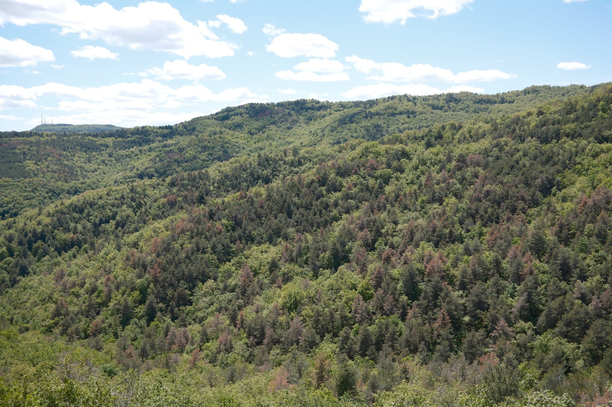Antes de comer hicimos uno de los dos de 3D, con unas vistas impresionantes del valle. El precio a pagar por esas vistas son unas bajadas muy verticales que requieren de todo el celo para no deslizarse pendiente abajo. Estos tiros son una verdaderamente pasada porque es rarísimo ver estas propuestas en otros campos. El entorno en primavera suele estar muy frondoso y, como había llovido la semana anterior, pudimos disfrutar de un sotobosque que recuperaba cierta humedad dentro de una insistente sequía que llevaba asolando la región más de dos años.