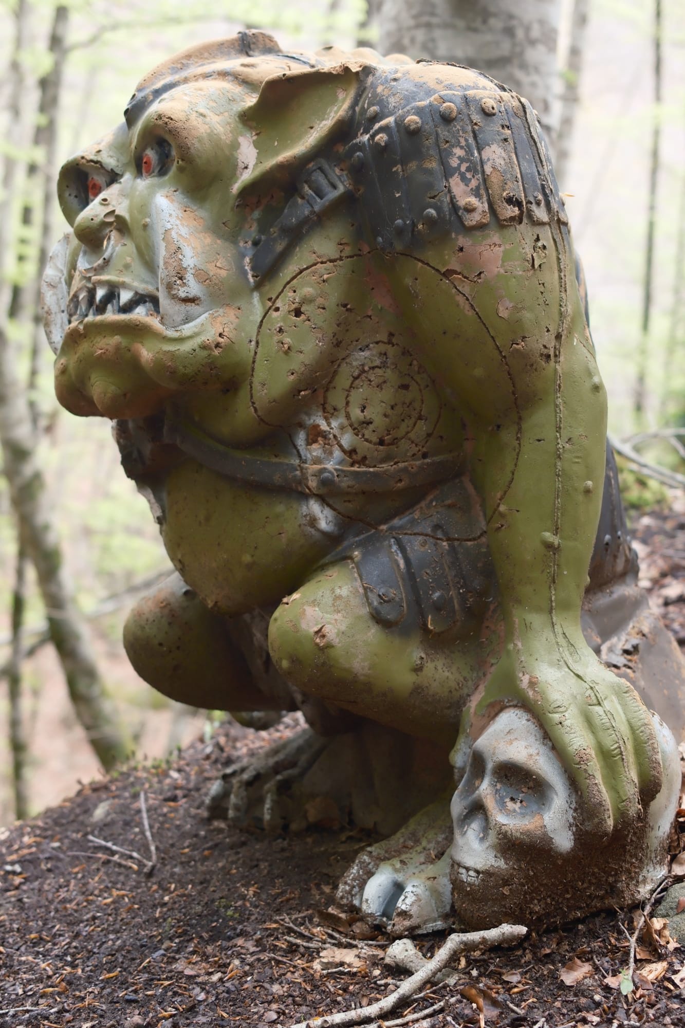 En este hayedo donde apenas se puede ver el cielo por entre las copas de los árboles, hay una recorrido de 24 propuestas muy originales que aprovechan al máximo la orografía del terreno. Tras pagar en un buzón semiescondido a la entrada del recorrido y saludar a la cámara de seguridad que vigila a quienes deciden adentrarse, nos fundimos con paseo que zigzagueaba arriba y abajo durante un par de kilómetros antes de retornar paralelo a la carretera y al Riera de l'Om, que llevaba algo de agua.