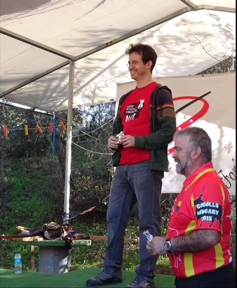 Y bueno ¡resulta que quedé primero en mi categoría Longbow Senior Masculino en IFAA! Era una categoría muy exigua en gente, incluso sumando a la equivalente de RFETA (¡había más en la categoría de Veterano!), pero me fui tan contento con mi primer puesto y mi premio, una preciosa punta de flecha de sílex que al llegar a casa uní a otra de hueso que adquirí durante un curso de iniciación a la fabricación de arcos y las tengo ahora colgando de la travilla del cinto.