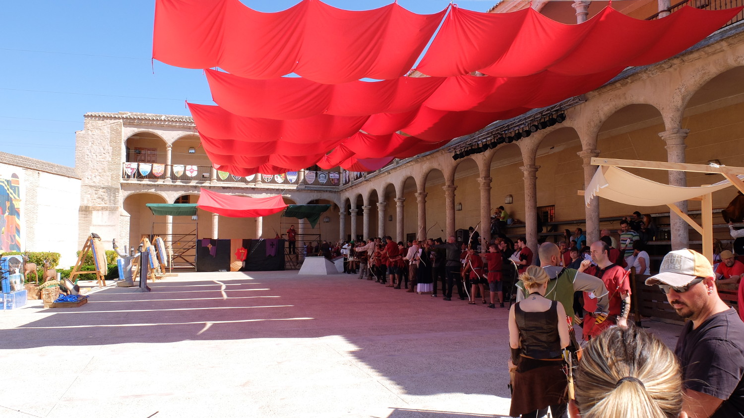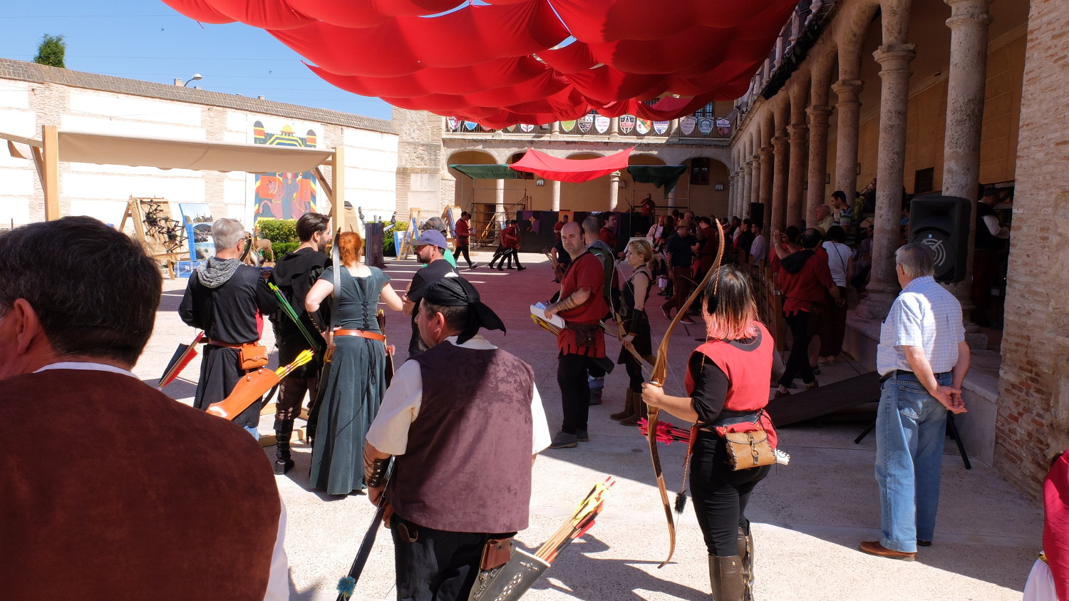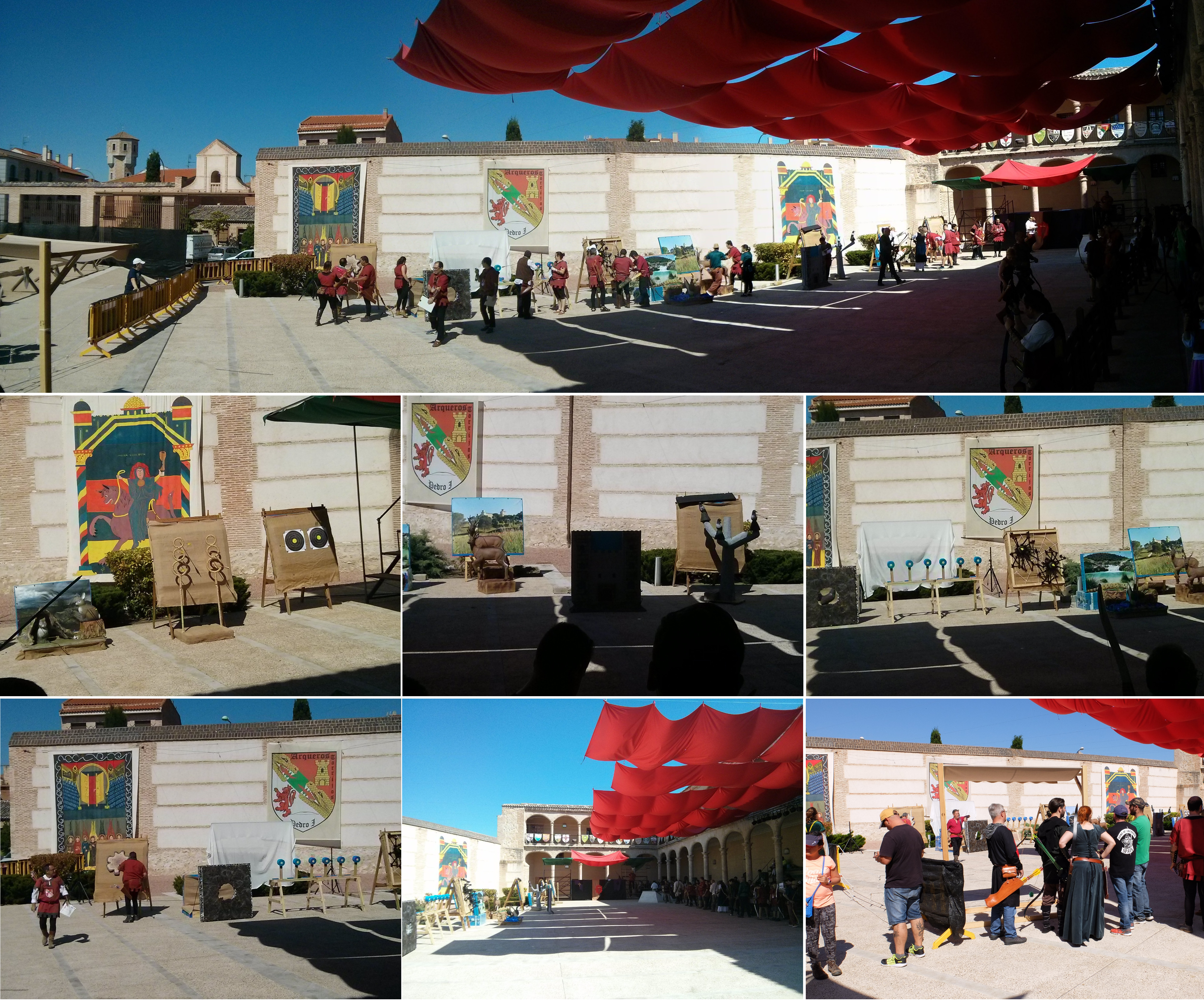 El recinto al aire libre constaba de un patio muy amplio, con gradas cubiertas tras unas columnas y muros altísimos tras las dianas adornados por banderas y estandartes enormes. Nos habíamos juntado unos 120 arqueros de todo tipo y estábamos ansiosos por calentar y empezar el recorrido de 12 dianas ¡todas diferentes! que el club Arqueros de Pedro I había preparado.