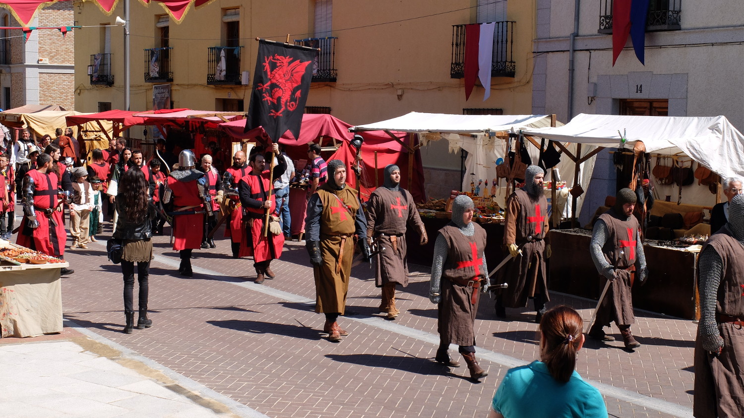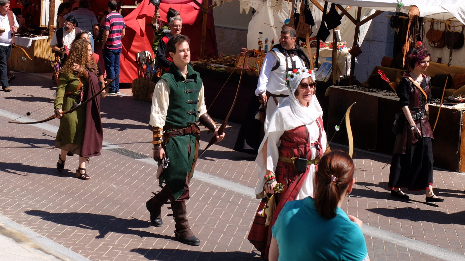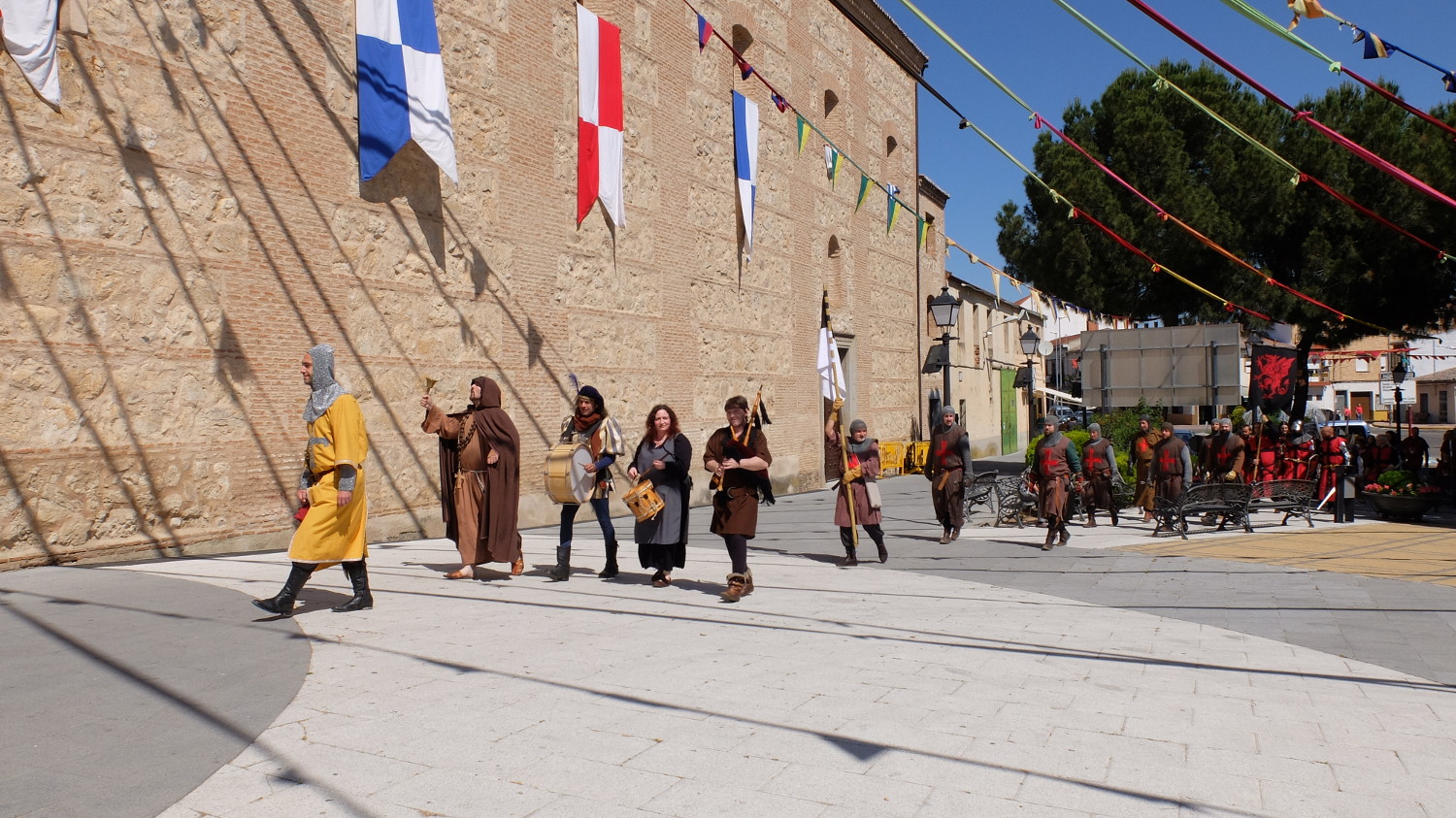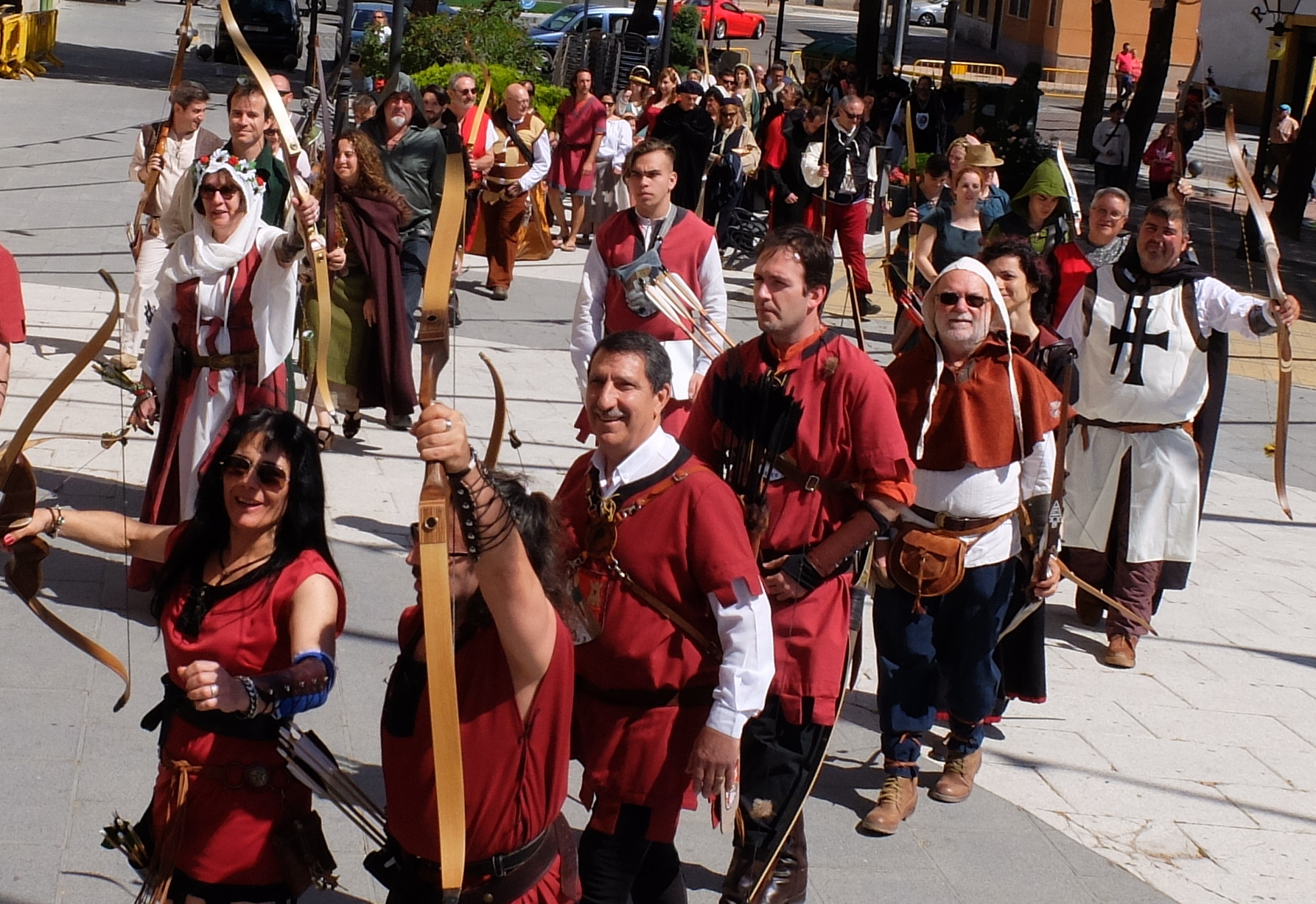 *Vídeo de la última diana. Angela y yo tirando con buena técnica a los bordes para incomprensión de nuestros amigos que no conocían la dinámica :)*Tras nuestro paso por el recorrido firmamos nuestras hojas de puntuación y nos fuimos a pedir agua justo antes de que empezara el desfile de caballeros y arqueros por el casco antiguo de Torrijos. Nos dispusieron en fila de a dos e íbamos marchando por las calles y respondiendo con gritos y nuestros arcos en alto a la llamada de "¡Arqueros!" de cualquier compañero. Fue un desfile divertido, no muy largo y nos dio la oportunidad de cambiar de aires.