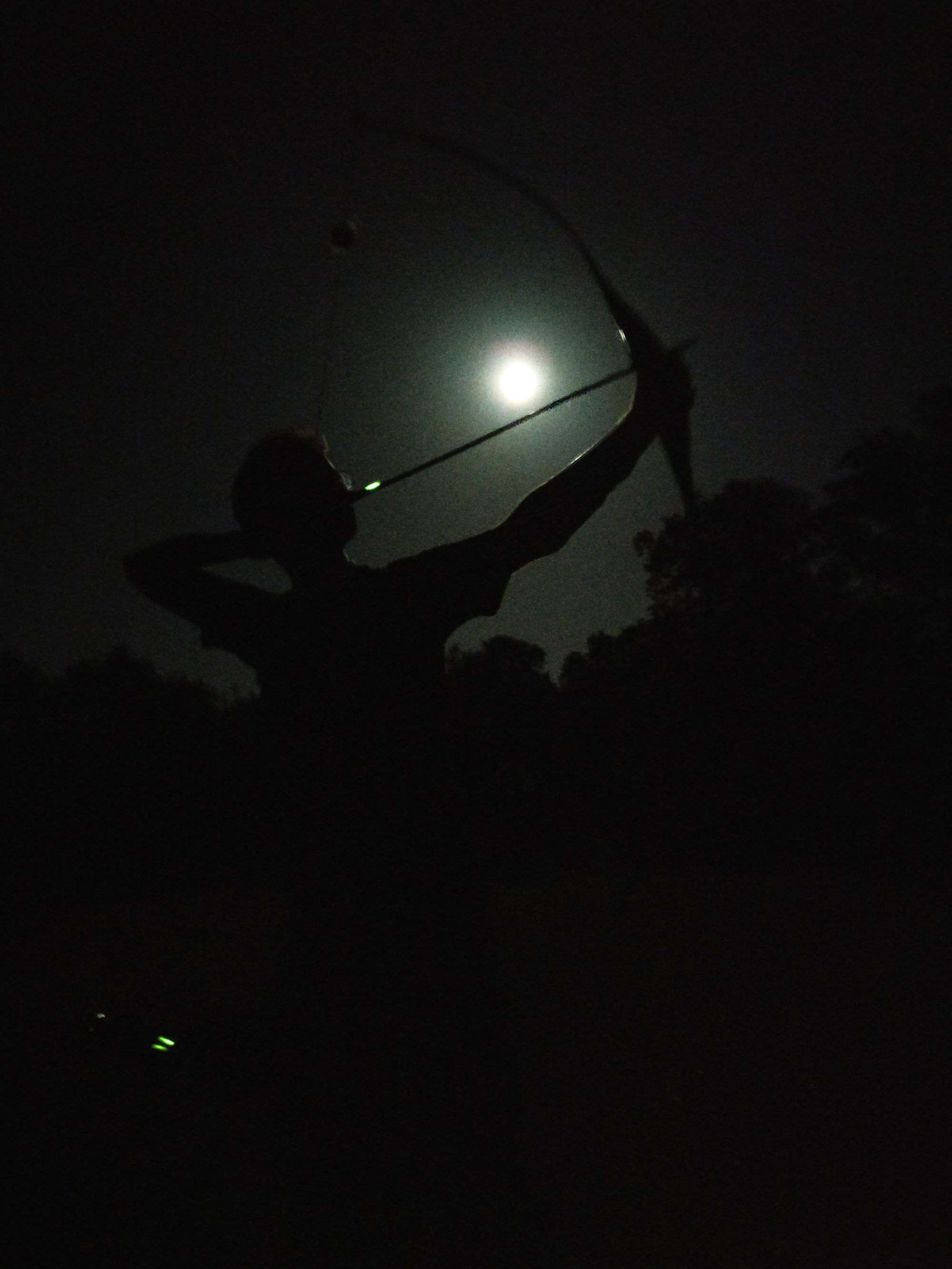 - La luz disponible puede ser desde ninguna en absoluto (tras una iluminación breve para tratar de recordar dónde está la diana), pasando por muy suave (estilo luz de luna), media o muy intensa. Esto último puede provenir de alguien sujetando el frontal a un lado de la persona que tira o colocándolo cerca de la propia diana creando una especie de diorama. Rara vez conviene que sea la persona que tira la que lleve el frontal ya que pega directamente en el arco y deslumbra muchísimo, en todo caso, lo dejaría en el suelo a su lado.