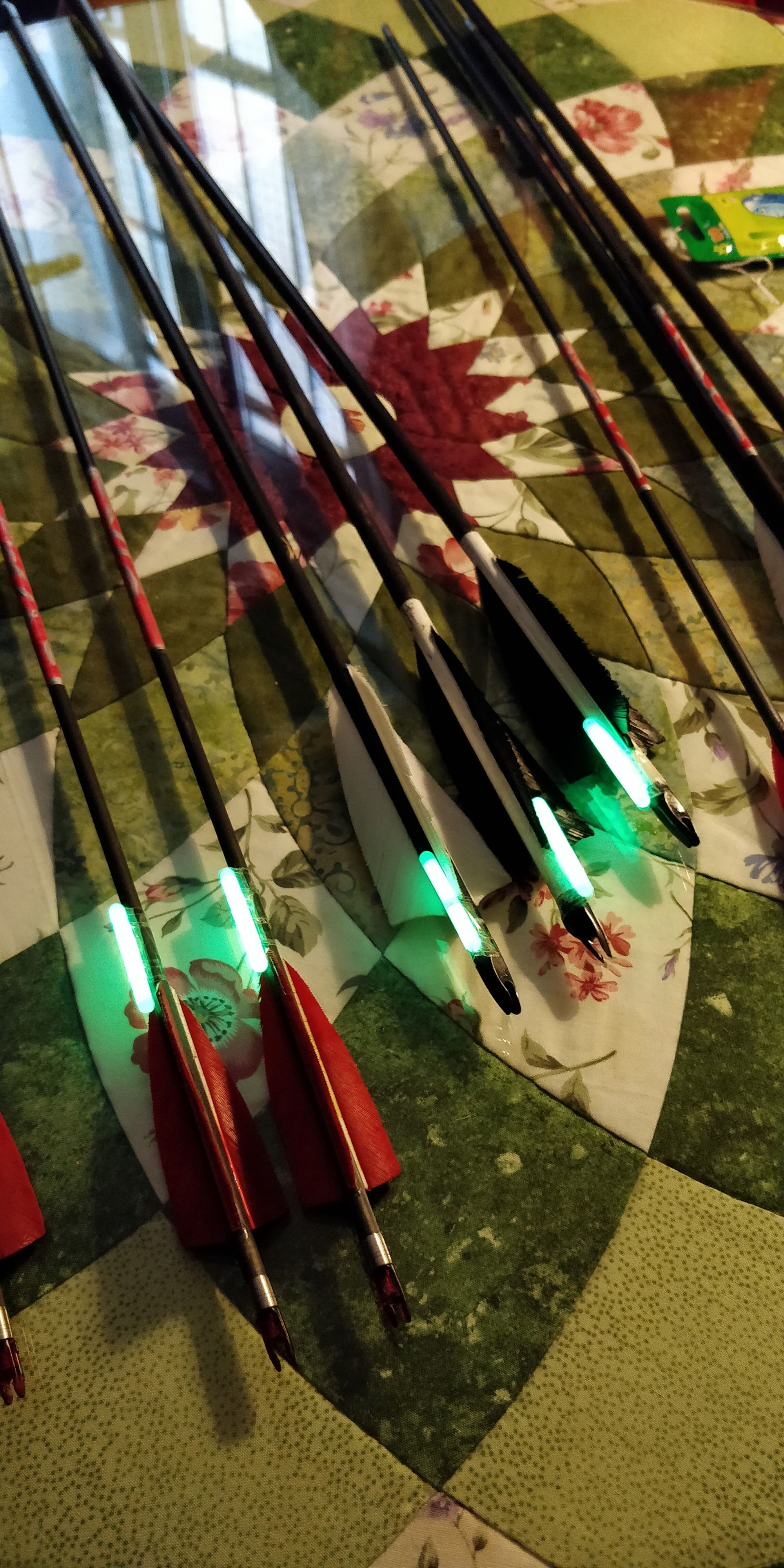 - Bastones luminosos usados en pesca. Se trata de luz química en unos pequeños tubitos que rondan los 4.5mm de diámetro y los 4cm de largo. Es luz blanca-verdosa y una vez que se activan, duran unas 24h, por lo que podrían servir para dos salidas nocturnas consecutivas. Simplemente se adhieren al vástago cerca del culatín con celo. Es una opción barata y sencilla y apenas afecta a la precisión o las características de la flecha.