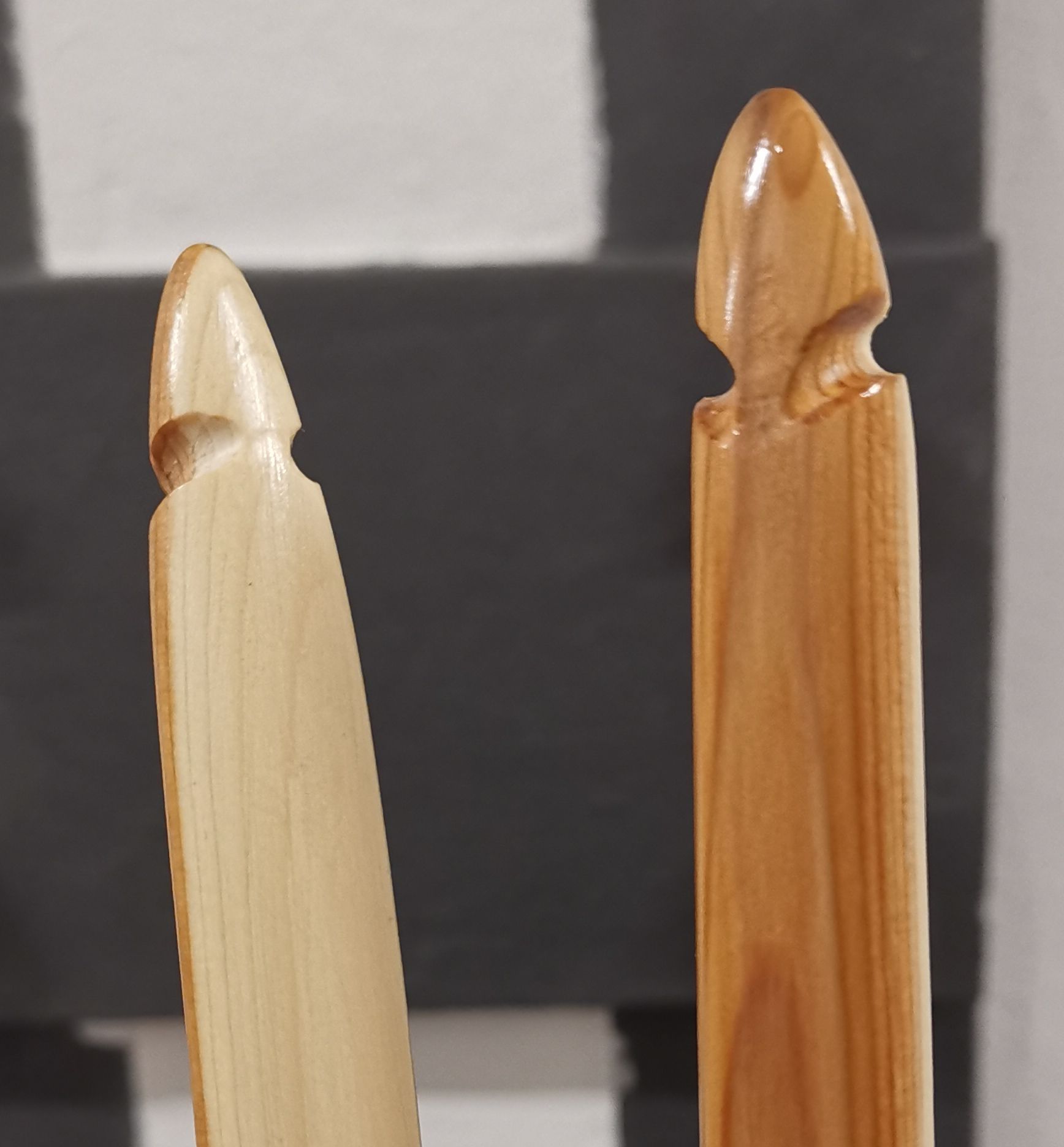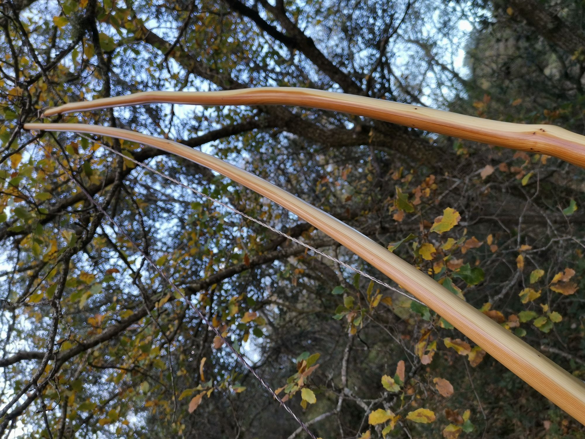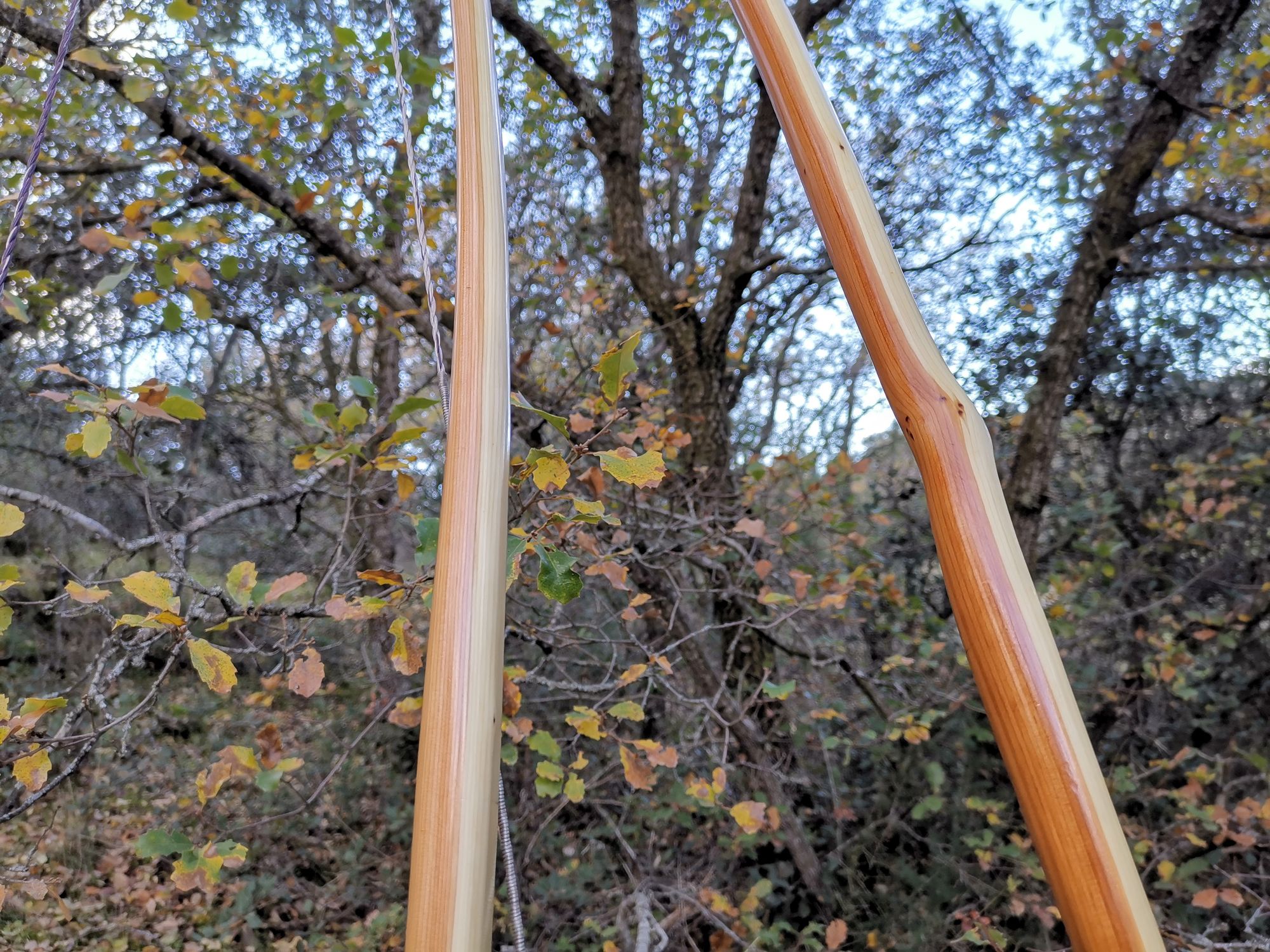Ambos arcos tienen un acabado impecable. Miden entre 165 y 170cm y tienen un grosor respectivo perfecto para nuestras manos. El de Angela presenta un perfil con muchísima personalidad y el contraste entre el duramen y la albura es muy evidente. Desde el punto de vista estético, es el más bonito de los dos. El mío es la versión recta, simple, elegante, muy equilibrado y muy con forma de arco. Aquí y allá presenta pequeños nudos en la madera pero casi como si fueran "pecas" mientras que en el de Angela son lunares bien grandes :D