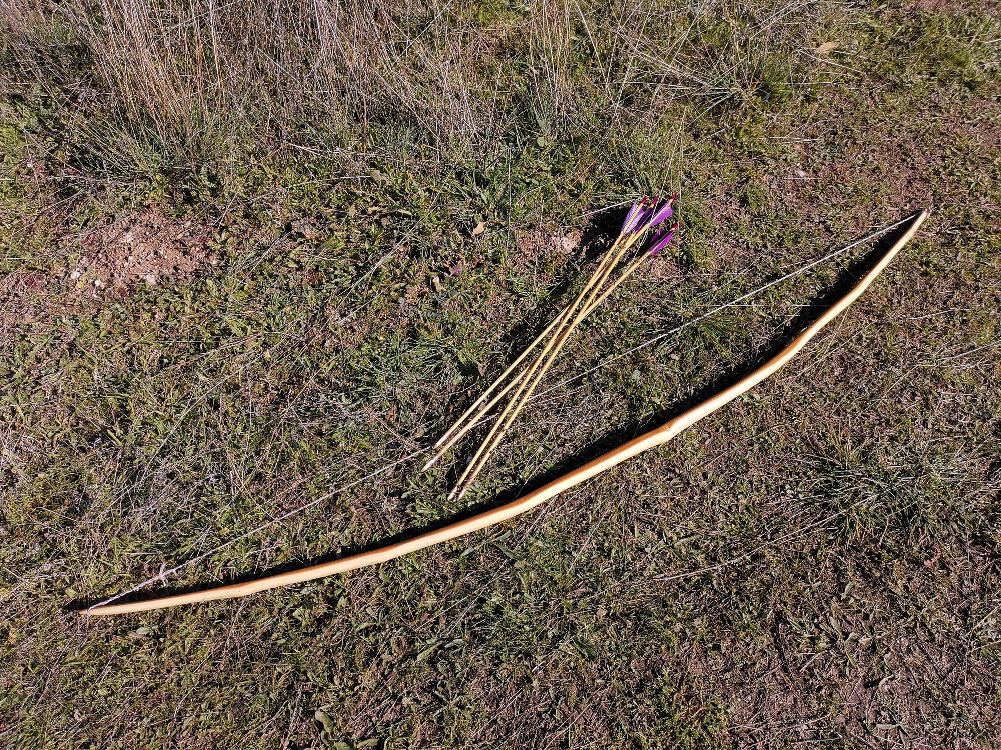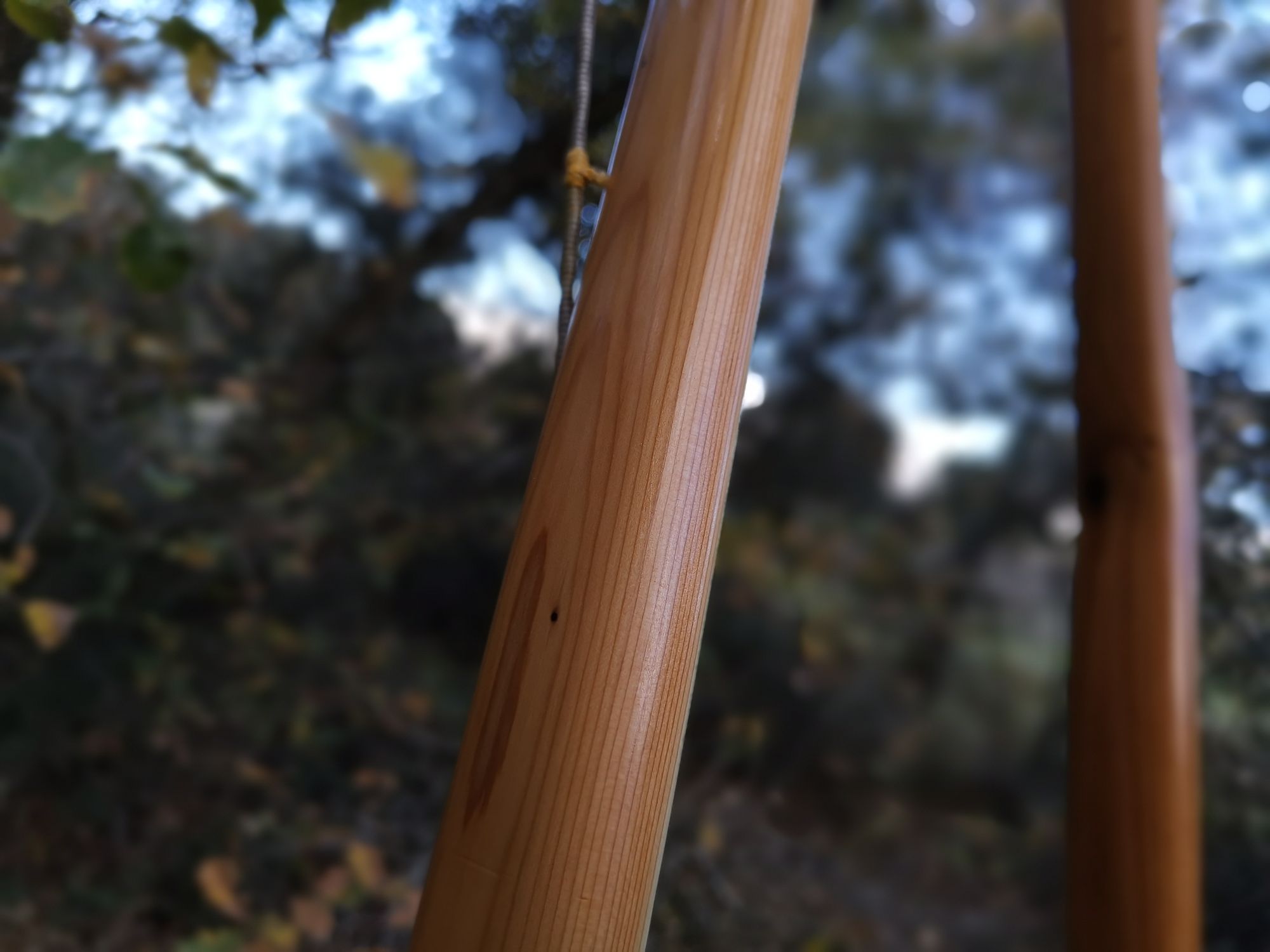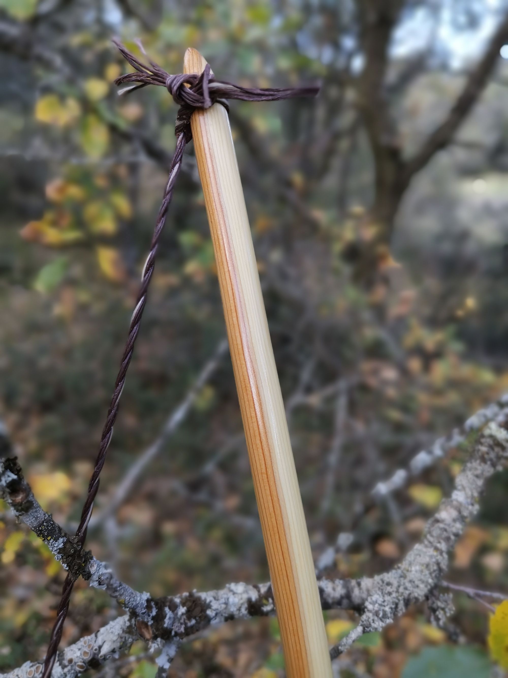 Ambos arcos tienen un acabado impecable. Miden entre 165 y 170cm y tienen un grosor respectivo perfecto para nuestras manos. El de Angela presenta un perfil con muchísima personalidad y el contraste entre el duramen y la albura es muy evidente. Desde el punto de vista estético, es el más bonito de los dos. El mío es la versión recta, simple, elegante, muy equilibrado y muy con forma de arco. Aquí y allá presenta pequeños nudos en la madera pero casi como si fueran "pecas" mientras que en el de Angela son lunares bien grandes :D