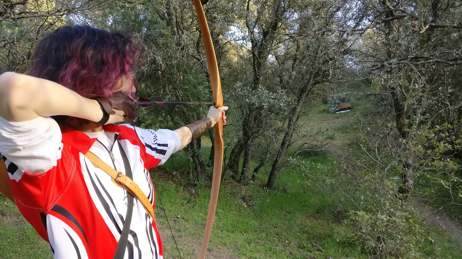 Hace ya tiempo que hago el recorrido fijo sin anotar puntos. Me di cuenta de que todo era demasiado mecánico, cada diana un trámite. En lugar de analizar cada flecha, solo veía su puntuación. Así que hace unos meses opté por no anotar la puntuación salvo en ocasiones en los que ése fuera el objetivo. Así también me permito idear tiros fuera de la piqueta azul. Me voy a la roja, o a algún lugar intermedio, dándome igual la puntuación, solo buscando disfrutar de cada tiro. Cuando me planteo un recorrido de puntuación entonces suelo ser menos flexible y busco más la piqueta azul. El caso es que este sábado se nos dio bastante bien a Angela y a mí. Ella quería probar su segundo arco Slick Stick (de segunda mano, para viajes en avión) y flechas de madera (ella tira siempre con carbono) y yo quería simular un recorrido WA.
